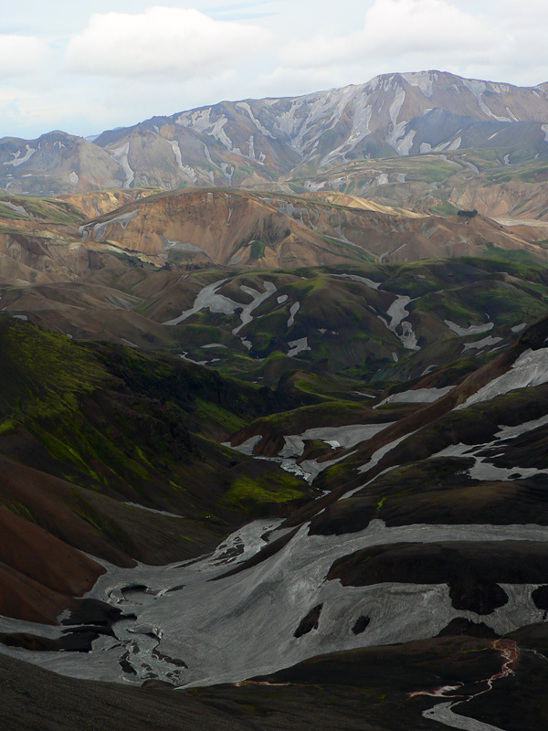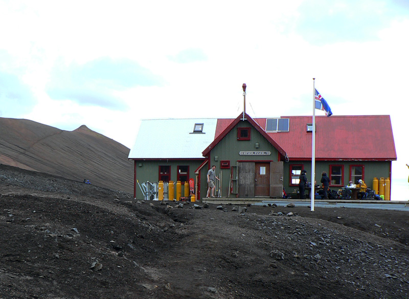 Túto chatu spravuje Ferðafélag Íslands (www.fi.is). Na trase treku Laugavegur je najvyššie položená (1027m), najhoršie prístupná pre servis (zásobovanie, opravy), ale zato poriadne vyhriata po celý rok! Aj keď chatár je tam len v júli a auguste. V dolinke pod chatou syčí termálny prameň a trubky odtiaľ sú natiahnuté v izbách popod stropy, asi aby vykúrili aj povalu :-) Na horných palandách bolo v noci riadne horúco, napriek otvoreným oknám. A dobre že vietor fúkal od chaty k prameňu a nie naopak :-) Kapacita? Vraj 52 ľudí, už si zvykáme – na prízemí poschodové postele (dolu vždy dvaja, hore jeden), v podkroví matrace. Čiže v kuchynke tlačenica, v umyvárňach ešte väčšia, sprchy tu nie sú a záchody len suché. Lebo je tu málo vody – tej studenej :-) A v pokynoch stojí dôrazná prosba nehádzať odpadky do záchoda, ale odniesť si ich so sebou. K obom najbližším chatám (Landmannalaugar a Áftavatn) je to zhodne asi 12km, takže žiadna tragédia. Ďalšie pokyny hovoria, že keď nie je prítomný chatár, poplatok za pobyt treba dať do schránky v predsieni :-) A slušné je pozametať po sebe. Vravím – iný kraj, iný mrav... Aj tu sa stanuje vo veľkom, len je problém zabiť stanové kolíky do piesku, preto ako kotvy slúžia obsidiánové balvany. Aj ako zásteny proti vetru. Kempovacie miesta sú pod chatou pekne rozložené okolo latríny :-)