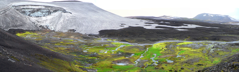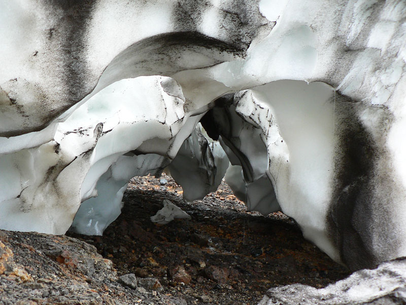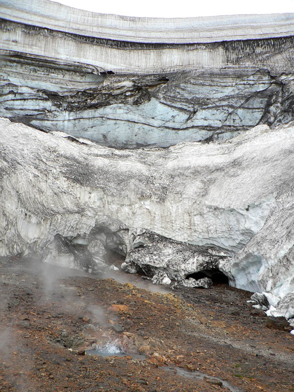 Po návrate na chatu niektorých hyperaktívnych ešte mrle žerú :-) Takže nasleduje výlet druhým smerom od chaty. Za kopcom je malý ľadovec a na jeho úpätí vyvierajú horúce pramene. Tie odspodu roztápajú ľad – výsledkom je obrovská jaskyňa. Teda bola, lebo už sa zrútila, ale aj v tých zvyškoch sú tunely a jaskynky, ľadové stĺpy a všelijaké iné výsledky „boja“ ľadu s ohňom. Diery v skalách zlostne pľujú horúcu vodu, všade syčí para a samozrejme smrdí síra. Pohľad na vrstvy ľadovca pripomína mramor, pod tým všetkým krikľavá zeleň machu. To sa nedá popísať ani odfotiť, to jednoducho treba vidieť!