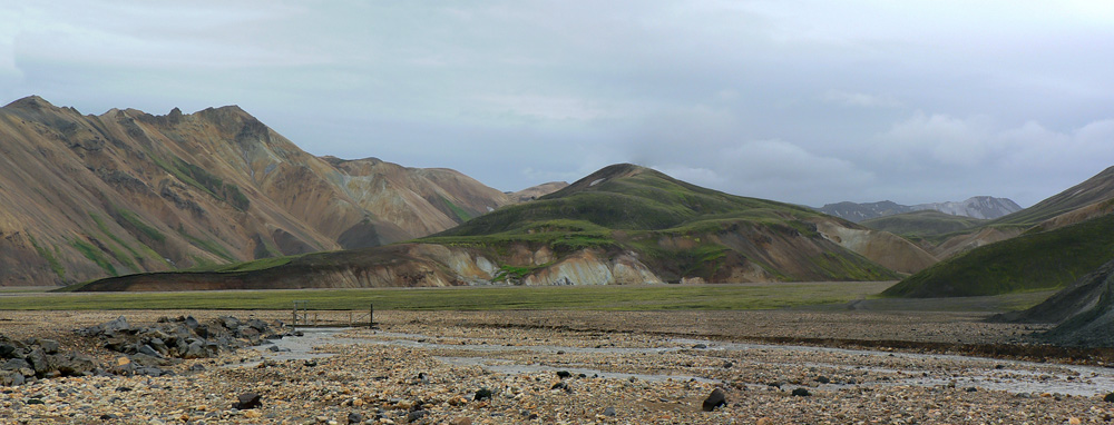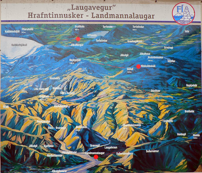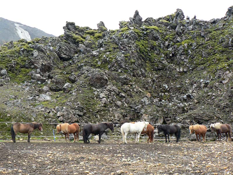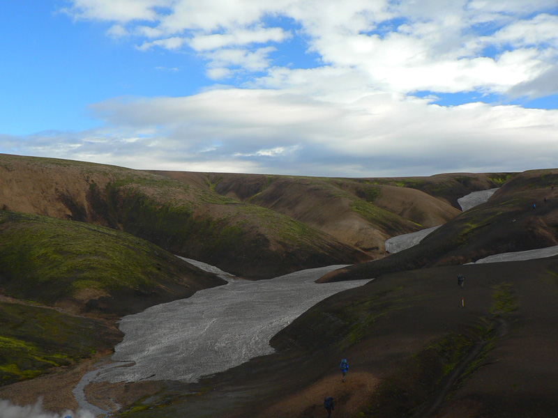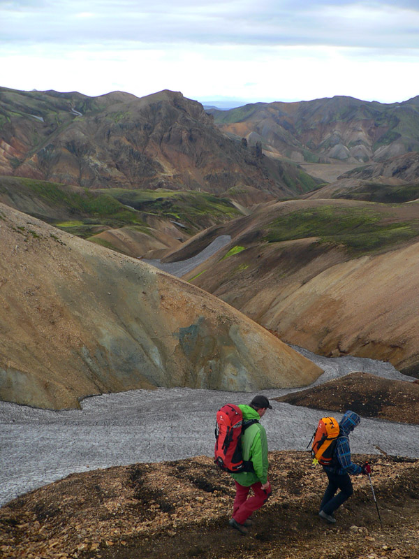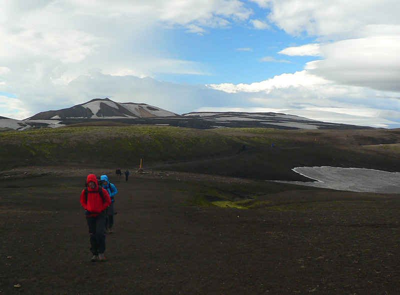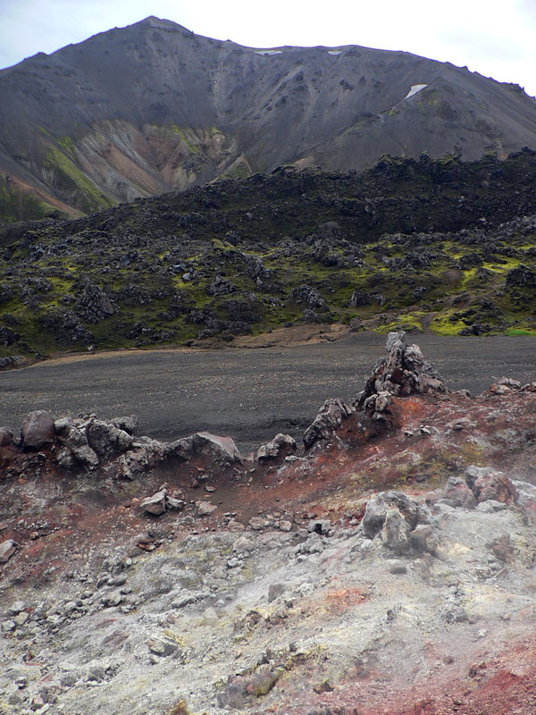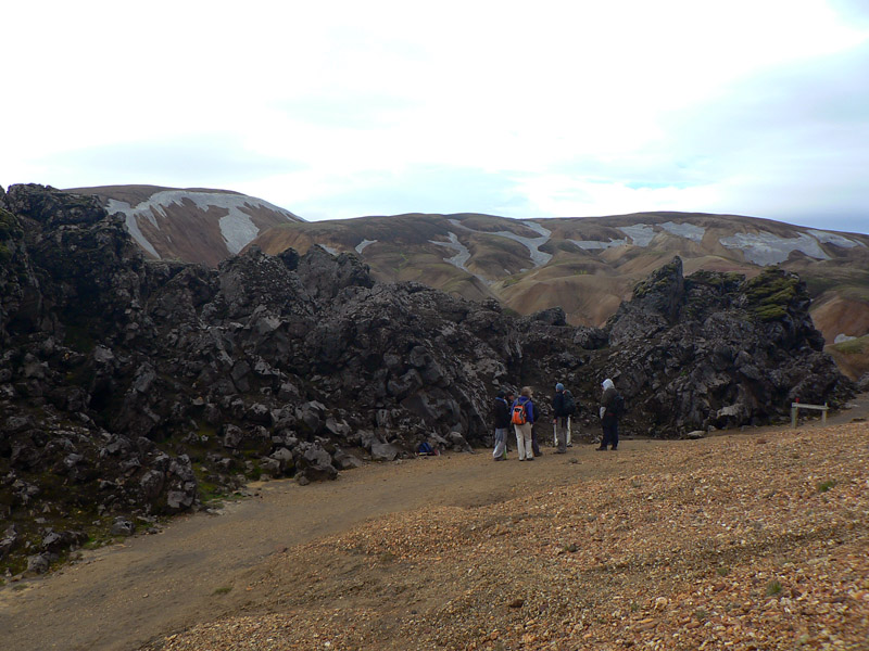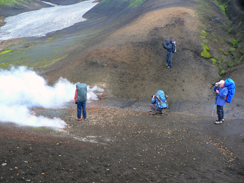 Takže Landmannalaugar pred nami, ale nevyzerá to dolu príliš civilizované, len nejaká cesta na horizonte a pár áut pri rieke vidno. A davy naľahko vystrojených výletníkov oproti nám. Ale kde je celý ten „base camp“ a tá reštaurácia v autobuse, na ktorú sa už niektorí tešia piaty deň? :-) Dozvieme sa o nejakú hodinku. Najprv musíme preštrikovať cez to obrovské lávovisko a zbehnúť na jeho južný okraj k potoku s krkolomným názvom Brennisteinsöldukvísl. Keď spolu s ním vojdeme do hlavnej doliny rieky Jökulgilskvísl, až vtedy zbadáme „základňu“, skrytú doteraz pred čelom lávového prúdu. Znamená to teda, že sme všetci v zdraví dorazili na koniec vraj jedného z najkrajších trekov našej planéty (podľa istej knihy), aj keď je to samozrejme názor veľmi subjektívny. Ale zato dobrý marketingový ťah. Pre väčšinu z nás však končí len pochodovanie s ťažkým báglom, veď deň je iba v polovici a hustá sieť miestnych chodníkov láka. O tom ale nabudúce.
