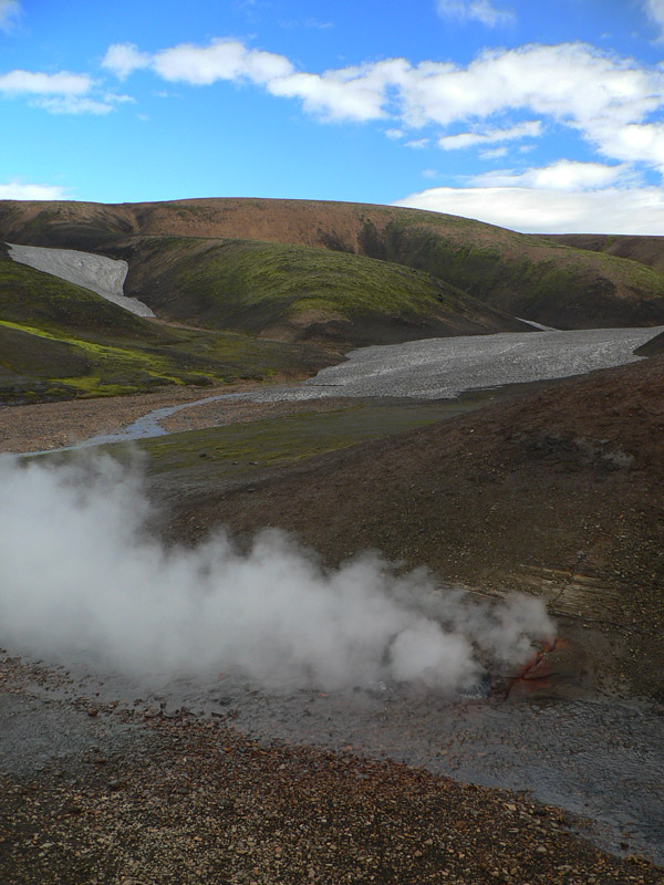 Z čiernej plošiny plynulo klesáme do zníženiny, ktorú už z diaľky označujú početné oblaky pary z fumarolov a horúcich prameňov. Jeden z nich, priamo pri chodníku, fotogenicky prská, syčí a fučí. Neďaleko je zas horúce, bublajúce a do okrova zafarbené jazierko Storihver. Aj jeho brehy hrajú všemožnými farbami, ale ani prst by som do tej vody nestrčil :-)