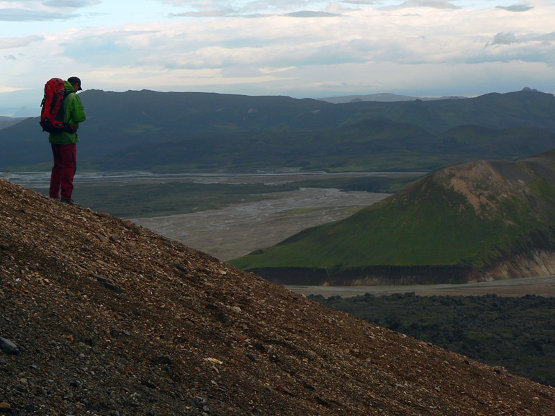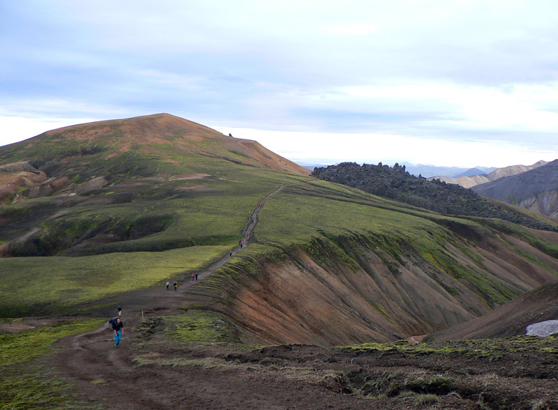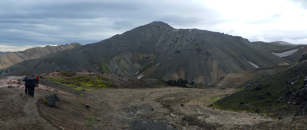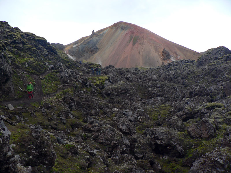 Chodník vedie priamo pomedzi, aby sa po pár metroch zlomil do prudkého klesania. Tu sa nám otvára prvý pohľad na Landmannalaugar - a je poriadne dramatický! Vpravo sa týči vraj najnavštevovanejší islandský vrchol, sivo-čierny Bláhnúkur. Vľavo farebné svahy Brennisteinsaldy. A priamo pod nami je dramaticky hrboľaté, zeleno-čierne lávové pole Laugahraun, na ktorom takto zhora perfektne vidieť odkiaľ, ako a kam sa posúvalo a kde sa zastavilo (v 15. storočí). Z troch strán je ohradené riekami, na tej štvrtej, odkiaľ sa láva tlačila zo zeme von, stojíme my. Úžasný pohľad: