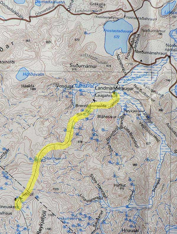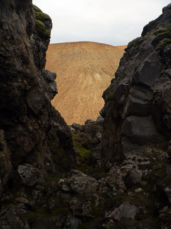 Začíname viac klesať, terén začína byť viac „rozrezaný“, dolinky nadobúdajú ostrejší profil a na kopcoch pred nami je čoraz viac strží. Je to však stále taká, hmmm – guľatá krajinka. Zrazu ale oči zaujme niečo, čo sa do nej akosi „nehodí“ – na zelenom (guľatom :-) svahu pred nami je akoby umelo nalepená čierna naježená hrča. Podľa smeru chodníka si ju obzrieme pekne zblízka, supeeer! A zblízka je to také isté „supeeer“ ako z diaľky. Hustá láva si tu, na východnom svahu kopca Brennisteinsalda, len tak stuhla a vytvorila celé skalné mesto, priam bludisko dier, okien a veží. Ideálne miestečko na krátke posedenie v závetrí, každý si tu nájde svoj kút. A perfektný kontrast s hladkým suťovým svahom „materského“ kopca: