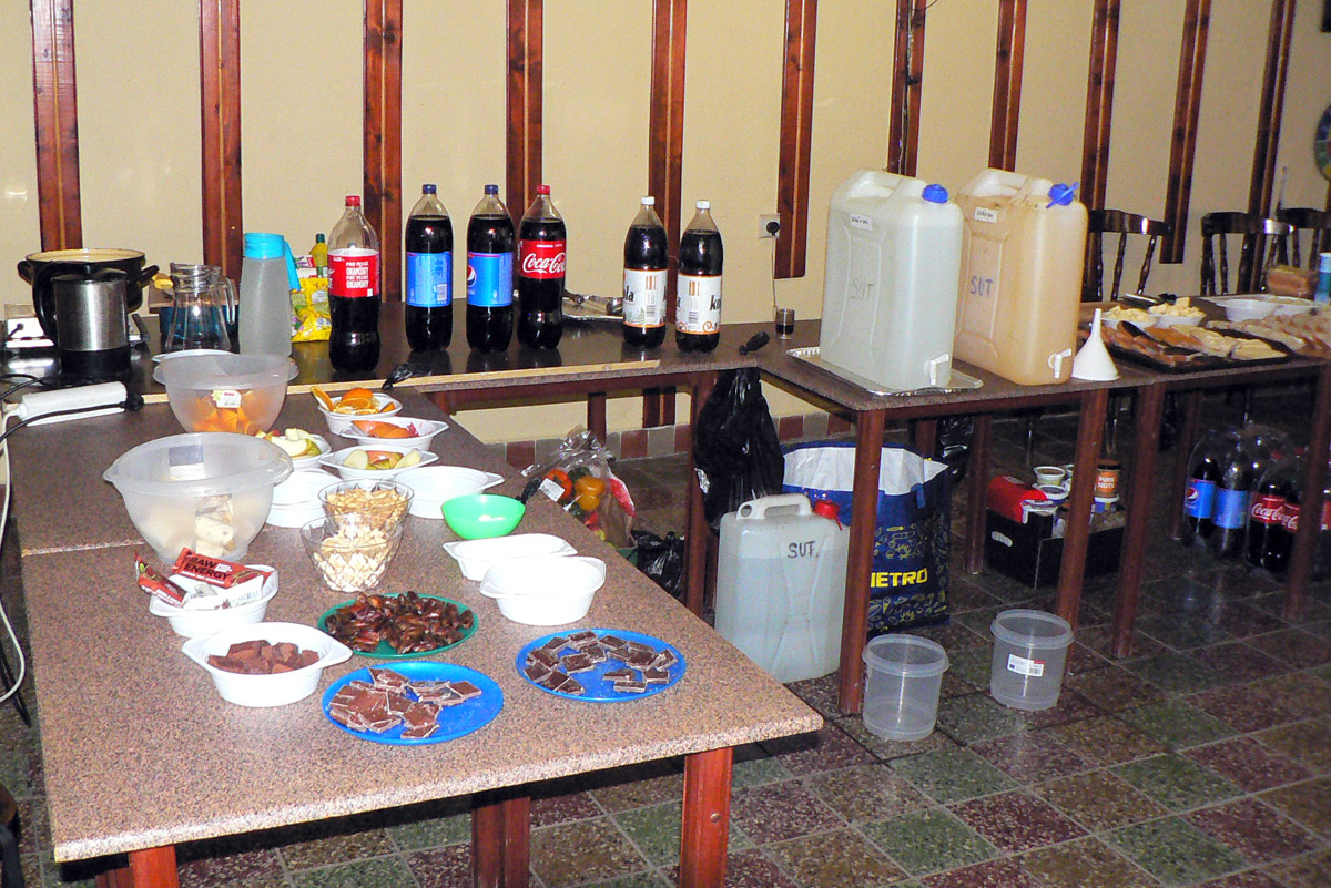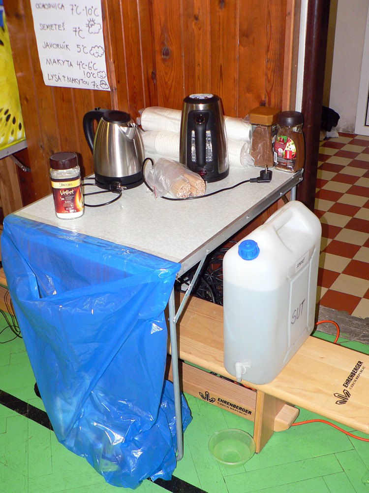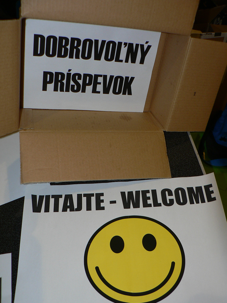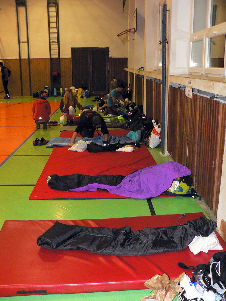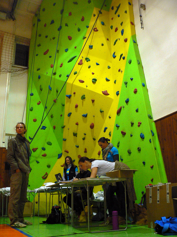 Prezentácia pod lezeckou stenou: povinná kontrola povinného výstroja, nepovinný príspevok na nocľah. Parádne tričká, škoda že mám takých doma poriadny stoh, nechcem, ďakujem. Predpoveď na zajtra je optimistická: počasie bude, sneh nie. Ale bude to apríl: prehánky a teplota okolo päťky. Na behanie super.