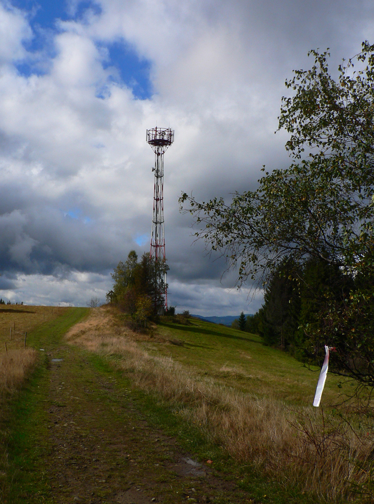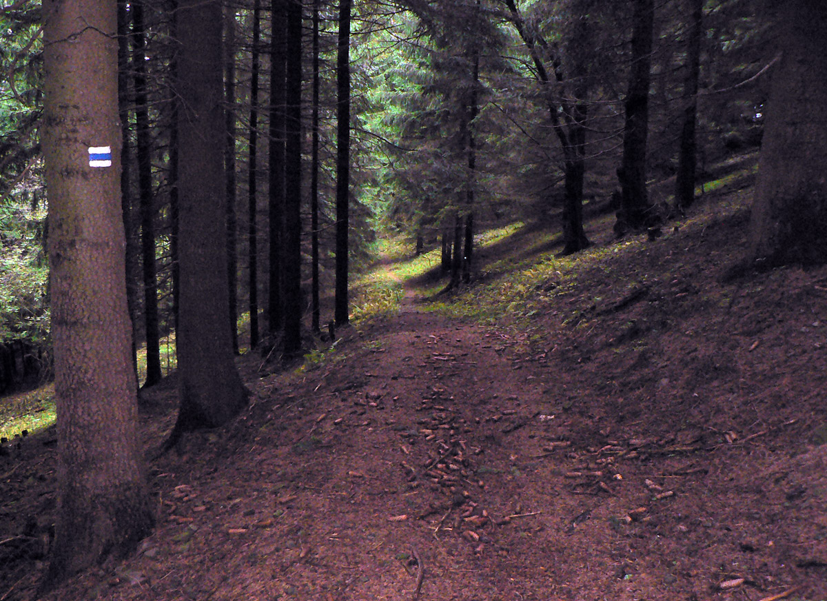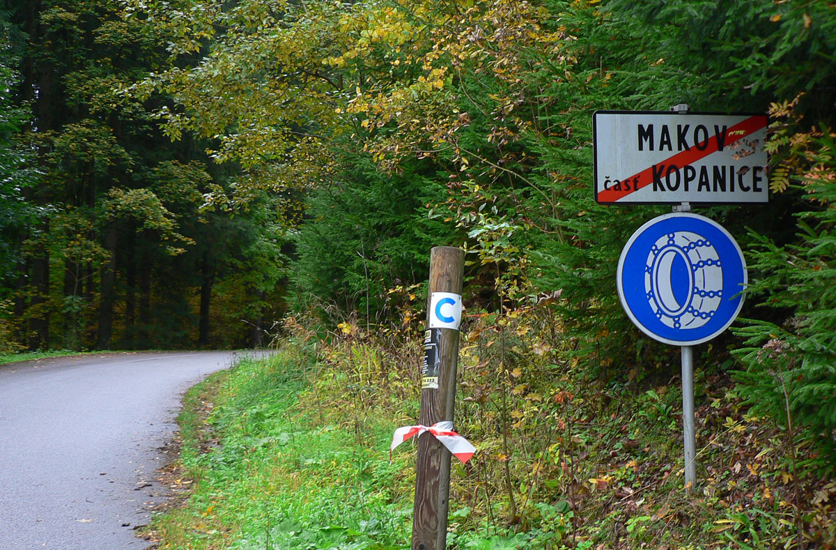 Ale ešte posledná zachádzka do doliny, na tie makovské Kopanice. Je tu jeden z mála úsekov celej trasy (aj keď krátky), kde značka ide lesným chodníkom, po mäkkom ihličí, a nie po hrboľatej chotárnej ceste. Čuduj sa svet :-) Ale potom hnusný, dlhý, nekonečne plynulo stúpajúci asfalt až po druhú tajnú „K“ v Sedle pod Lemešnou. Tam mám okamžite na nohe nalepenú Ursu so šiškou v zuboch, ale je to rozumný pes. Hneď zistí, že už sa nedokážem zohnúť a ide otravovať Ukrajinca :-) Nepochodila.