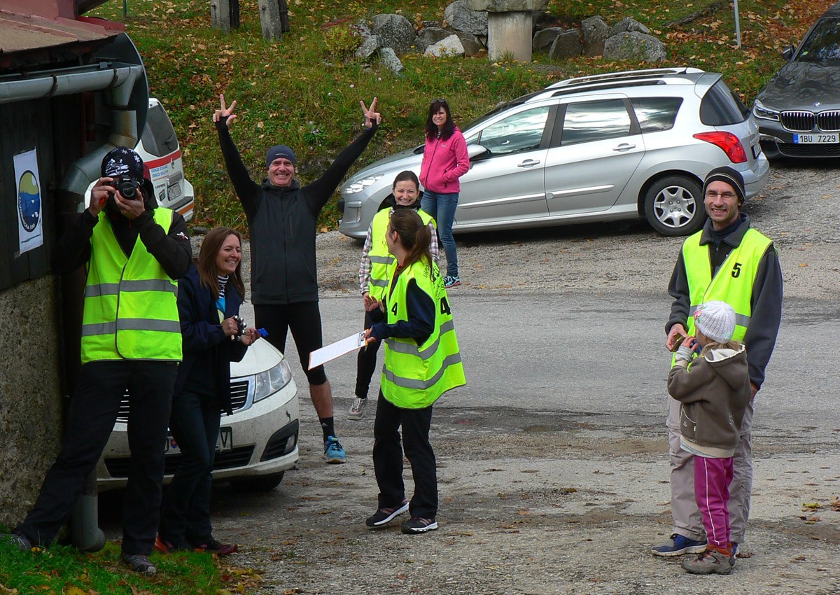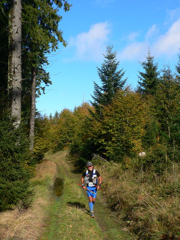 V podstate je to tu až na výnimky všetko behateľné, len treba často kľučkovať - aj na rovnej ceste, kvôli obrovským bahniskám a koľajam plným vody. Ale keď si to bahno odmyslím, krásny kraj. A ešte takto v strede jesene, keď to tu priamo hrá farbami. Akurát tam, kde napadané lístie prikrýva kamene, niekedy netuším do čoho stúpam. Ale darí sa mi „nehodiť tigra“ ani riťovku, čo mnohým zjavne nie, ako neskôr vidno v cieli... Zablatenými rukami sa ťažko obsluhuje foťák, dávam pozor fest.