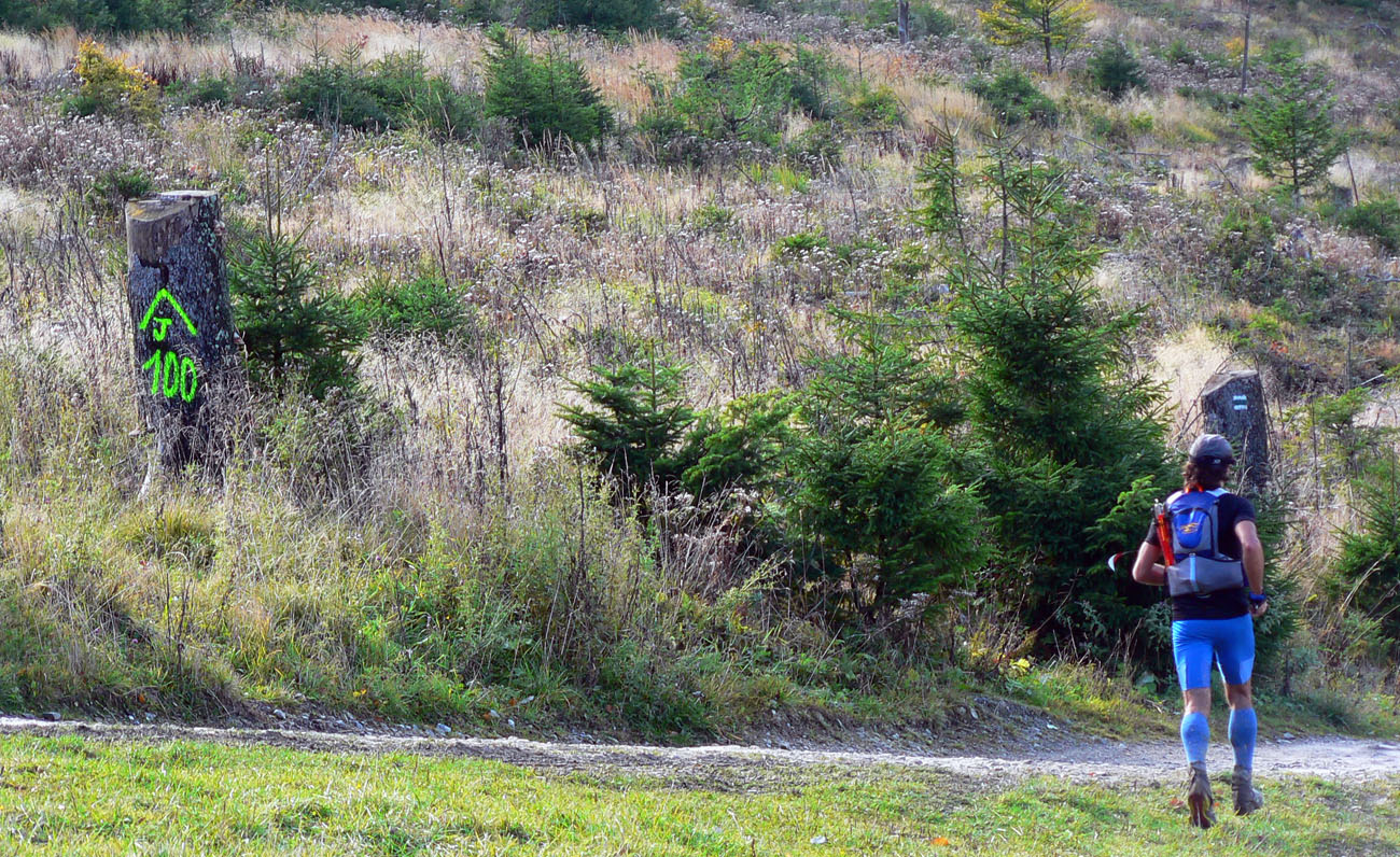 Vojty a Murčovci, v podstate takto začína hrebeň Javorníkov, ale dlho sa z neho netešíme, je tu odbočka doprava, ide sa dole do Zákopčia. A hneď za zákrutou prví tajňáši cvakajú karty – a rovno jedni z najlepších slovenských ultramanov Miki s Máriom, tomu sa povie obsluha! To aby sme si to do Zákopčia neskracovali po žltej. Ešte trošku po lúkach a strmoooooo dolu do doliny, po miestami zablatenej, miestami až do podložia a hnusných šutrov vymletej ceste, no hrôza. To je inak celá prvá polovica J100: dole do jednej dediny, nazad na hrebeň, dole na druhú stranu a zas hore.