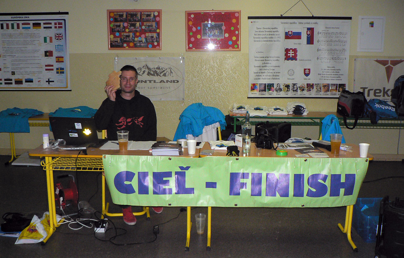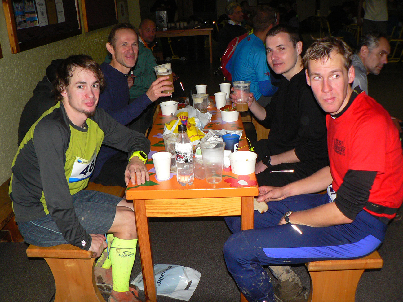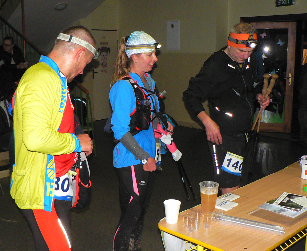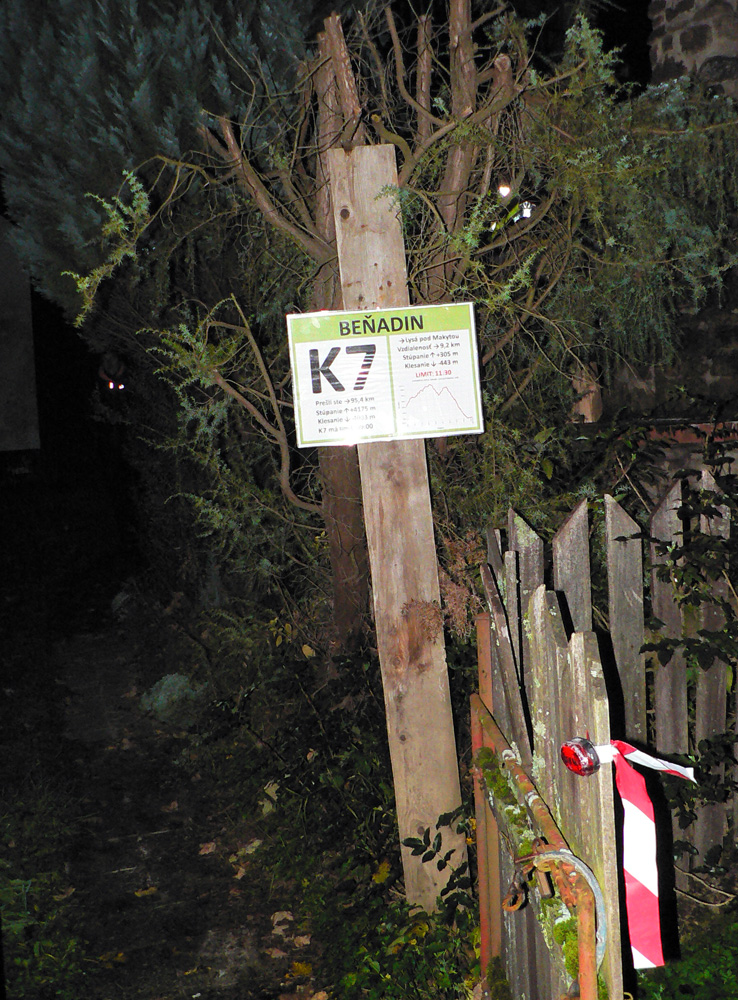 Aj z poslednej kontroly do kopca? No jasnéééé! Ale mierne, po ceste. Fáboriek a odraziek na mraky, svietia v tme, tu už sa ozaj netreba báť blúdenia. Ale čert nespí! Na úplne poslednej lúke nech sa pri tyčke s odrazkou a fáborkou obzerám ako chcem, ďalších odraziek niet. Ale cesta tu je, tak idem. Jasné že zle, ale to chytro zisťujem, keď sa objavia prvé stromy a na nich odrazky nie sú. Tak prvý raz vyťahujem mapu a hneď je všetko jasné. Neskôr sa dozvedám, že som zďaleka nebol jediný, ale bez „kufra“ by sa to proste nerátalo... 500m nazad a už bez pochýb dole do Lysej. Samozrejme že najskôr sa to podobá skôr na žľab, ktorým sa prehnala lavína a stádo slonov. Ale čím nižšie, tým lepšie, až asfalt a osvetlené ulice, už som aj rád. A to už je do miestnej ZŠ chvíľka. Kosa v sprche a môže začať socializácia, vlak ide až o piatej ráno :-)