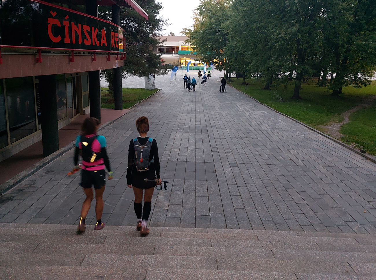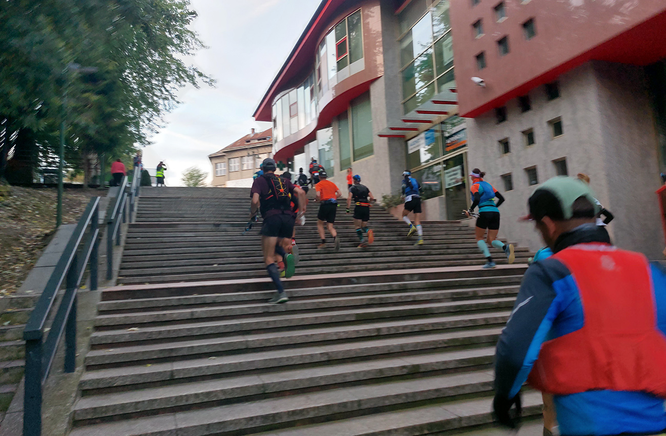 Potom o siedmej teda už šprint cez tie nové schody, ale dosť široké, aby sa na ne zmestili všetci pohodlne. Tie nasledujúce už sú užšie, ale to už sa tvoril had a von zo sídliska, na úvodnom hlinenom singlíku, už si hádam každý išiel svoje tempo. Vpredu sa asi aj kvôli chladu išli bomby poriadne, žiadna pohodová rozklusávačka ako na nedávnej Hriňovskej. Alebo sa to len mojim neokysličeným nohám zdalo? Každopádne ani som sa radšej nesnažil nadbehnúť si, pretekové kone som si odfotil len v štartovej bráne: