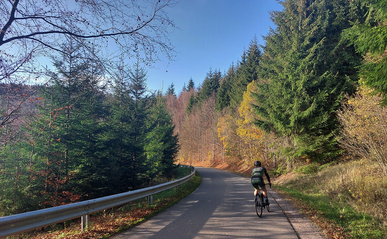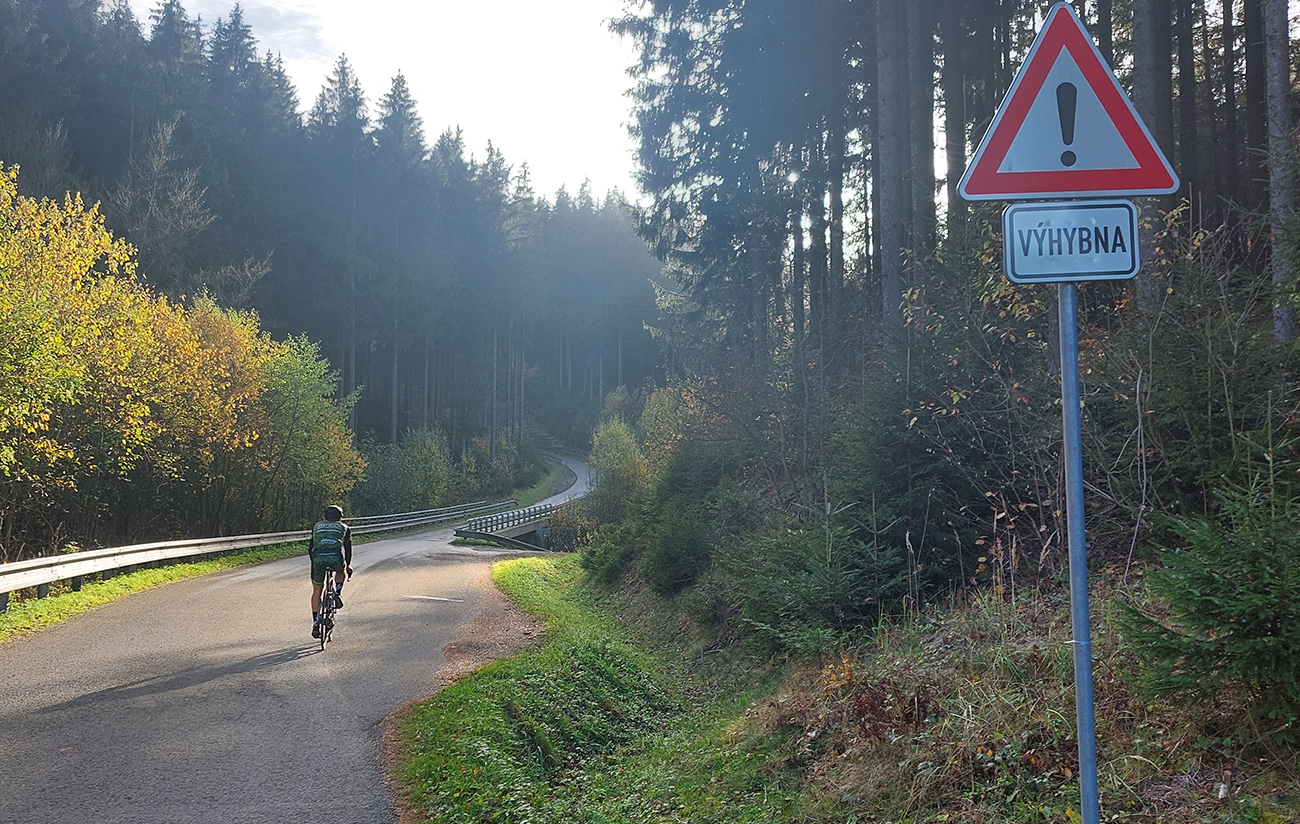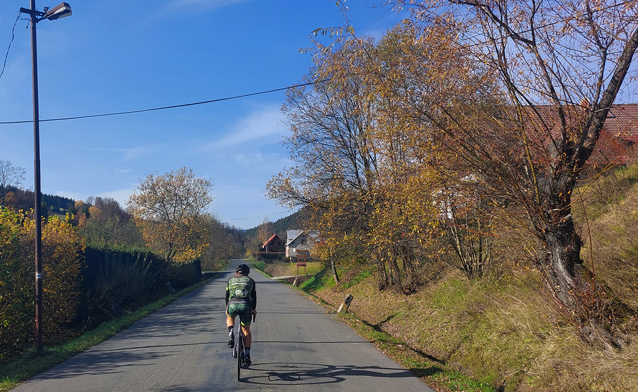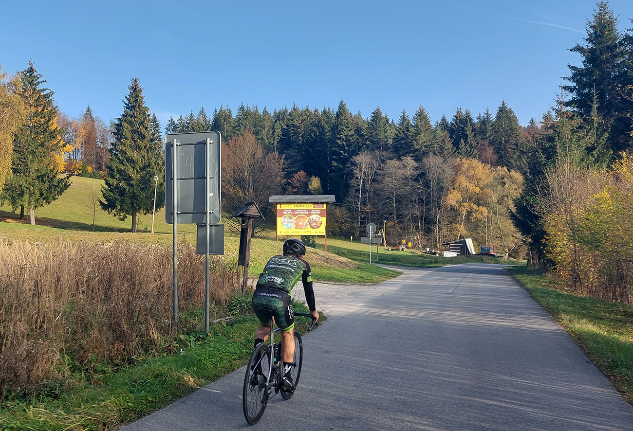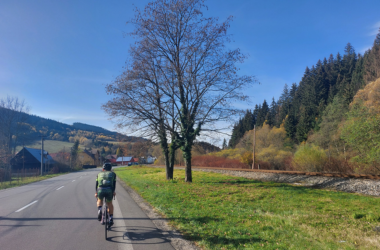 Cesta dole, jeden zážitok! Najprv mačacie hlavy ako na Roubaix, potom gravelový úsek po rozbitom asfalte. Asi preto som zabudol po pauze zapnúť hodinky, hehe... Veď ten záznam aj tak vyzerá. Popred hraničiarsku hliadku (ozbrojenú ako do vojny) sme radšej prešli bez nadávok a potichu, lebo by odhalila, že sme imigranti a ktovie, čo by bolo... S vynorením z lesa prišlo aj krásno – pod kolesami aj v okolí. Akási je tá krajinka na druhej strane hranice lepšie udržiavaná oproti tej našej. Aj nové domy s väčším vkusom budované, aj okolie ciest upravené a tak... K tomu slnko do chrbta a farby kalendárové.