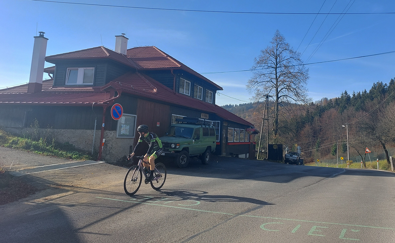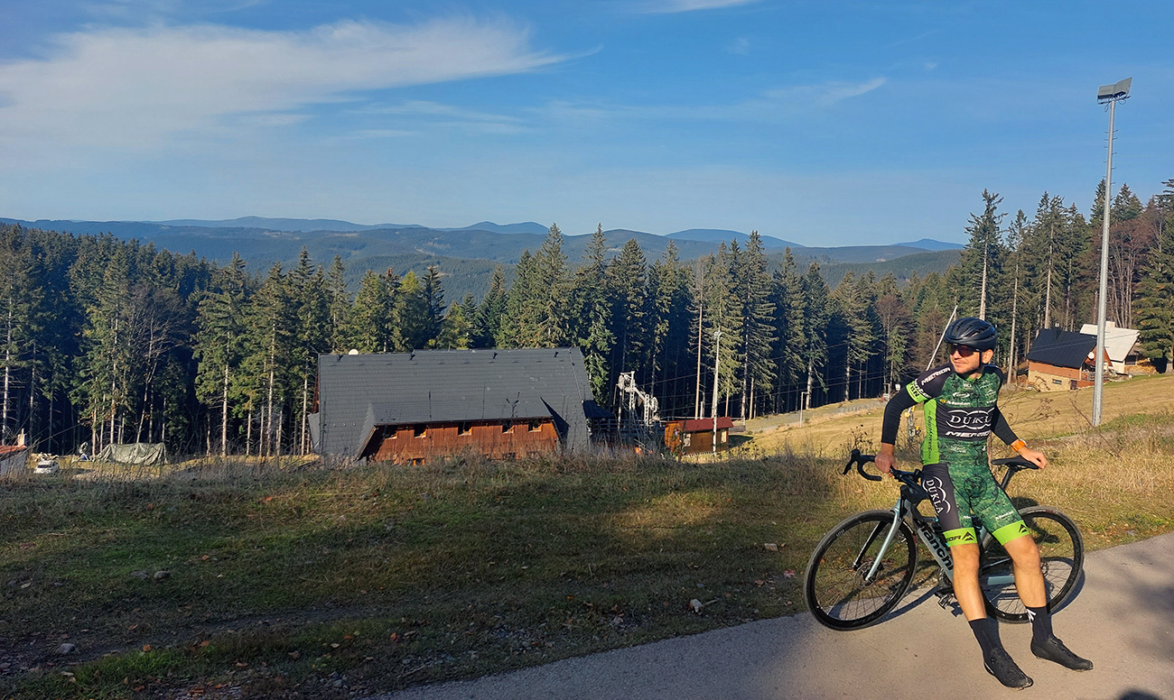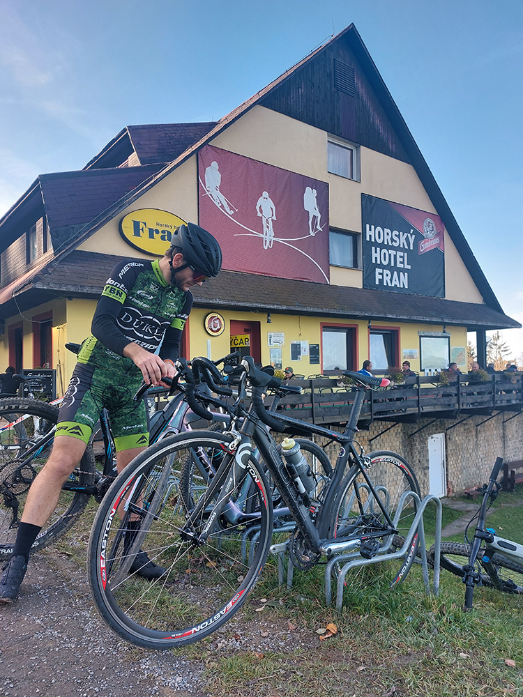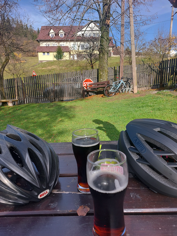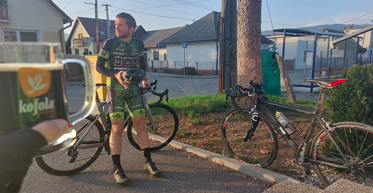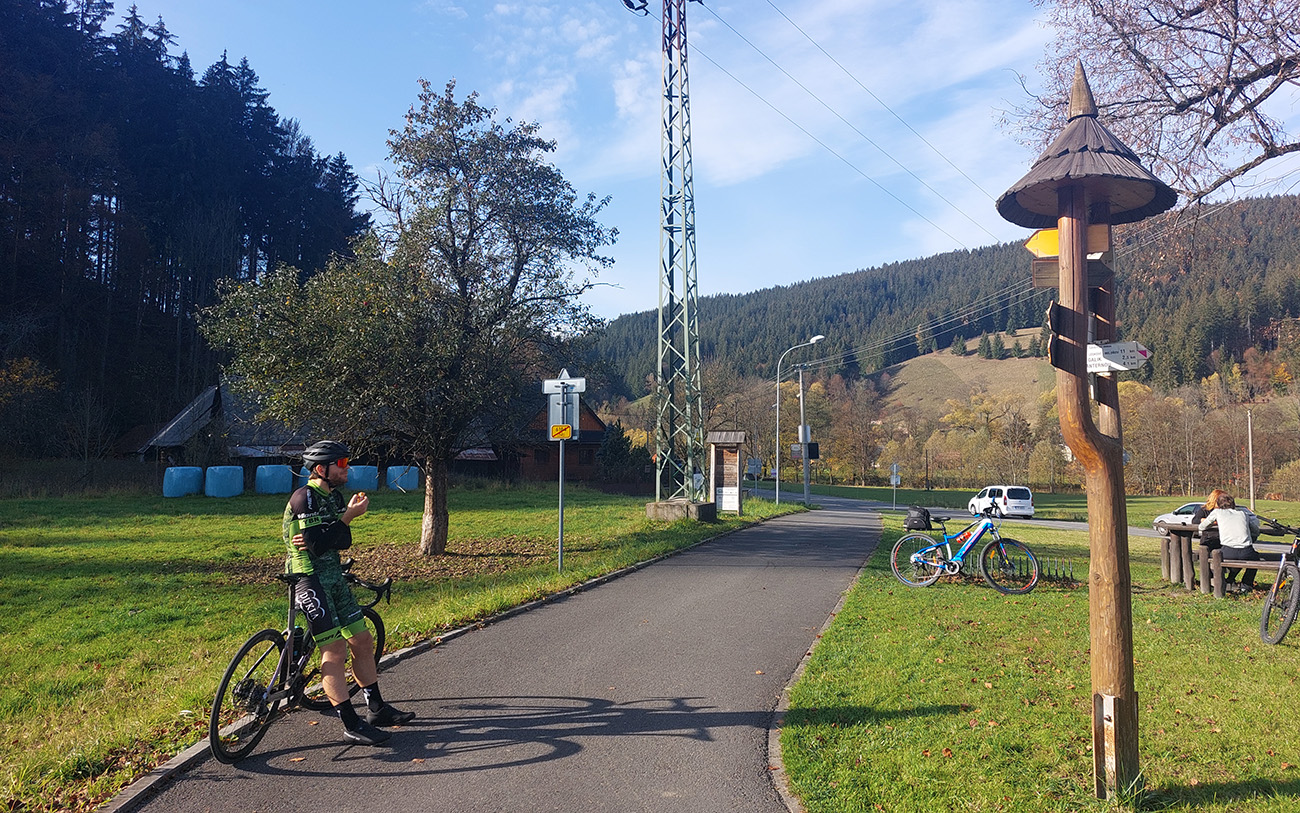 Cesta dole, jeden zážitok! Najprv mačacie hlavy ako na Roubaix, potom gravelový úsek po rozbitom asfalte. Asi preto som zabudol po pauze zapnúť hodinky, hehe... Veď ten záznam aj tak vyzerá. Popred hraničiarsku hliadku (ozbrojenú ako do vojny) sme radšej prešli bez nadávok a potichu, lebo by odhalila, že sme imigranti a ktovie, čo by bolo... S vynorením z lesa prišlo aj krásno – pod kolesami aj v okolí. Akási je tá krajinka na druhej strane hranice lepšie udržiavaná oproti tej našej. Aj nové domy s väčším vkusom budované, aj okolie ciest upravené a tak... K tomu slnko do chrbta a farby kalendárové.