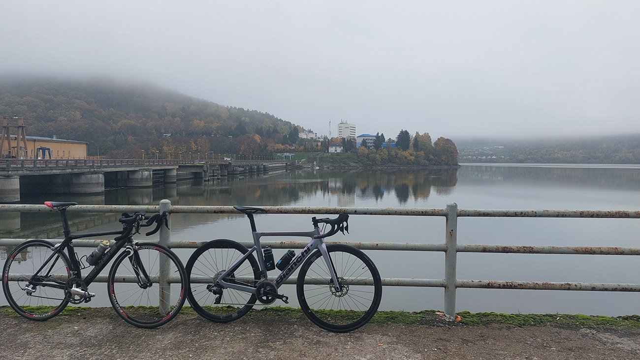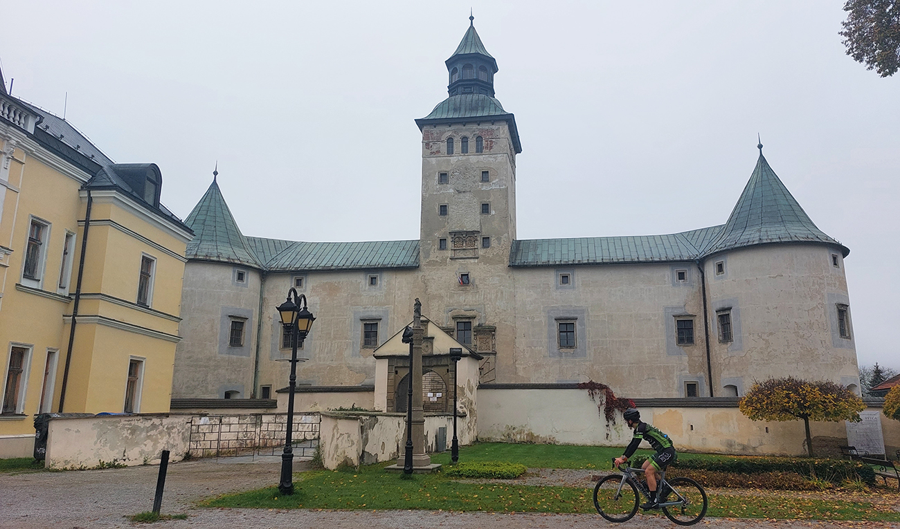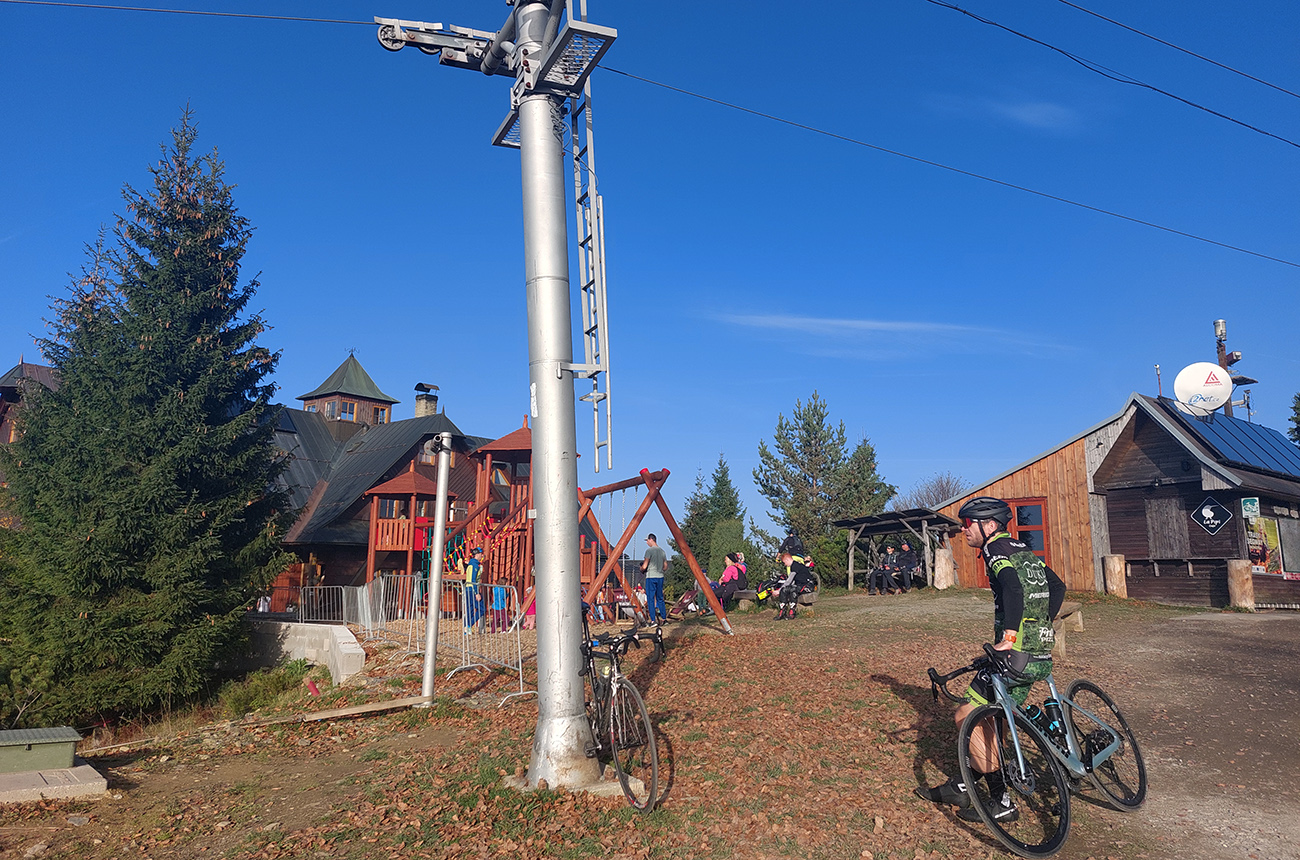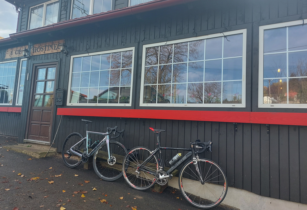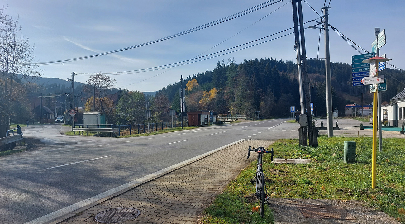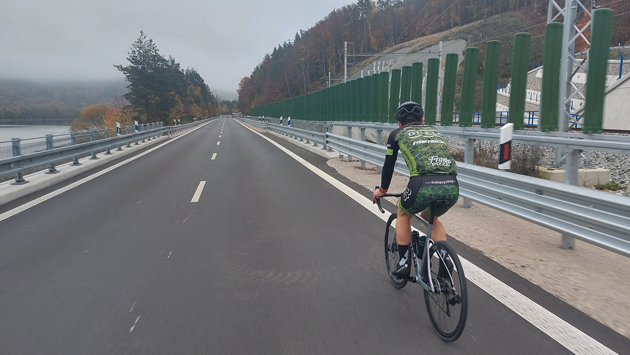 Cesta dole, jeden zážitok! Najprv mačacie hlavy ako na Roubaix, potom gravelový úsek po rozbitom asfalte. Asi preto som zabudol po pauze zapnúť hodinky, hehe... Veď ten záznam aj tak vyzerá. Popred hraničiarsku hliadku (ozbrojenú ako do vojny) sme radšej prešli bez nadávok a potichu, lebo by odhalila, že sme imigranti a ktovie, čo by bolo... S vynorením z lesa prišlo aj krásno – pod kolesami aj v okolí. Akási je tá krajinka na druhej strane hranice lepšie udržiavaná oproti tej našej. Aj nové domy s väčším vkusom budované, aj okolie ciest upravené a tak... K tomu slnko do chrbta a farby kalendárové.