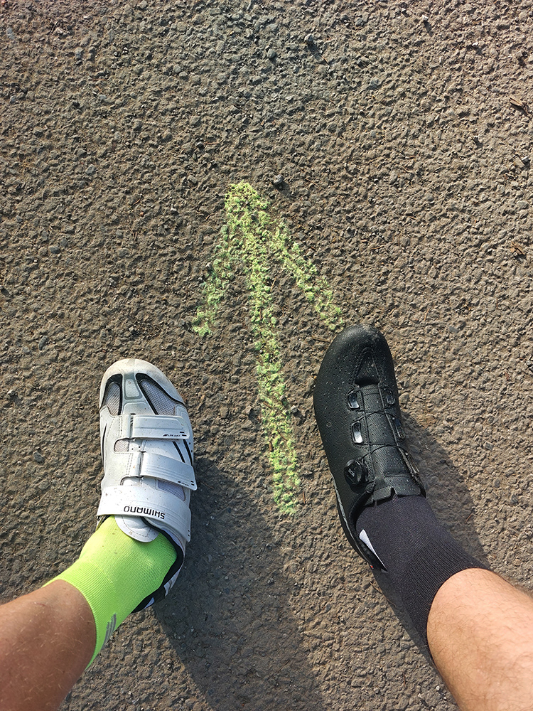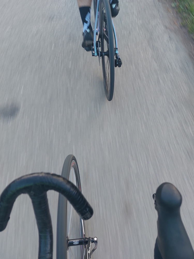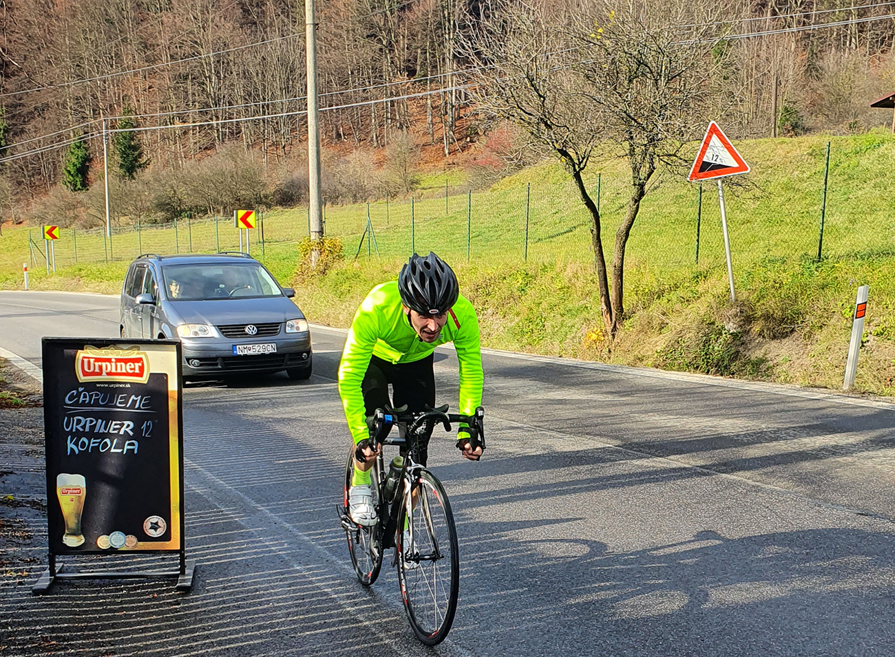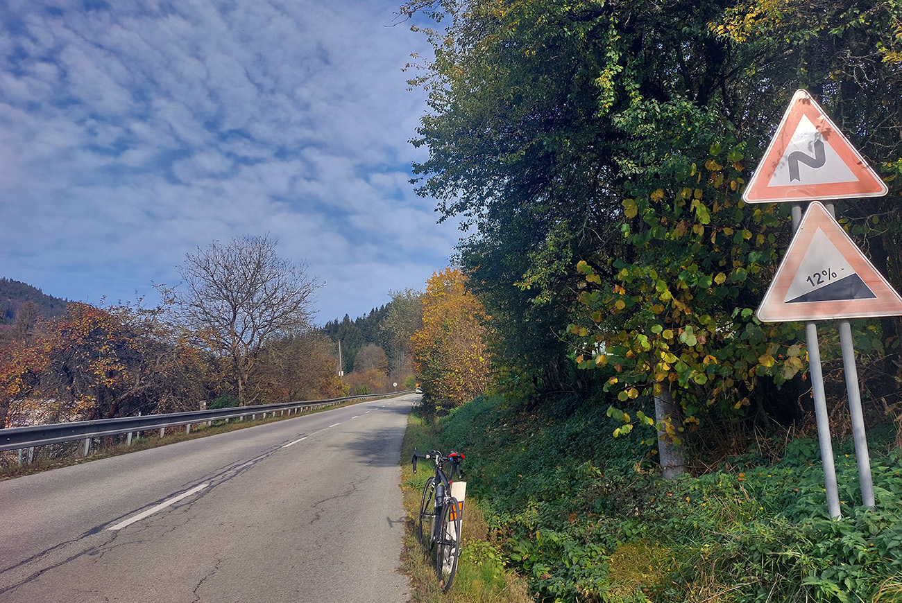 Lebo na začiatok mierny sklon pomedzi domy a ovce a kone a pasienky a celkovo príjemné vozenie. Ale keď už mi došli ľahké prevody, zrazu odbočka a čo sa pred nami za stena postavila, tomu som skoro neuveril... Že som si ja nedal tú námahu naštudovať si trasu poriadne vopred – hneď by som ten okruh naplánoval opačne! Tri kiláky lámania kľúk ako v spomalenom filme z Tour zo šesťdesiatych rokov, otáčky blízke nule a na pár miestach (just najstrmších) zase ten slizký asfalt v tieni. A niekto si tam vpredu v pohode vrtel nohami, s prevodmi ako na mtb, že?