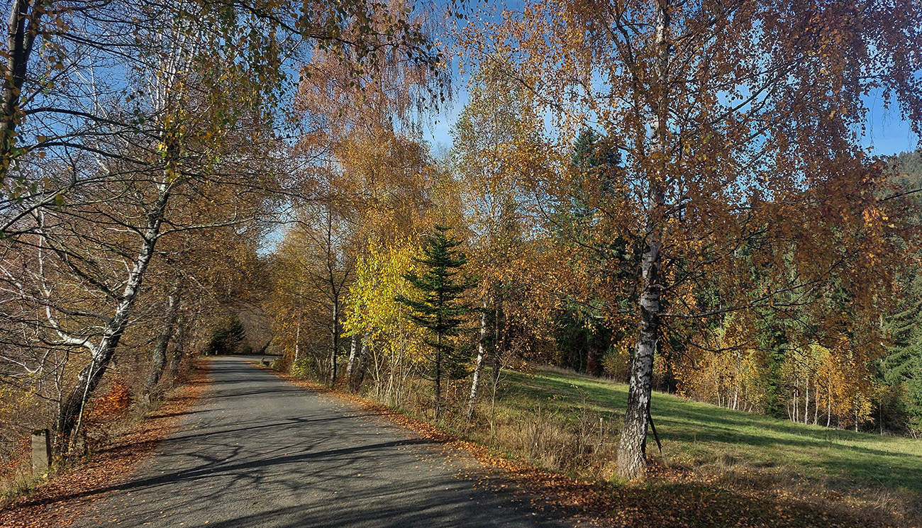 Joooj ale tie serpentínky dole do Čertova, to bola iná paráda! Asfalt ako detská riťka, farebný les okolo, premávka oproti českej strane minimálna a cesta širšia, aj dáke výhľady na šíry kraj javornícky sa naskytli. Len dole v doline už sa ochladzovalo a nejako nám zachádzala chuť hľadať vhodný podnik na posedenie a pojedenie. Dohoda sa urodila rýchlo: že radšej potiahneme švihom do mesta a nájdeme niečo tam. Tak sme švihali, teda ja som skôr ledva visel v háku. No nevyzeralo to podľa rečí zhora z hrebeňa, že "to dáme na pohodu". Ešte že som preventívne zageloval, aspoň to ma pohnalo na pár kilometroch. Aj som bol schopný chvíľu potiahnuť. No spoza chrbta len tichý smiech, že aká to rýchlosť a že mu je zima, hehehe...
