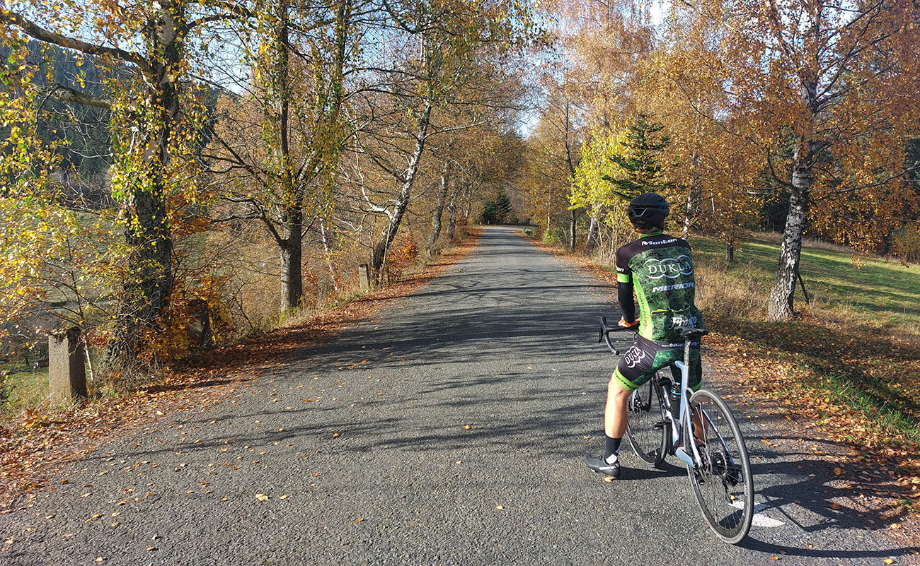 Tak som si nakoniec moju obľúbenú Javornícku stovku užil aj tento rok, ale inak – na cesťáku. Keď som tú ozajstnú musel doma preležať s covidom. Takže nebola to tentokrát "čiara z A do B", ale okruh z Púchova, s „bývalým kamarátom“, ktorý potreboval poriadne pokrstiť nový bajk (podarilo sa, až skoro dualy rozbil). A okrem toho už dlho sme si sľubovali spoločný švih. Rád som, že to vyšlo, aspoň na ten prvý deň zimného času - už som ani nedúfal, že niečo poriadnejšie pojazdím túto jeseň. Predpoveď síce hrozila inverzným mliekom, ale to sa našťastie rýchlo rozpustilo a namiesto neho aj tie farby sme mali také plnotučné, aké na pravej Javorníckej zvyknú byť. A ešte aj teplotu na kraťasy. Jóóój dobre sa išlo, aj keď som sa musel nechať čakať a ťahať a miestami som ledva v háku uvisel.