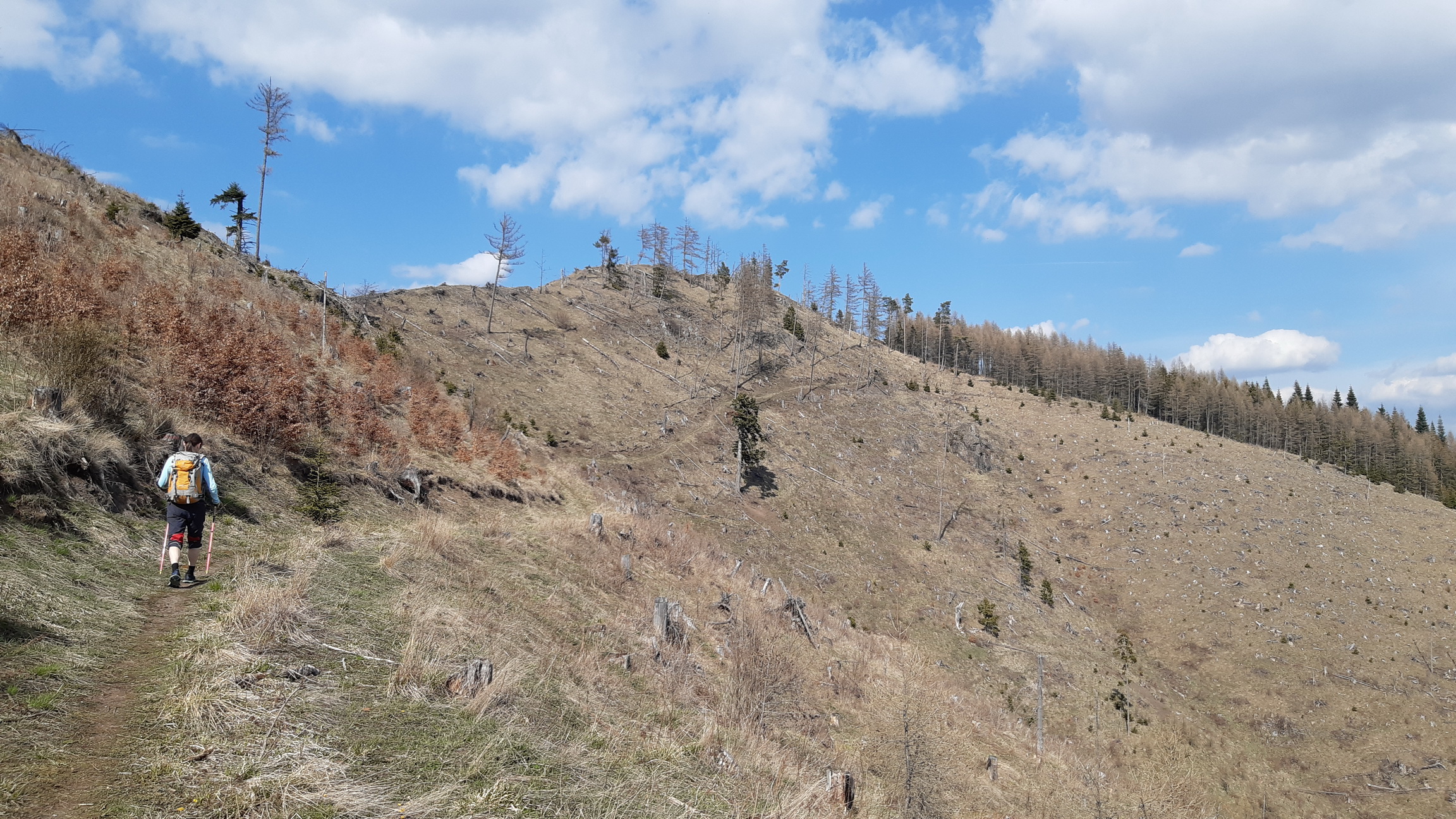 Lesných ciest je tu pomerne dosť. Pred pár rokmi túto oblasť postihla silná veterná kalamita ako už ináč následovaná kôrovcom... Trošku sa to tu presvetlilo a po harvestoroch ťahajúcich drevo ostali ťažobné linky vedúce po spádniciach. Jednou takouto pokračujeme aj v našej túre. Vedie nevýrazným hrebeňom, už je poznačená eróziou a dovedie nás na postupne zmierňujúci sa hrebeň. Ním už vedie krásna lesná cesta s parádnymi výhľadmi na Vysoké Tatry a rovnako na ľavej strane aj na Kráľovú hoľu.