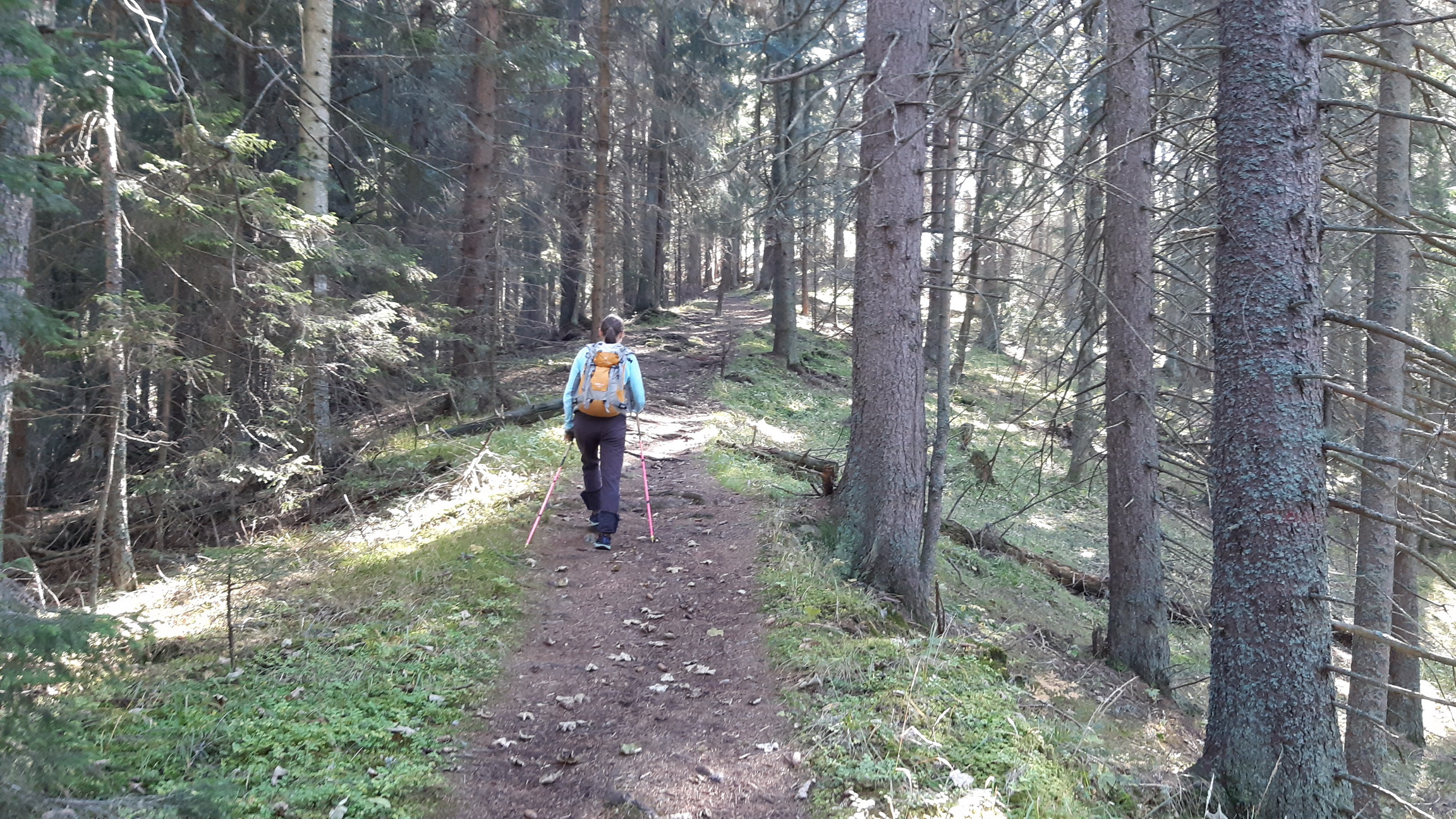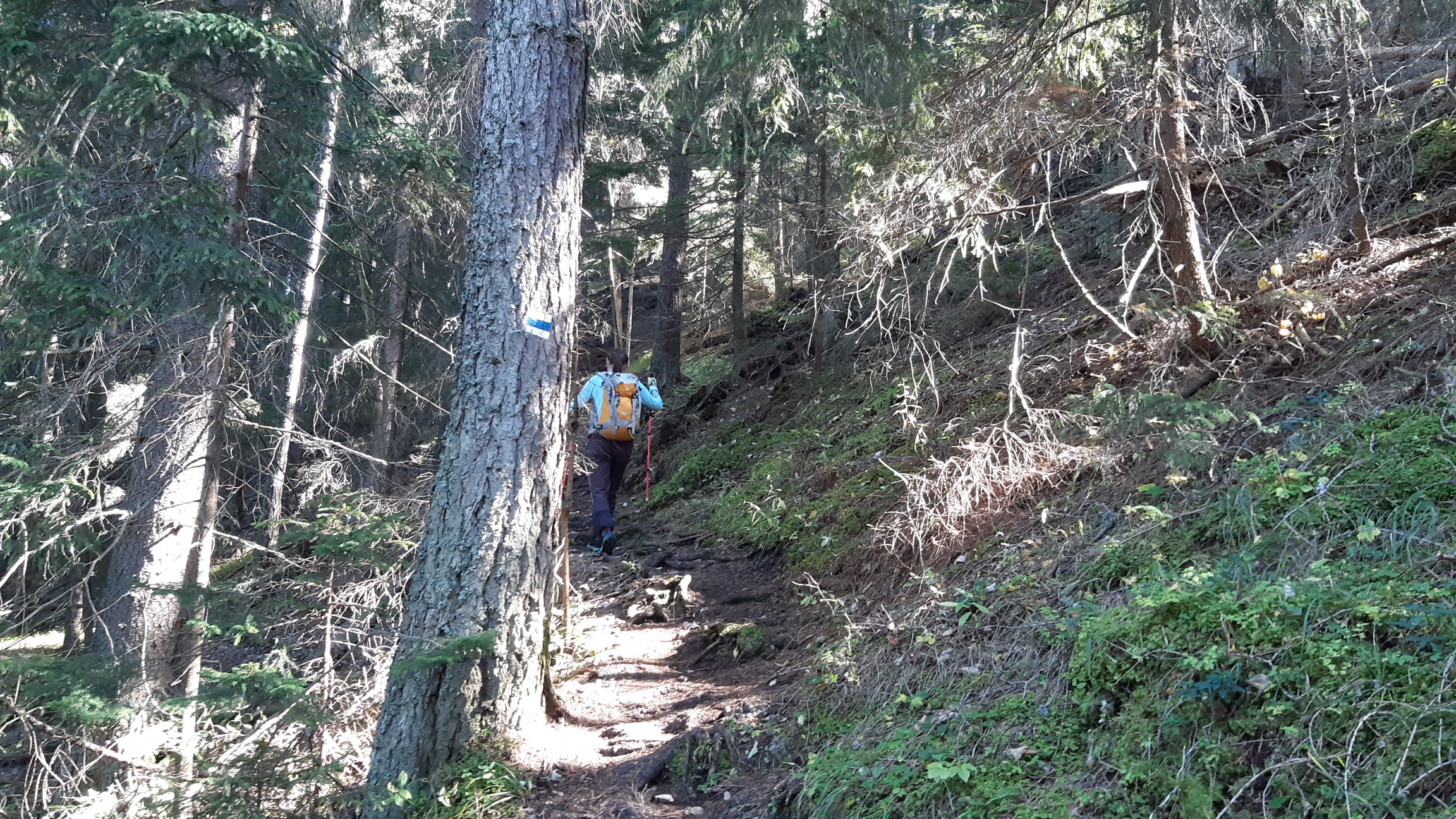 Serpentíny v lese sú poznačené lokálnymi vývratmi spôsobenými víchricou, asi ešte z predošlej zimy. Chodníček je ale vedený s rozumom a dlhé serpentíny sa výrazne odlišujú od mnohých novších turistických chodníkov, ktoré vznikli preznačením nejakej nepoužívanej ťažobnej linky na drevo... Prečo sa aj dnes tie turistické chodníky nemôžu robiť ako kedysi? Si musím často povzdychnúť pri potulkách Slovenskom, ale zároveň sa teším, že dnes to bude iné a lepšie ako som zvyknutý...