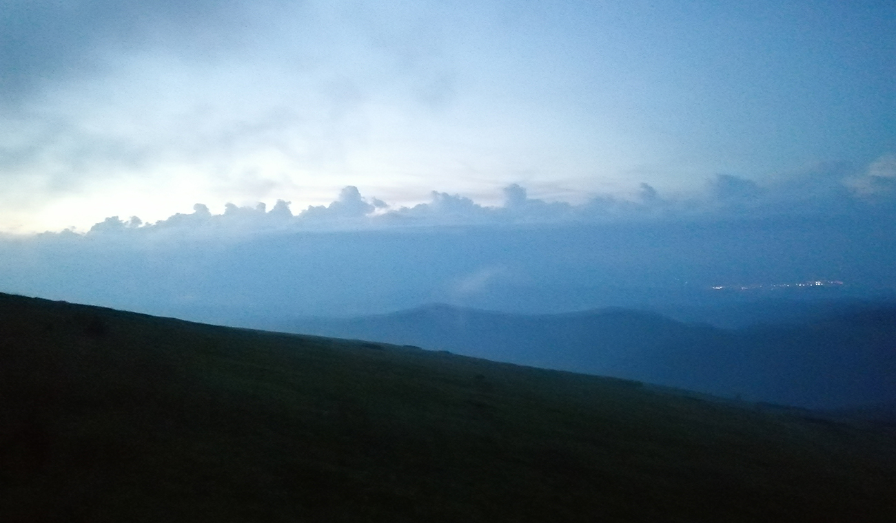 V sedle Snehová jama pauza, fotím salaš maringotku, ovce sa chystajú na noc. Tma kryje krajinu pomaly, ešte tu hore je svetla dosť, ale tmavia to tie mraky na holi a hrebeni, nad Slovenským rajom malé búrkové oblaky a šľahačky v oranžovej, podobne aj Tatry a Popradská kotlina. Tak znova hore sa, asfalt sa lepší, je rovnejší, diery zmizli, smoly pribudlo, tu sa dá aj na cesťáku (len tá spodná časť po chatu je na gravel s aspoň 30 mm gumami), sem tam je pomastené od oviec. Od sedla aj pofukovať začalo, teda chladenie par excellance, ukazuje sa, že kľúčový prvok je nielen výkon motora, ale aj výkon chladenia. Dokonca si aj prehodím na ťažší prevod! Ale iba na chvíľu, šprintovať tu nebudem. Smerujem do tmy a obzerám Martalúzku, cesta ide pekne hore, aj do diaľky viac vidno, tak sa ľahšie ťahá. Čistím si hlavu, funguje to na pomalé otáčky, ale skoro dokonale!