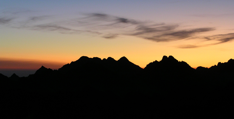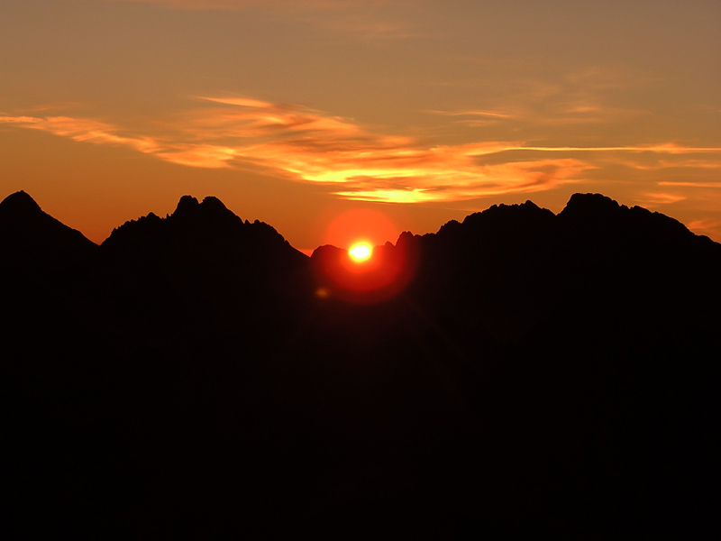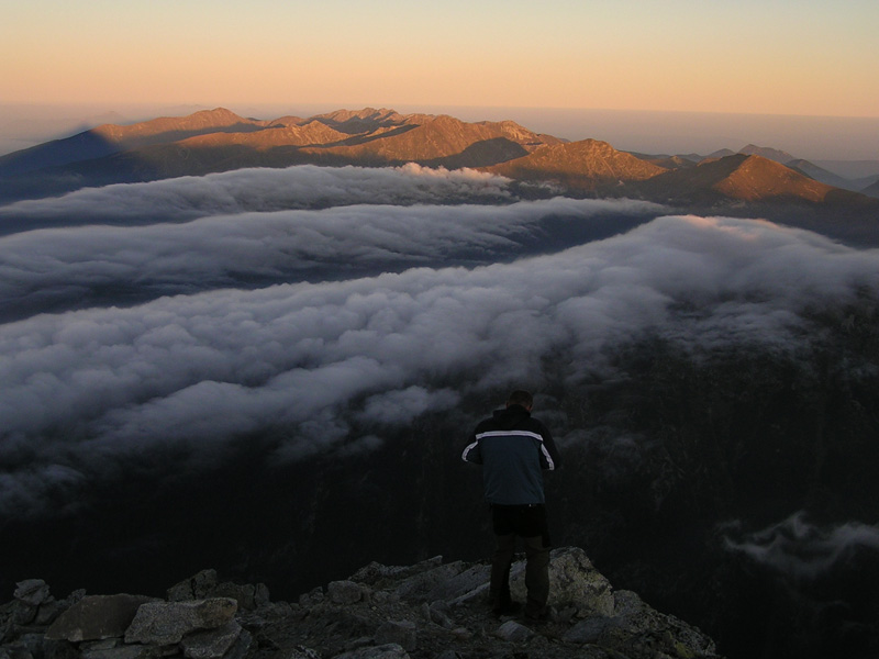 V noci sa budím len raz. Zvláštny syčivý zvuk zaznie dvakrát za sebou blízko nás. To stádo kamzíkov vyšlo takmer až na vrchol a zacítilo ľudí. Budíme sa skoro ráno. Nad tmavým horizontom Tatier sa objavujú ranné zore. Tesne pod vrcholom vidno poskakovať pár čeloviek, počuť tlmené hlasy. Partia mladých si tiež prišla pozrieť východ slnka. Pozdravíme sa, prehodíme pár slov. Ráno je chladné. Koluje ploskačka slivovice. Stojíme a čakáme. Medzi obrysom Vysokej a Lomničáku zasvieti kontrolka. Vychádza. Fascinujúce kino. Inverzia nad Poľskom, jemná metamorfóza oblakov nad slovenskou stranou.