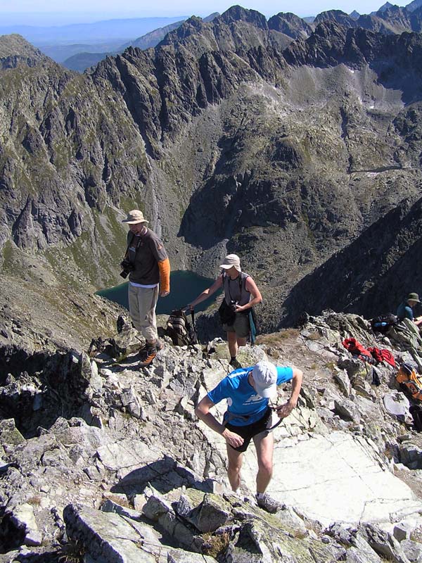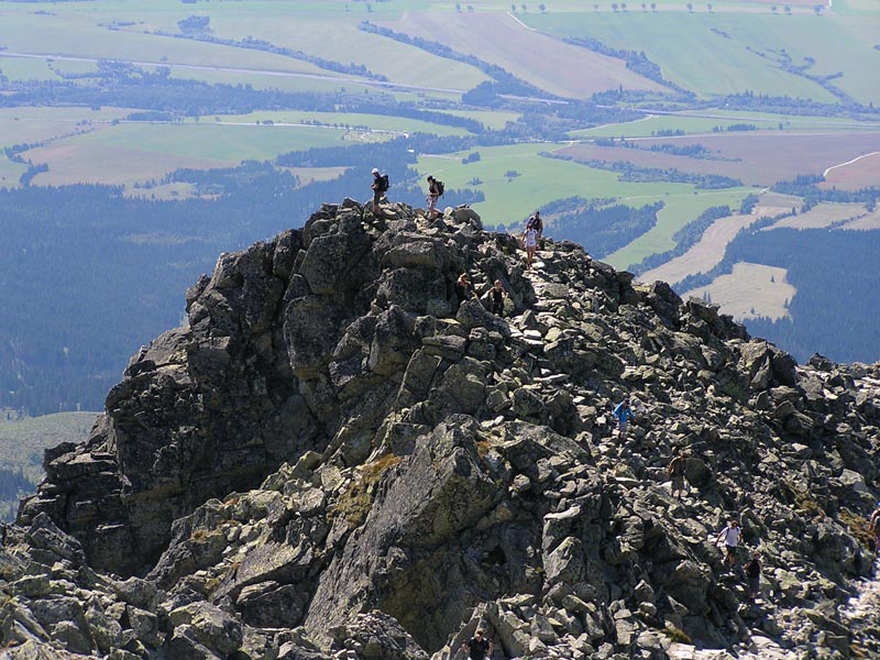 Sem - tam míňame udivených ranných turistov. Na chodníčku ku Krivánskemu žľabu povieva osviežujúci vánok. Bežať sa dá až sem. Potom už len rýchlym krokom až na vrchol. Hore si s úsmevom tľapneme. S cikacími a foto pauzami to máme od Štrbského plesa až sem ku krížu za 1 hod. 50 min. Vyvalíme sa na hodinku hore na vrchole. Obloha je čistý plech, modro sa odráža v plesách dole v dolinách. Aj keď vzduch stojí, je príjemne. Vrchol sa pomaly zapĺňa turistami, zhora vidno hadiaci sa dav ľudkov. Vytešení na kosť sa kocháme výhľadom.