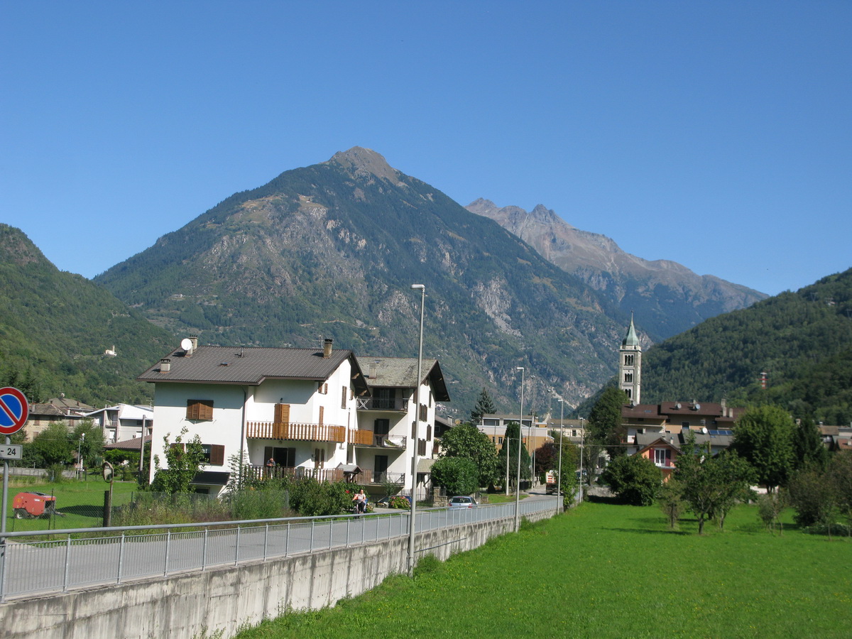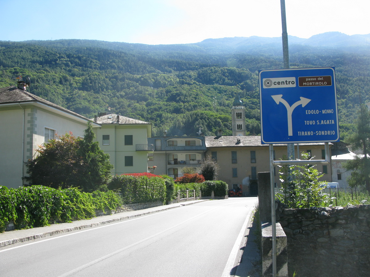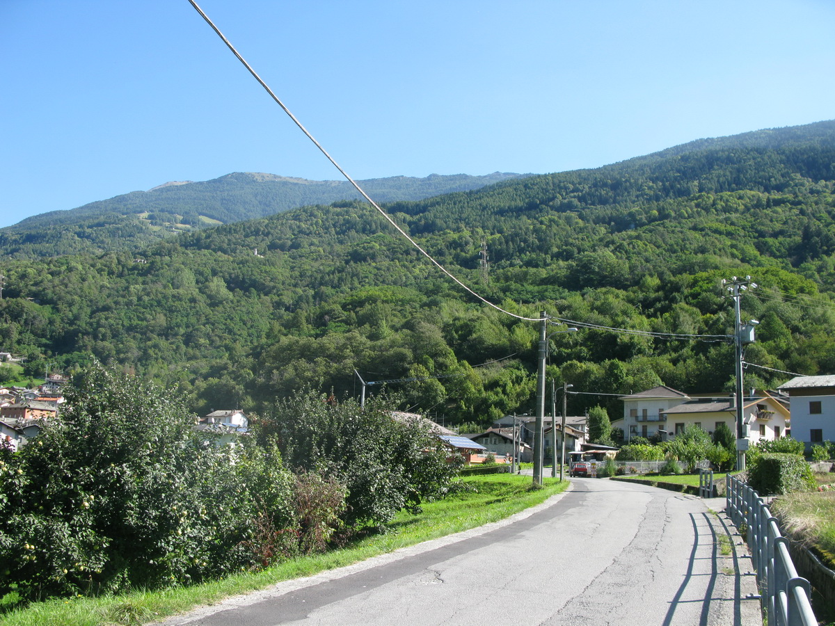 Mazzo di Valtellina, moju odbočku som prešvihol. Nevadí. Hneď na dalšej odbočke schádzam dole z rýchlocesty smer Bormio. Odbočujem na mestečko Grosio a kúsok pred ním parkujem pred nejakou fabrikou. Vyťahujem bajk z auta a po miestnej ceste sa cez dedinky pomaličky presúvam dole údolím Valtellina do dedinky Mazzo.