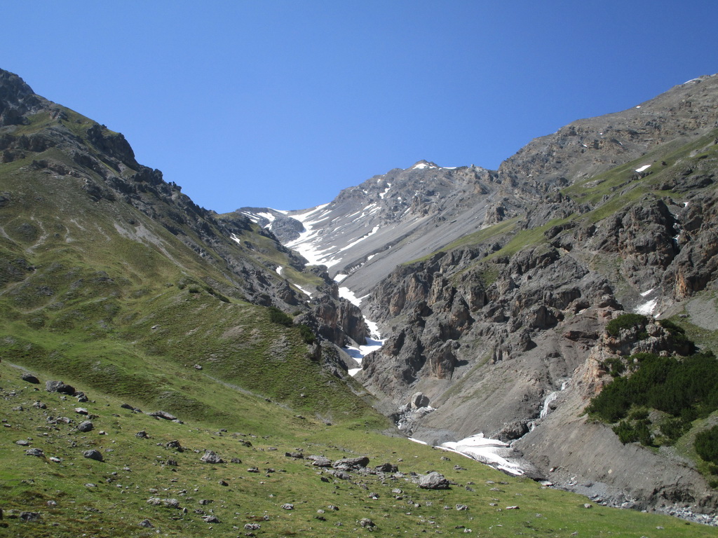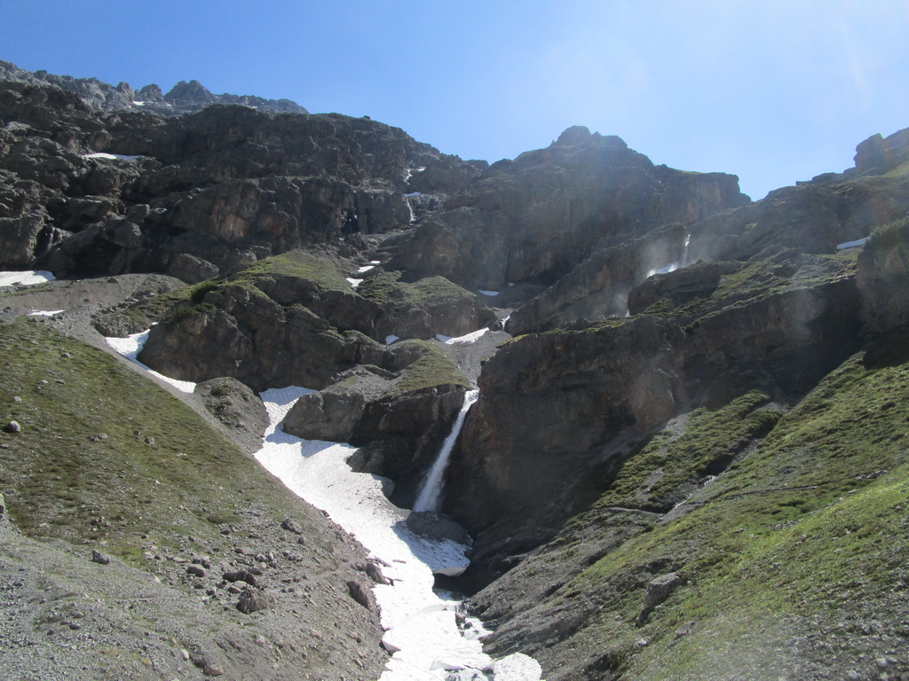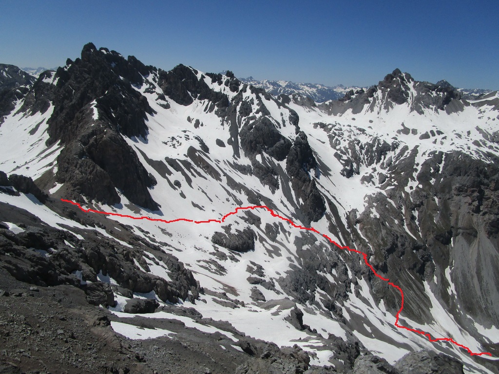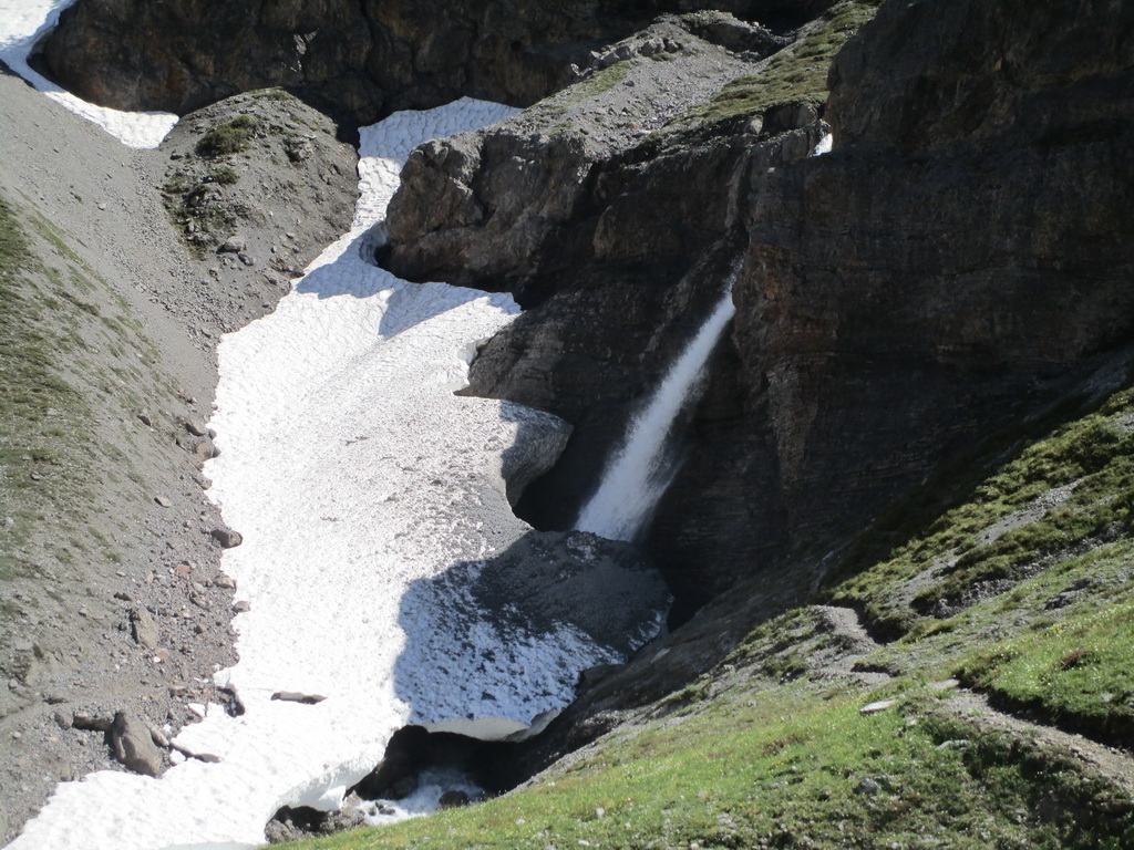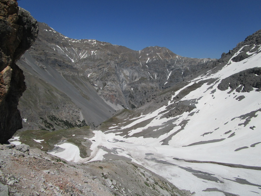 Pri zostupe si ešte pobehnem na taký vedľajší vrchol. Výhľady do novej doliny (Val dal Canton) úžasné. Podľa mapy tu vedie značka zo sedla ktoré som obišiel. pozerám dole. Všade ešte kopec snehu. Nevadí šak to pôjde ešte lepšie po ňom. Zostúpim dole ňou a urobím tak okruh. Pozorne si z nadhľadu ešte vyberiem smer. Vidieť tam zráz a na ňom chodník.