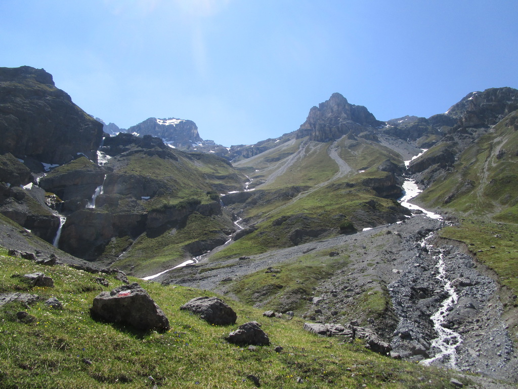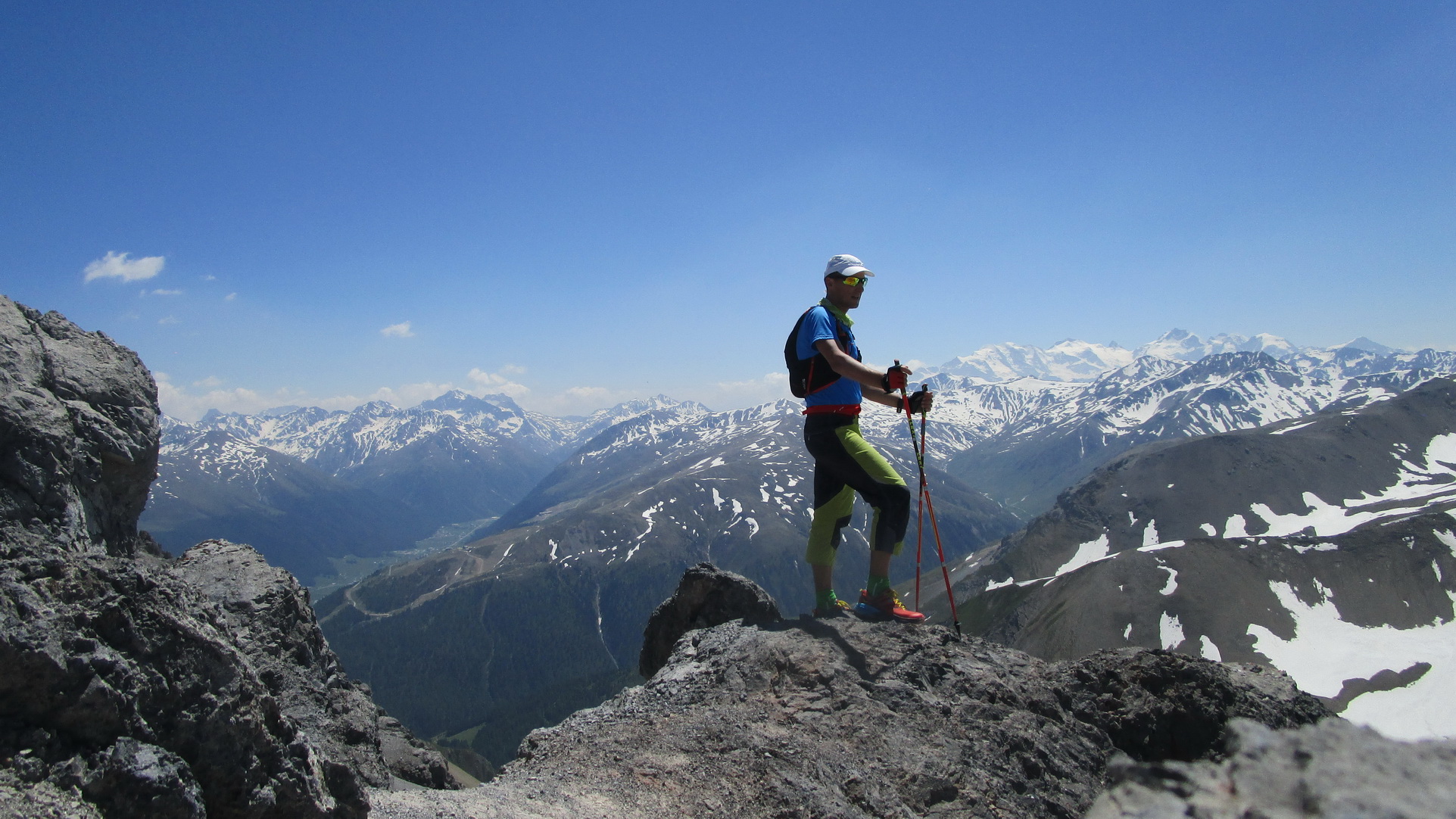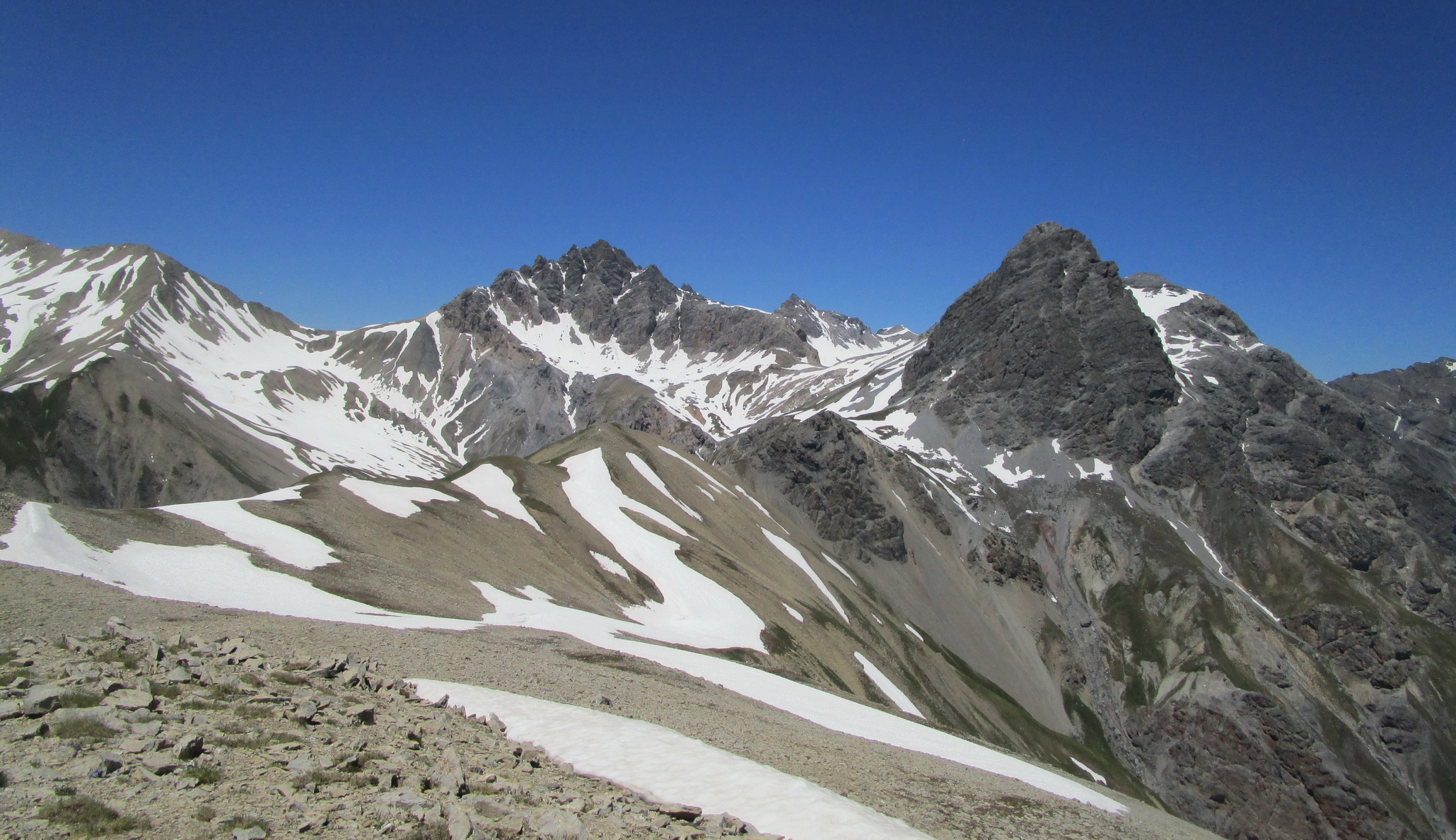 Pri zostupe si ešte pobehnem na taký vedľajší vrchol. Výhľady do novej doliny (Val dal Canton) úžasné. Podľa mapy tu vedie značka zo sedla ktoré som obišiel. pozerám dole. Všade ešte kopec snehu. Nevadí šak to pôjde ešte lepšie po ňom. Zostúpim dole ňou a urobím tak okruh. Pozorne si z nadhľadu ešte vyberiem smer. Vidieť tam zráz a na ňom chodník.