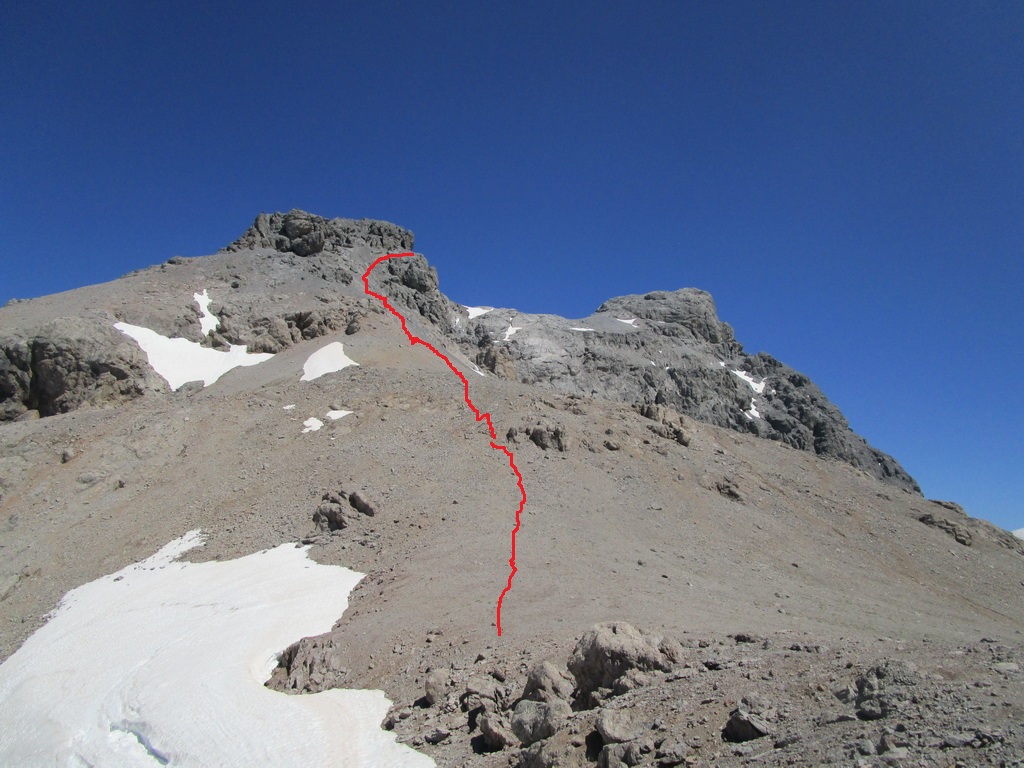 Traverzujem snehové polia smerom do sedla kam smeruje značka a rozhodujem sa odbočiť do žľabu. Terén veľmi podobný tým v Dolomitoch. Kameň tiež. Bez paličiek ani krok. Hore sa po troške lezenia dostanem ale dole si verím že nájdem niečo lepšie. Vyliezam na hrebeň a hneď sa rozjasní. Mužíci, stopy v snehu a je dobre. A hlavne jasná línia vedúce na dnešného krásavca favorita s konskou hlavou.