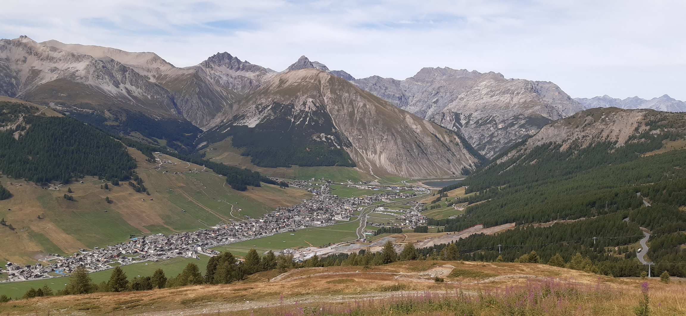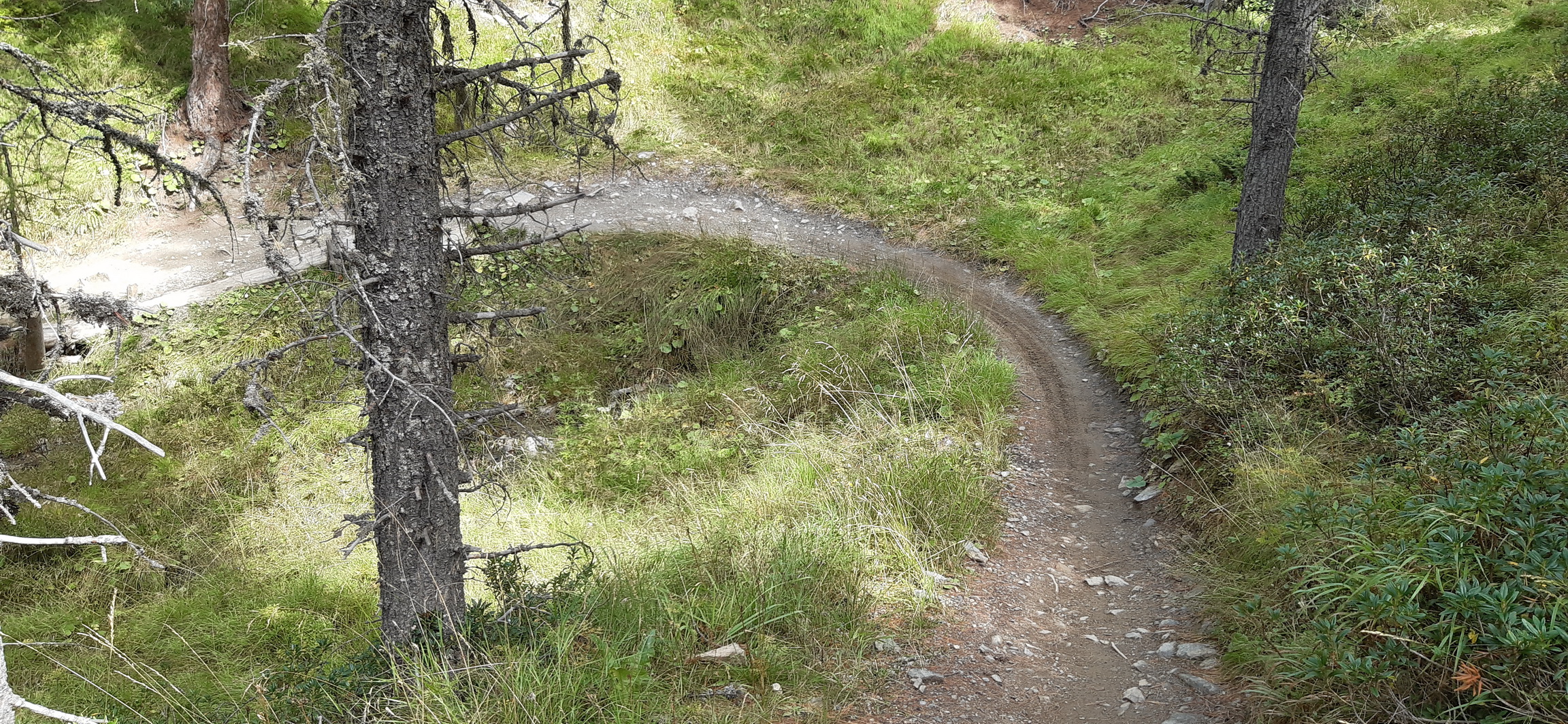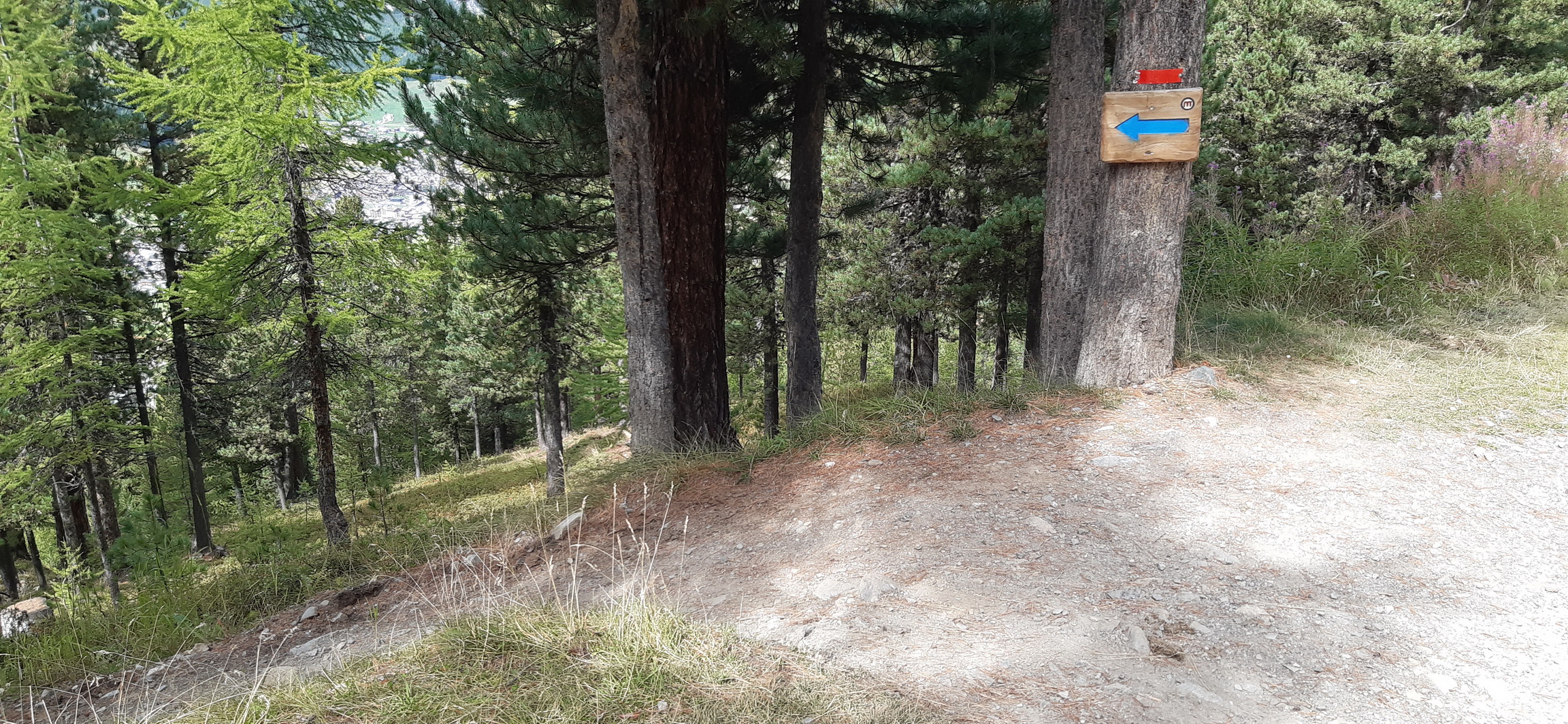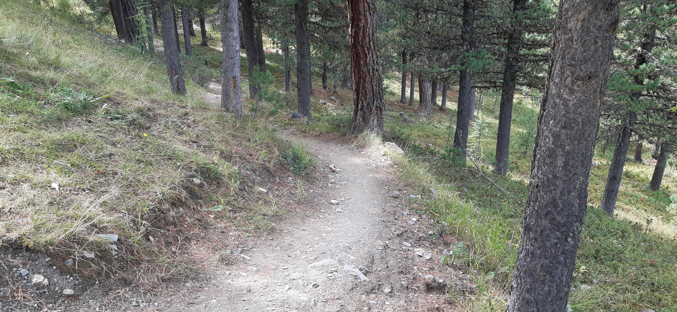 Jeden taký pekný voľný deň v Rosegu som vyrazil z doliny ako už inák na bajku. Jazdiť cez voľný deň autom pre mňa nie je veľmi zaujímavé a tak som cez Val de Fain a Strettu pre mňa najkratšou variantou prišiel do Livigna, dal som občerstvenie v obľúbenom bistre pri dolnej stanici lanovky Mottolino a vyšlapal som hore asfaltom na Trepale odtiaľ ďalej stúpaním z Gira až ku hornej stanici lanovky. Tu začína spomínaný trail, najprv otvorený priestor s výhľadmi a potom sa už vnorí do horského lesa ktorí tu tvorí smrekovec a borovice. Smreky tu prakticky nie sú žiadne.