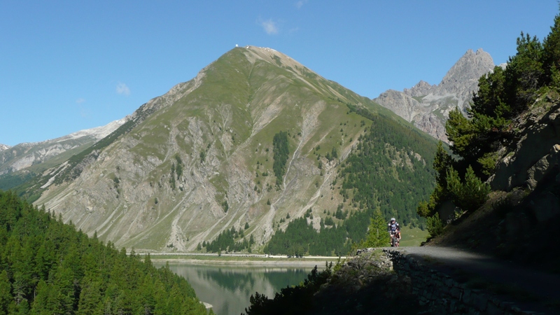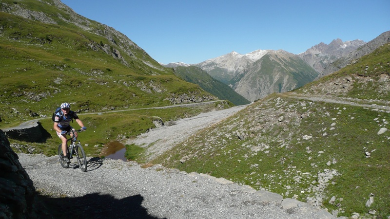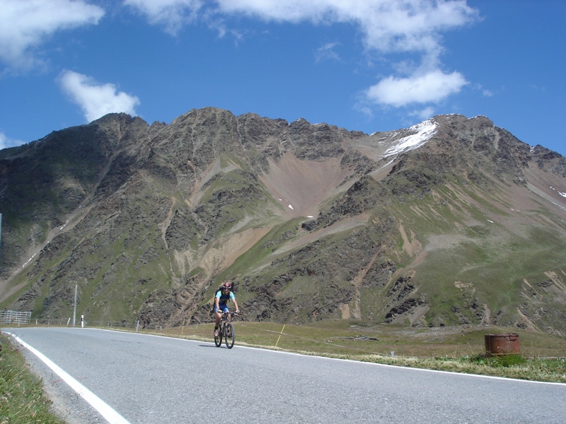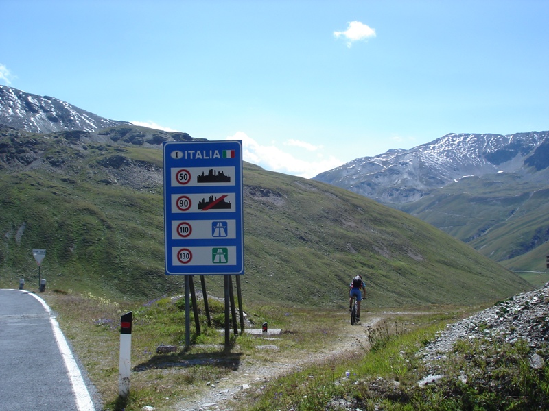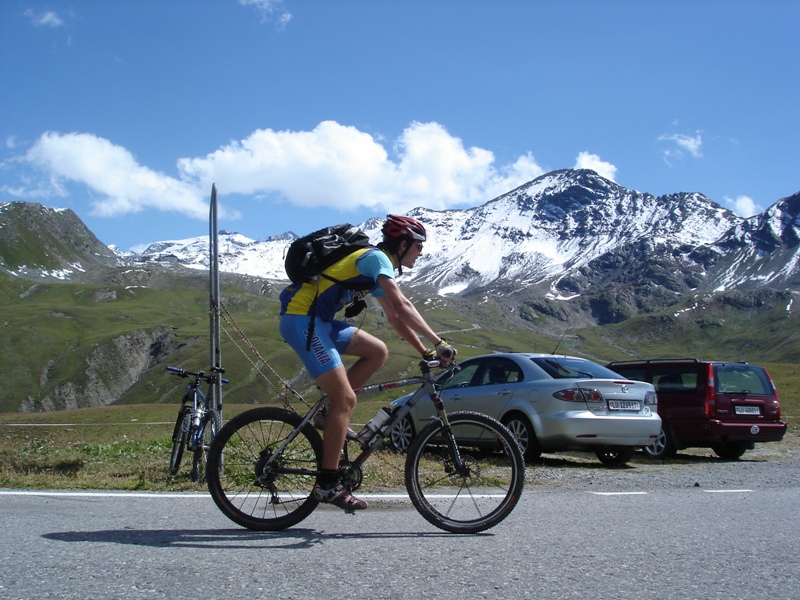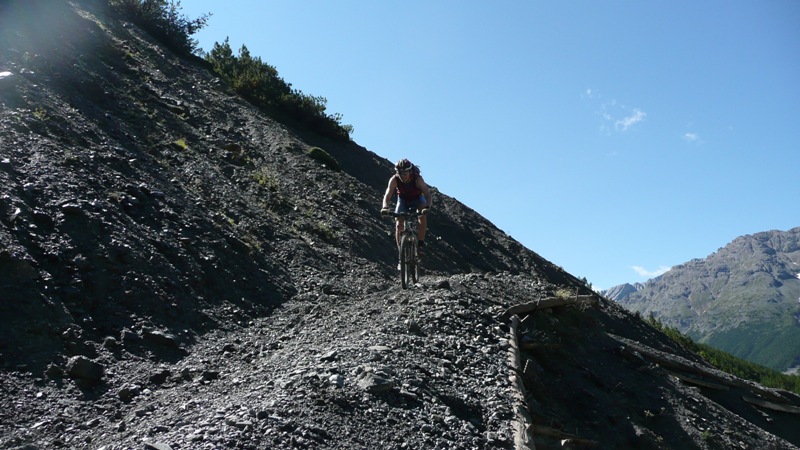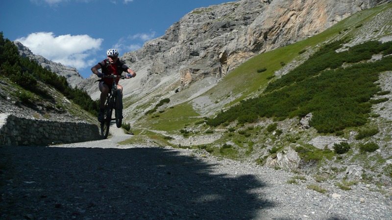 Dali sme si obedík a začali stúpať na Umbrailpass 2506m, čo bolo vyše 1100m prevyšenia. Stúpanie je najprv asfalt, potom šotolina a na záver opäť asfalt. Také typické alpské, dlhé, veľa serpentín, nádherné výhľady, krásne namáhavé. V sedle odbočujeme doprava na turistický chodník do sedla Bochetta di Forcola 2768m. Opäť sme na euforickom singletracku s výhľadmi na Ortler a jeho ľadovce.. Tu sa robia také fotky, ktoré keď vidíte v časopise, tak ich ani neberiete vážne. To predsa nie je možné... Záverečných pár metrov treba hodiť bicykel na plece a zapózovať fotografovi. V sedle sú zvyšky opevnenia ešte z prvej svetovej a kúsok pod sedlom budova starých kasární. Zjazd je opäť značne euforický. Technicky trocha náročný len v hornej časti, kým sa nezmení na šotolinu. Skaly, tráva, hlina, kamene. Zabudli sme odbočiť na Bochetta di Pedenolo. Dosť ma mrzelo, že sme zabudli, no už ma to prešlo.