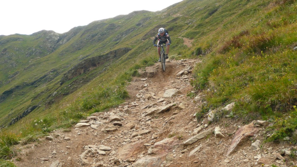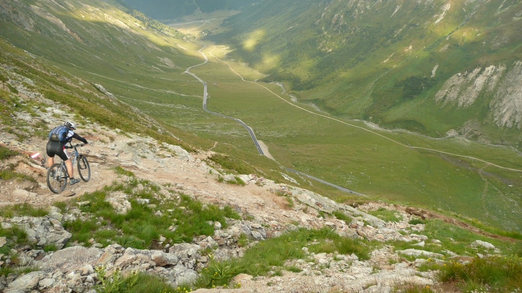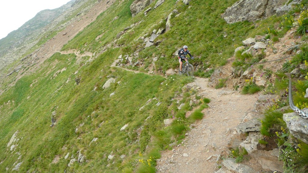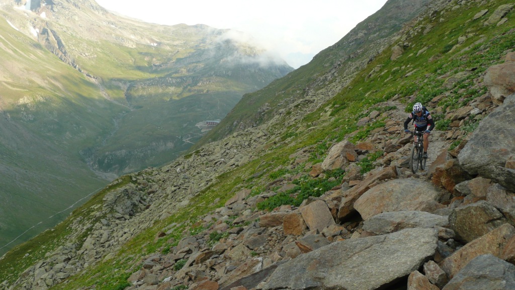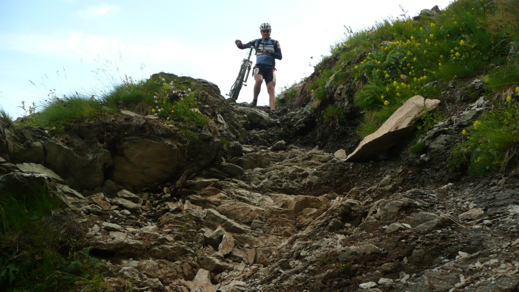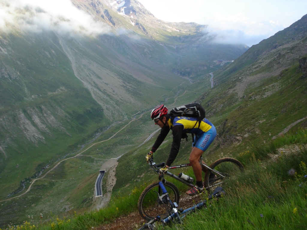 Na záver sa stáva technicky veľmi náročným. Nie pre jeho strmosť, ale pre veľké balvany. V podstate je to tak na hrane, čo sa ešte dá šľapať. Keď už je sedlo na dosah, šípka usmerňuje cyklistov doprava a odkláňa nás tak trošičku vedľa. Toto sedlo vraj používalo veľa cyklistov pri akciách Transalp, no v hornej časti na pôvodnej trase je chodník nezjazdný. Preto urobili Švajčiari túto úžasnú vec, a pre cyklistov vybudovali chodník vedľa. Tento však nie je nijako vyumelkovaný a je vidieť, že ho robili ľudia, ktorí tomu rozumejú. To čo tu vedie celou dolinou, si je ťažko predstaviť človeku, ktorý doteraz jazdil len po rozrytých slovenských lesoch. Vypľuje vás to pri Bikehoteli. Tu má cyklista k dispozícii minidielničku, veľkú pumpu s tlakomerom a možnosť vyvaliť sa na trávu a len tak si polebediť. Zjazd pokračuje veľmi rýchlou jemnou šotolinou a končí na hlavnej ceste vedúcej na Forcola di Livigno. Tu si už zaslúžime obed pred posledným kopcom.