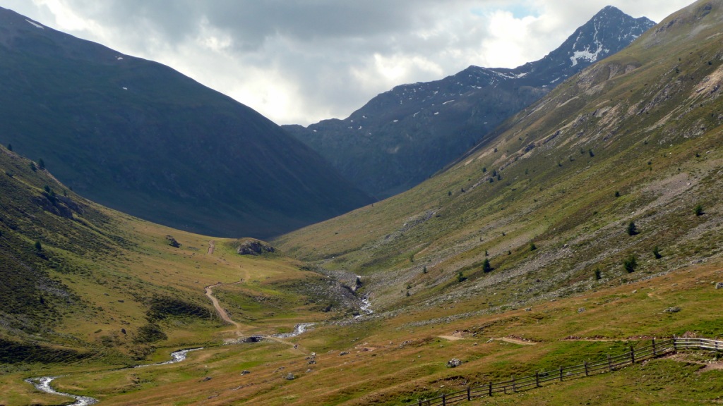 Vlado s nami dnes už zo sedla nepokračoval. Ostal sa celý deň motať po singletrackoch nad Livignom. V Trepalle odbočujeme s Janom doprava do doliny La Vallaccia. Je to pomerne široká a dosť dlhá dolina. Dolinou vedie úzka asfaltka, ktorá sa za posledným statkom mení na šotolinohlinu, a tá sa zas po chvíli mení na turistický chodník. Tu chodník už nie je príjemný na šľapanie, lebo vedie popri potoku , vo svahu, po balvanoch a po veľkých trsoch trávy. Čiže záverečná časť doliny sa ide s bicyklom na pleci. Prostredie je však nádherné. Dolina je úplne trávnatá a trocha mi pripomína okolie Carauntohillu v Írsku. Keď sa naše pohľady prehupli cez sedlo, naplnili nás pocity šťastia. Ukázali sa trojtisícovky s ľadovcami. Nezabudnem, ako majestátne pôsobili. Pokrátkom doplnení energie začíname zjazdovať. Opäť to nie je len taký obyčajný zjazd. Z Passo della Vallaccia (2614m.n.m.) na križovatku s cestou do Val Viola o 700m nižšie. Úvod po kameňoch, potom strmým chodníkom s voľnými kameňmi, potom po hladkej hline v tráve a na záver veľmi rýchla šotolina, kde sa len tak práši. To všetko technicky náročné, s nádhernými výhľadmi. Rýchla šotolina skončila, keď sa stretla s asfaltkou vedúcou k Rif. Val Viola. Tento výšľap je vcelku mierny v nádhernom prostredí popri jazerách. Celý čas je čo obdivovať.