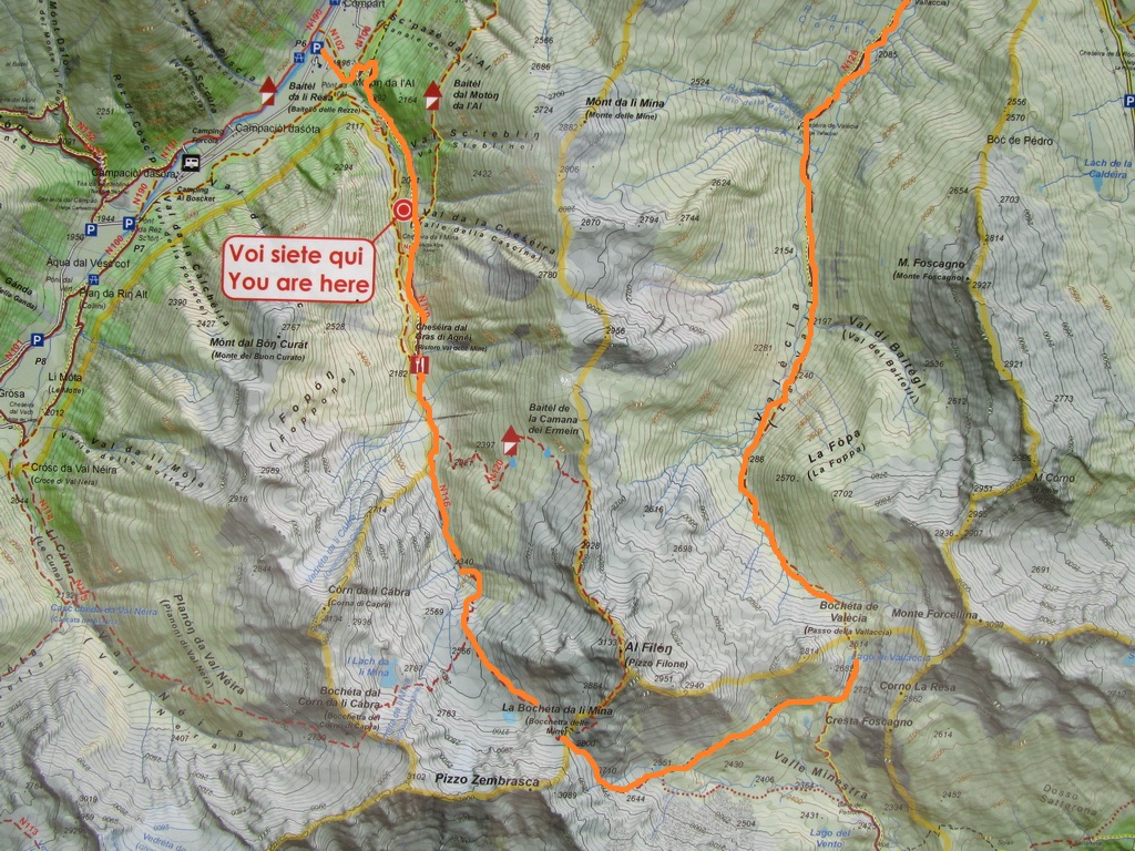 Livigno (údolie) - Val delle Mine - Bocchetta di Mine - Val Minestra - traverz - Passo Valécia - Trepale - Passo dEira - traverz singltrailom popod Motolino - Val delle Mine - Livigno (údolie)