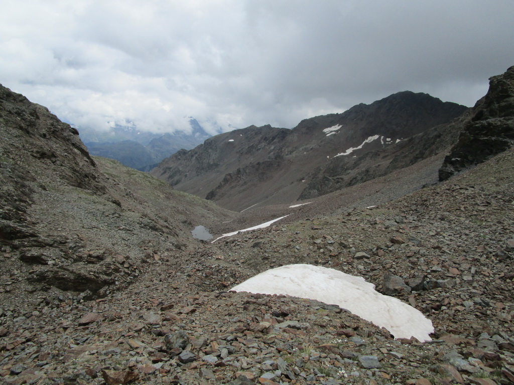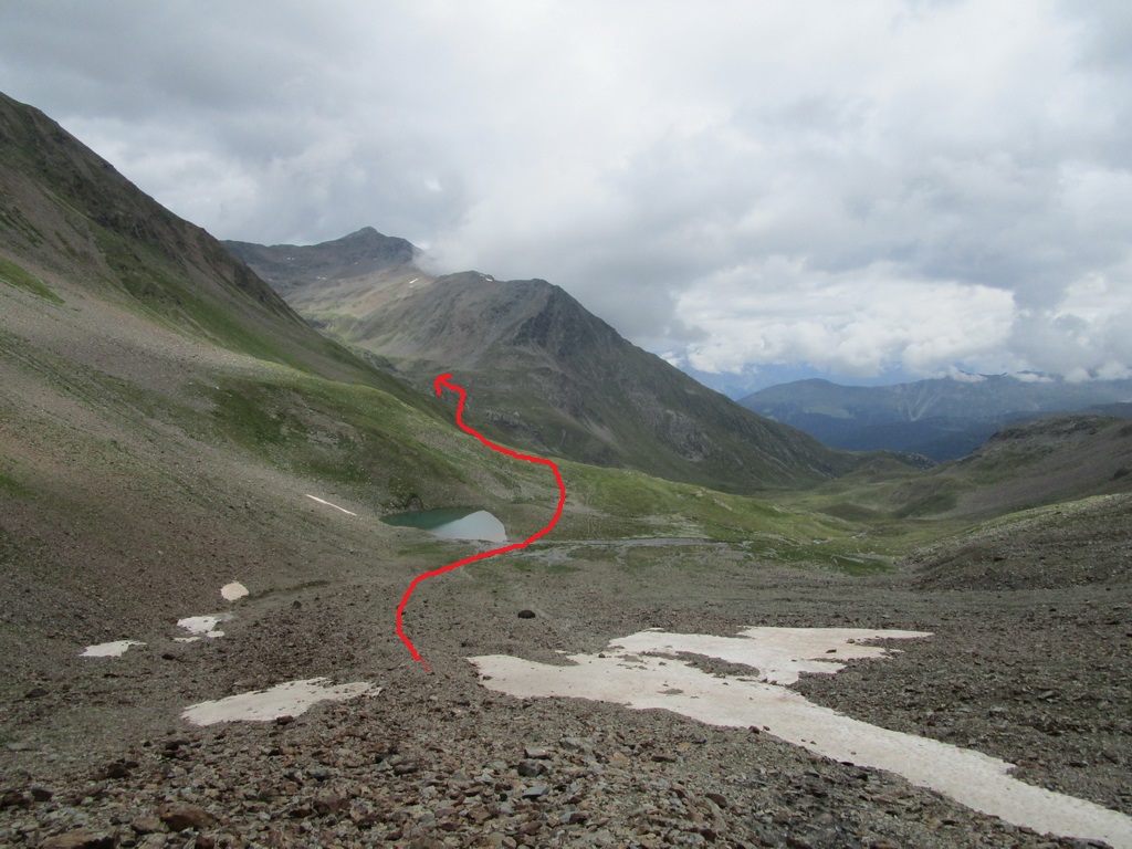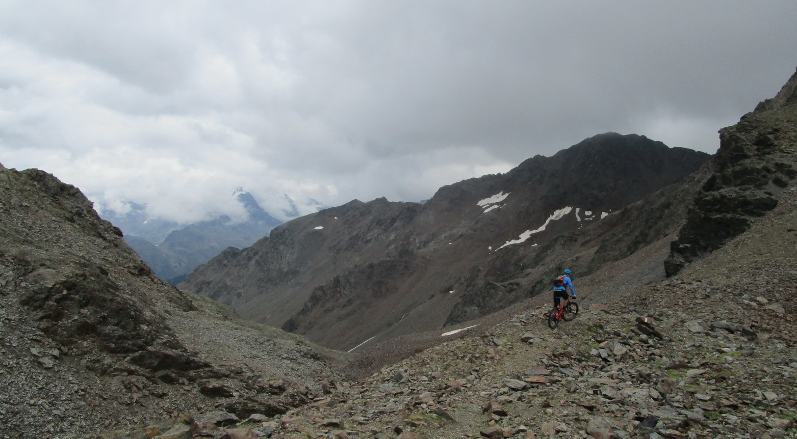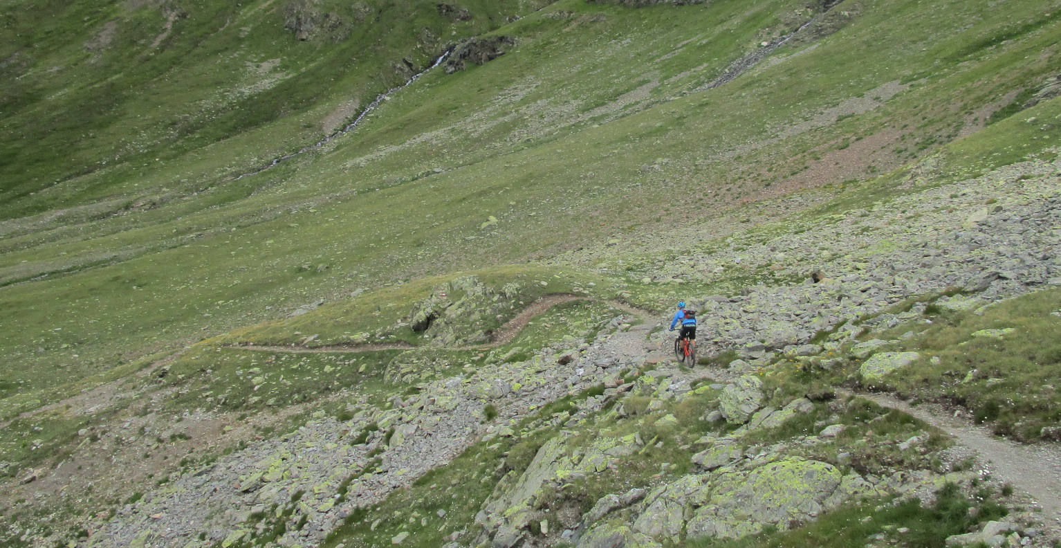 Zjazd zo sedla na druhú stranu netrvá dlho a musím zosadnúť. Začína najnepríjemnejšia časť túry. Ťažko vytlačené výškové metre schádzam peši vedľa bajku. Bohužiaľ úsek je úplne nezjazdný. Na bajk naskakujem opäť až kus nad jazerom vo val Minestra. Tu už je terén opäť zjazdný. Nachádzam odbočku smerom na traverz pod sedlo Valécia.