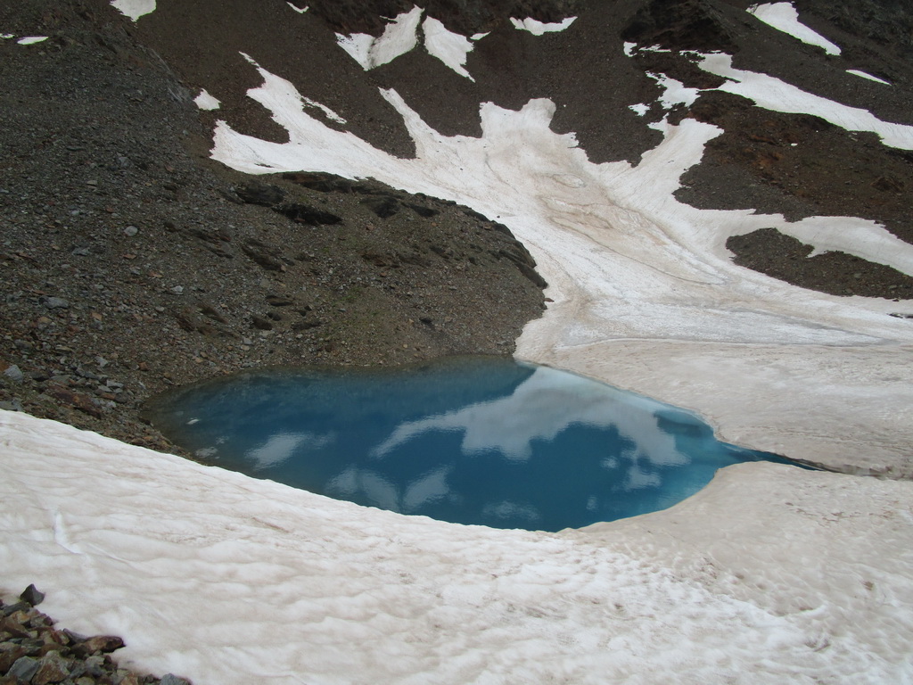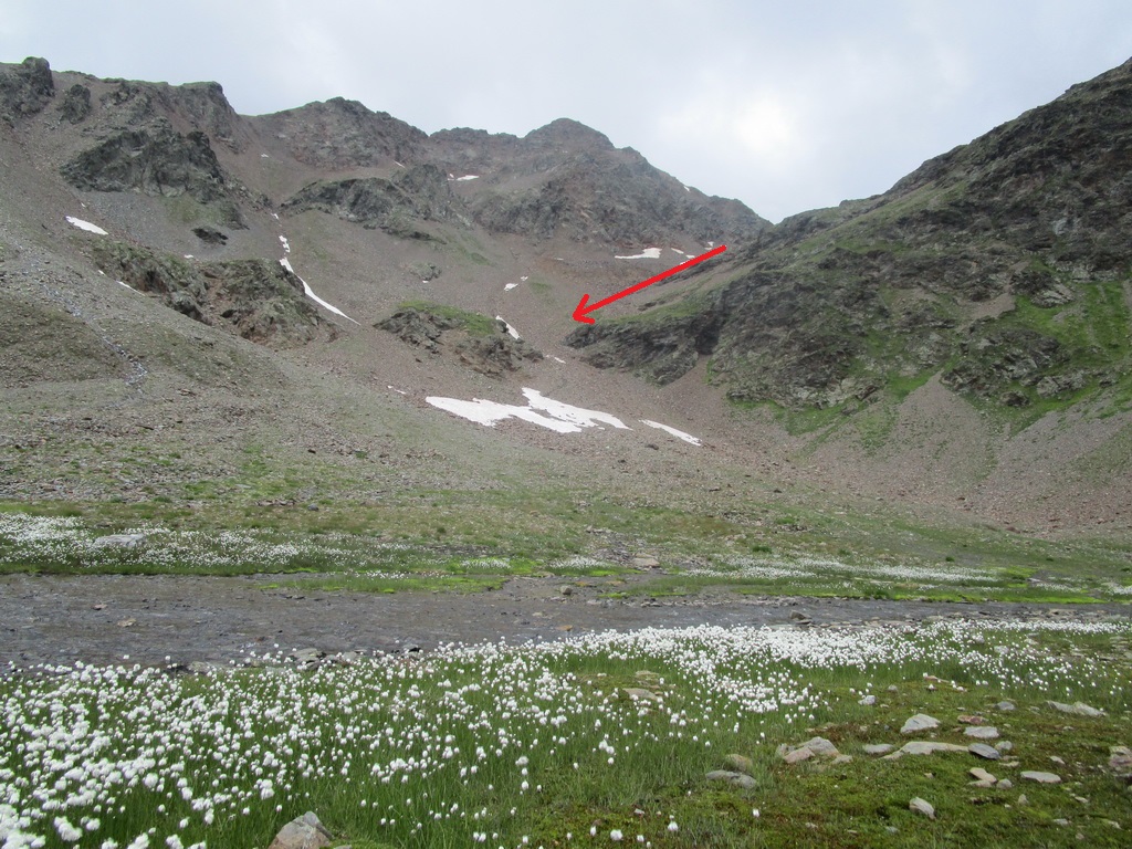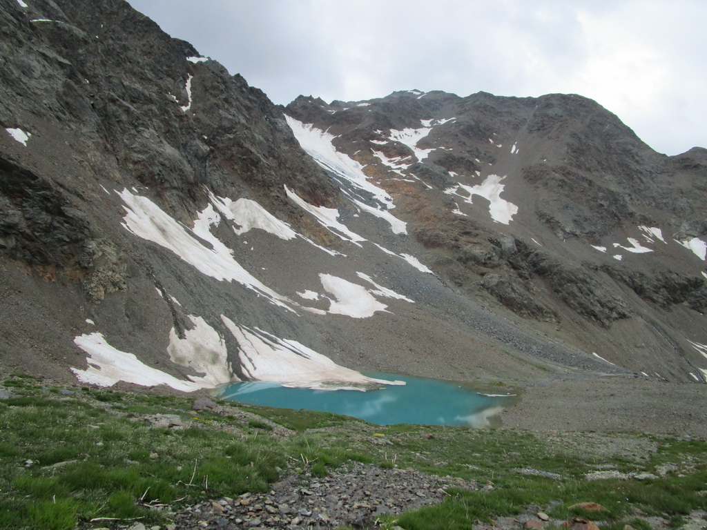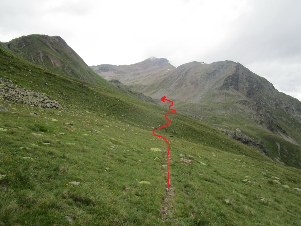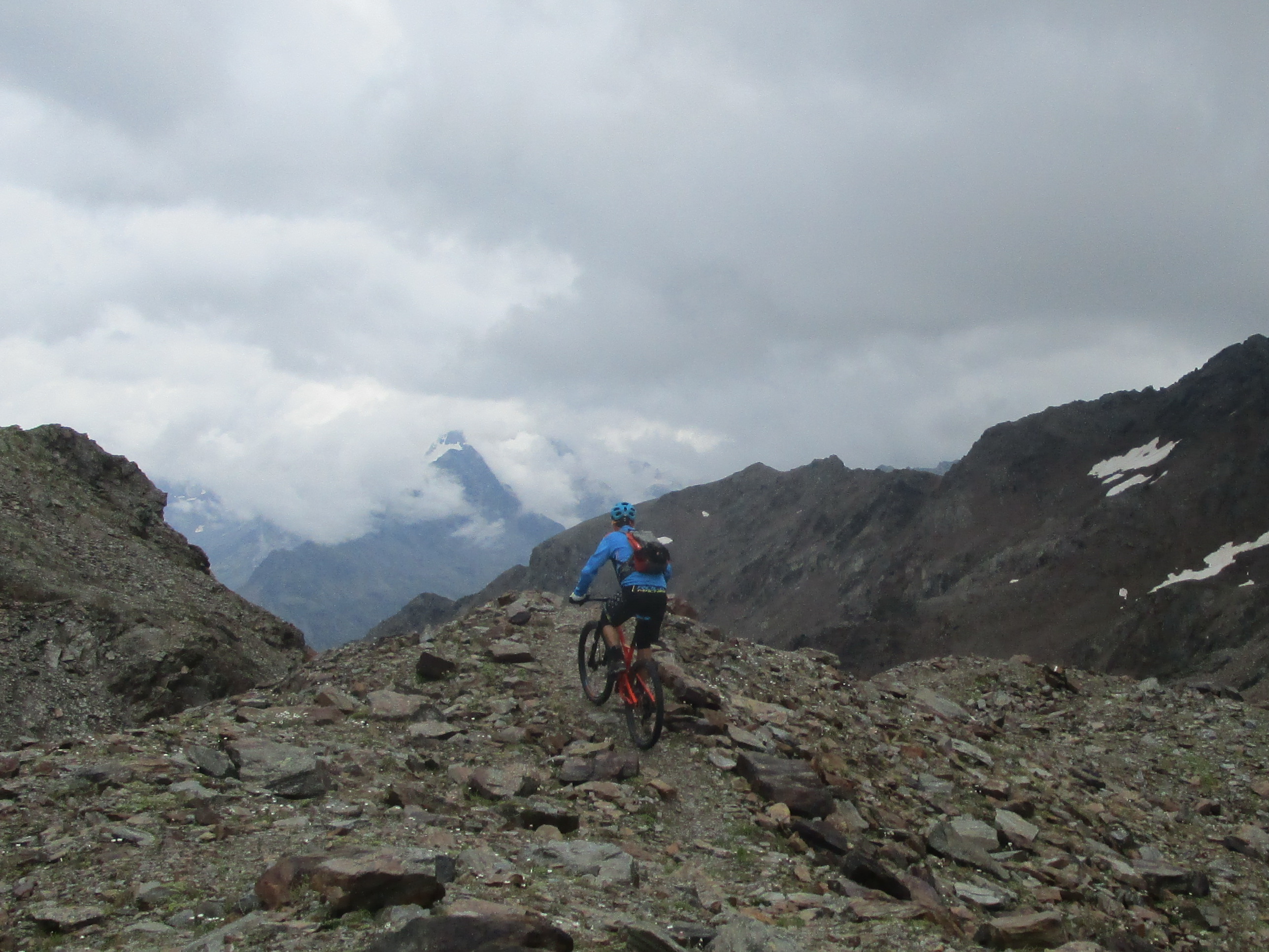 Zjazd zo sedla na druhú stranu netrvá dlho a musím zosadnúť. Začína najnepríjemnejšia časť túry. Ťažko vytlačené výškové metre schádzam peši vedľa bajku. Bohužiaľ úsek je úplne nezjazdný. Na bajk naskakujem opäť až kus nad jazerom vo val Minestra. Tu už je terén opäť zjazdný. Nachádzam odbočku smerom na traverz pod sedlo Valécia.