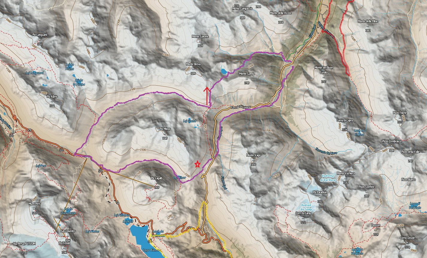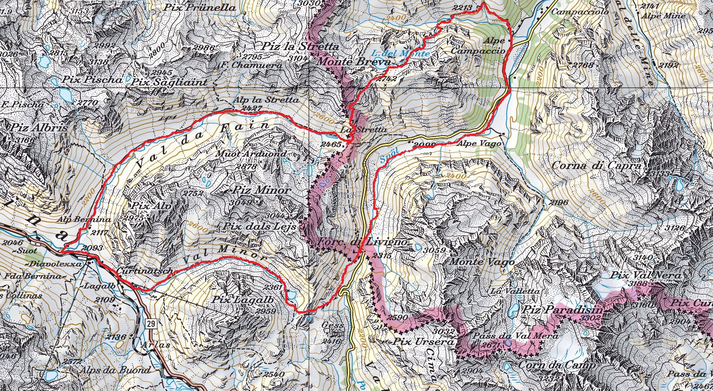 Pri Lagalbe sa napojíte na asfaltovú cestu v smere dole do Pontresiny/St.Moritzu. Po asi dvoch kilometroch odbočíte doprava na šotolinovú cestu do Val de Fain. (Turistická značka) Touto dolinou vedie príjemné stúpanie až do sedla Stretta. Vodu si dočerpajte pri kravíne, budete prechádzať okolo napájadla :)
