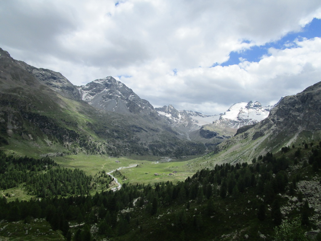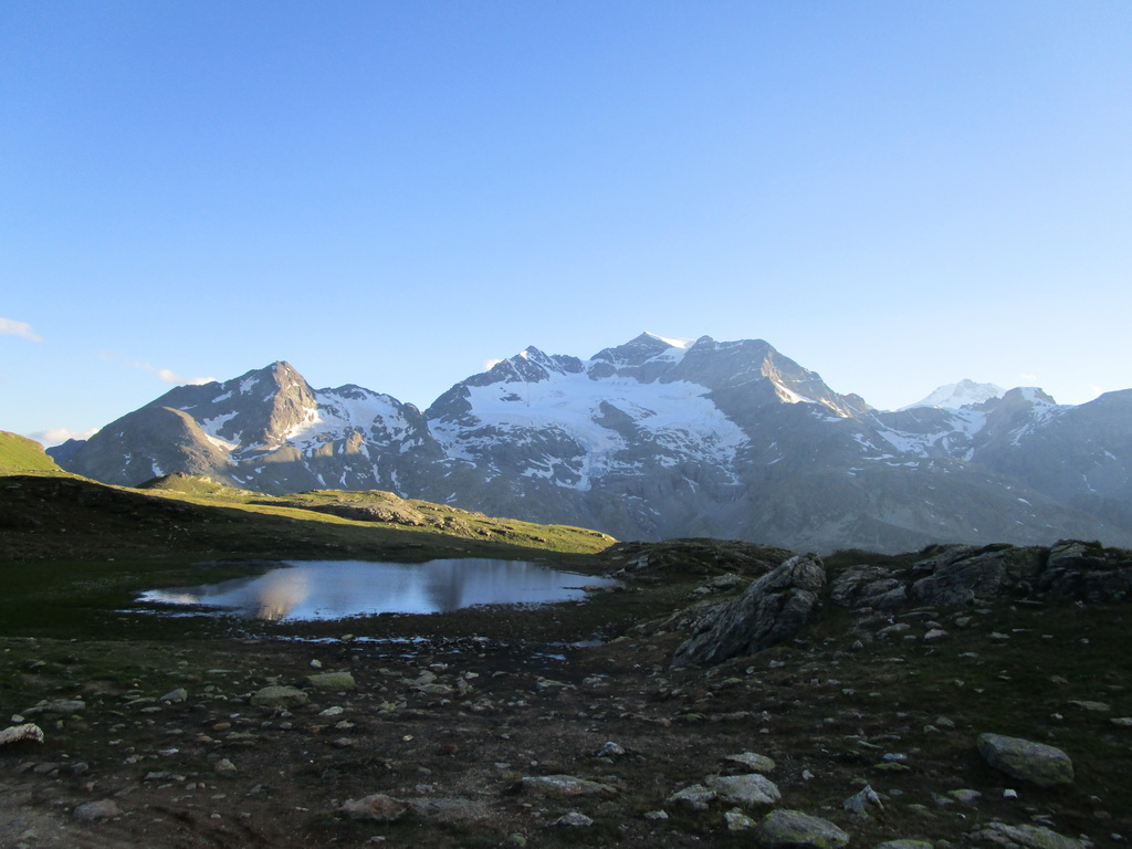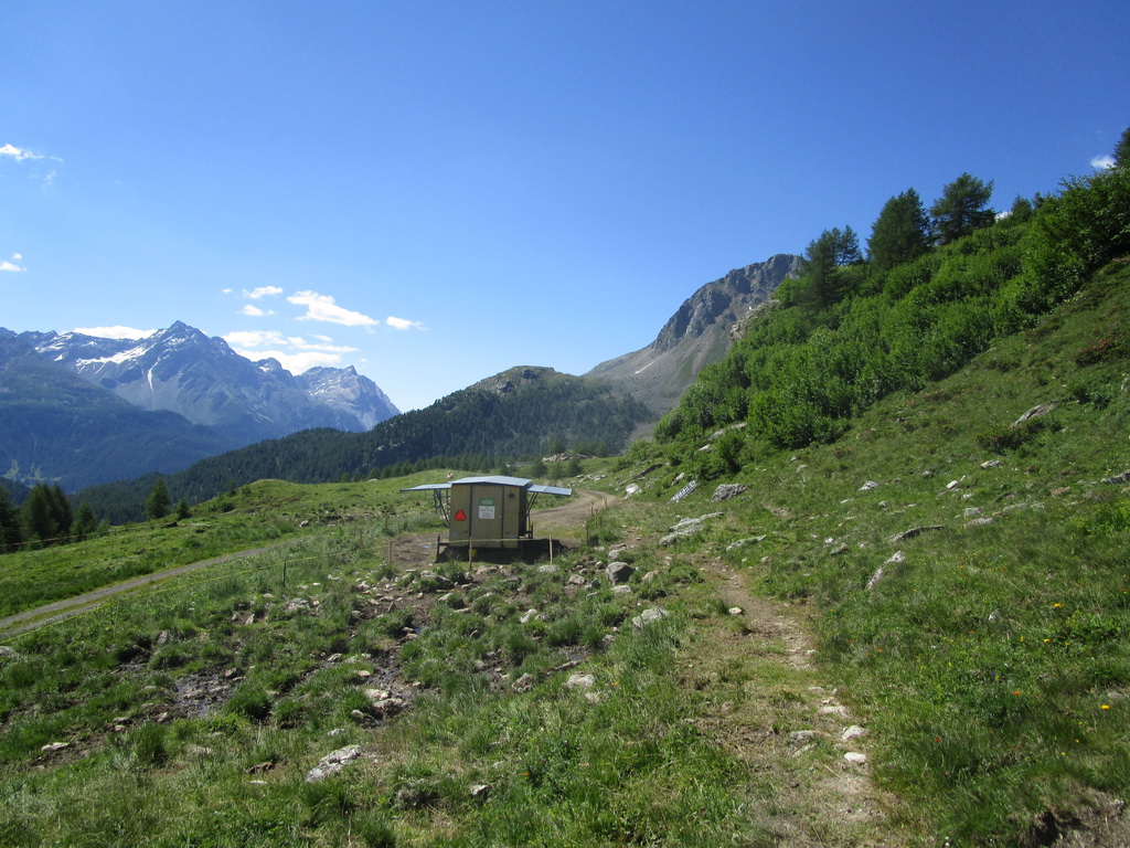 Ráno som zaparkoval pod passom Bernina na bezplatnom parkovisku a vyrážam. Z passo Bernina kam som vyšiel po asfaltke odbočujem doprava na označenú biketrasu. Málokedy začínam túru hneď parádnym zjazdom. Pri križovaní hlavnej cesty treba spozornieť, môžu vzniknúť orientačné problémy. Kto ale kukne aj do mapy bude v pohode. Singltrail je totožný s červeno značeným turistickým chodníkom.