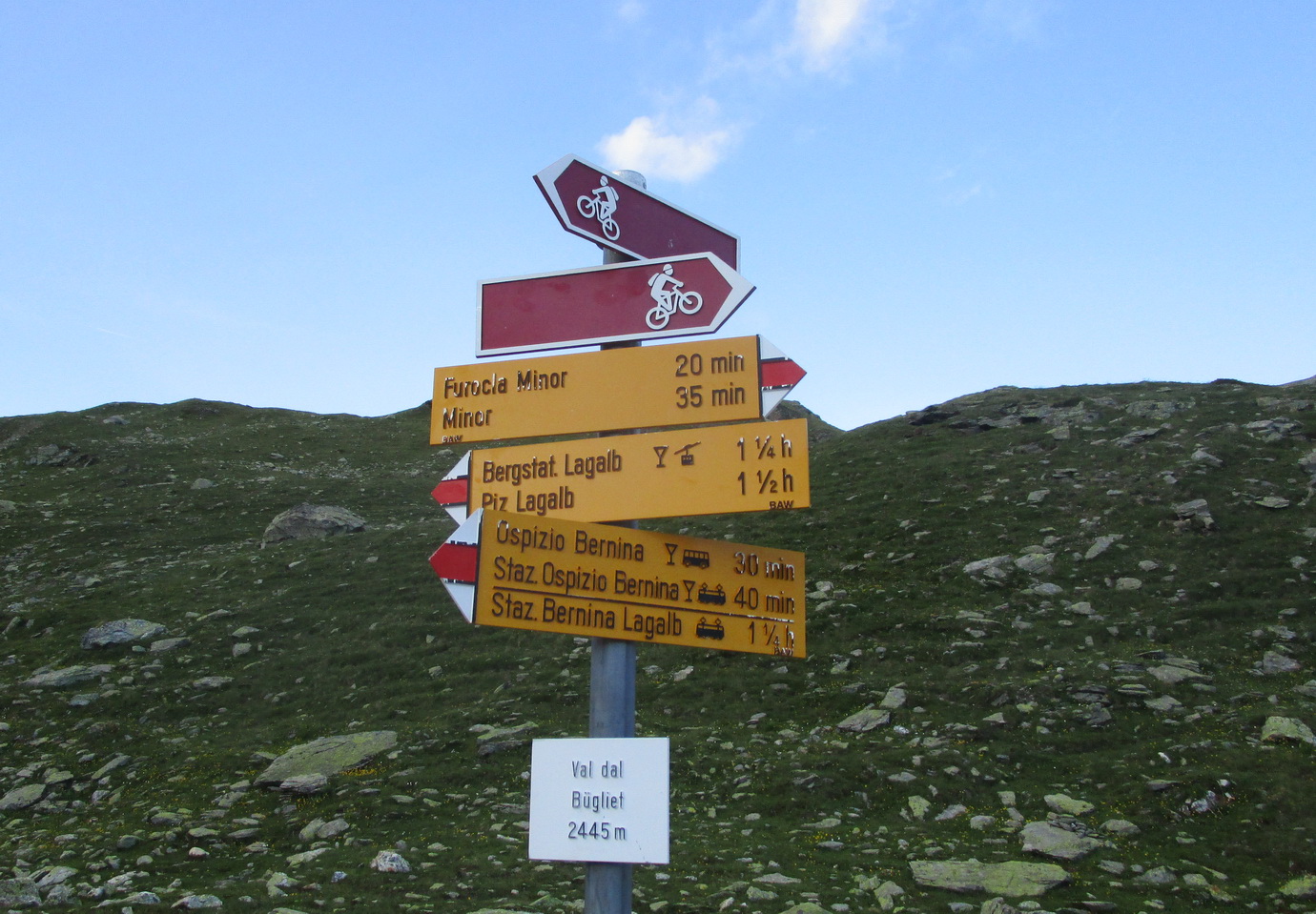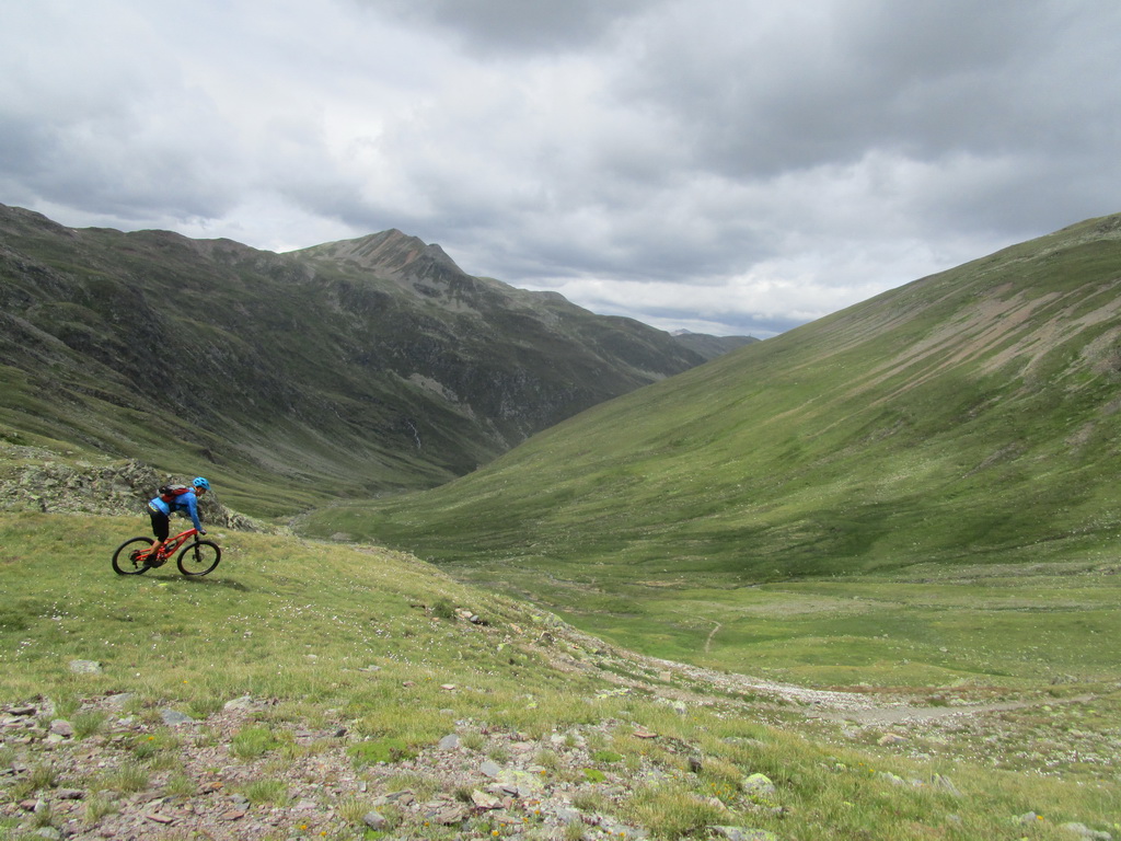 Kto by mal veľa síl a času: Dolinou Val Minor vedie ťažký a dlhý zjazd až ku stanici lanovky Lagalb. Ja však idem na passo Bernina. Občas trošku potlačím, po prehupnutí sa cez kopček následuje zjazd chodníčkom. Krásny singl, ako v podstate väčšina dnešného dňa.
