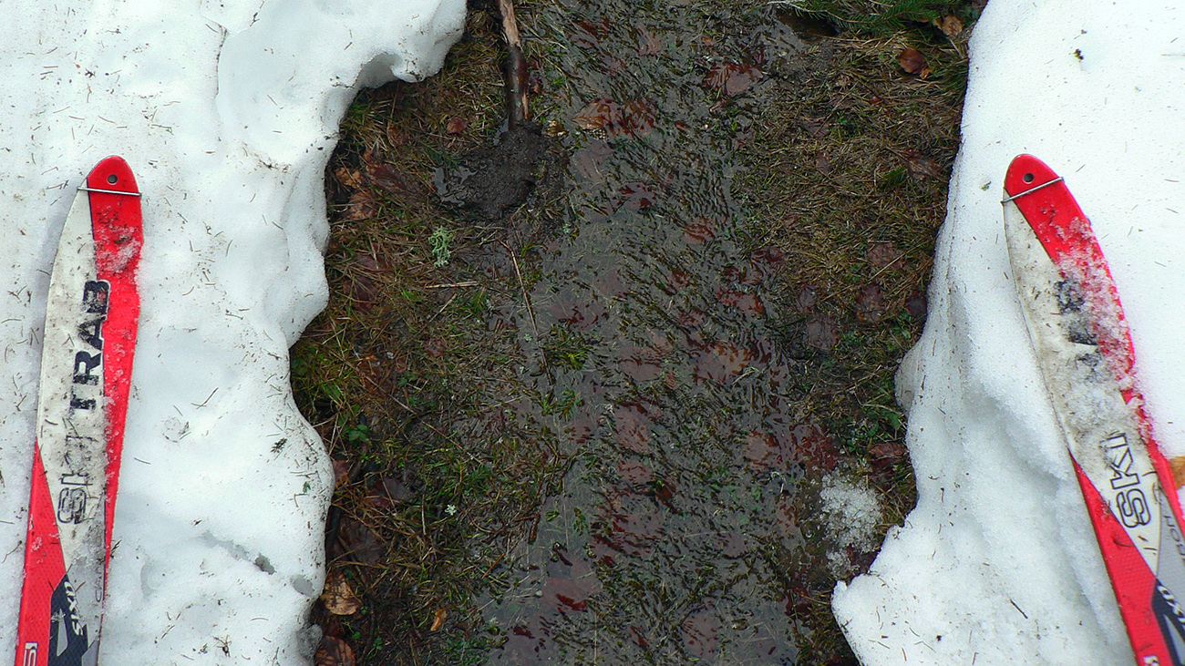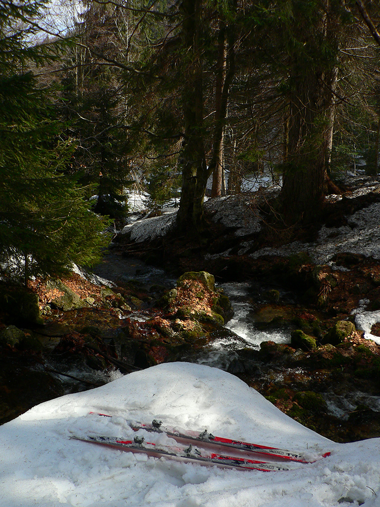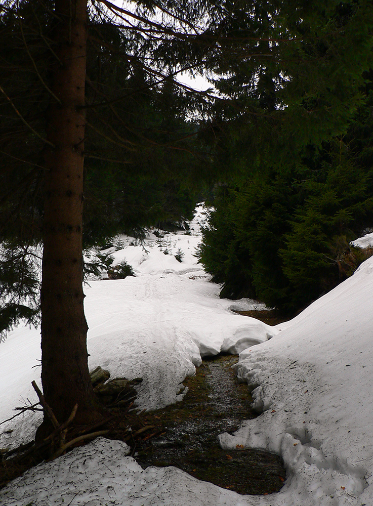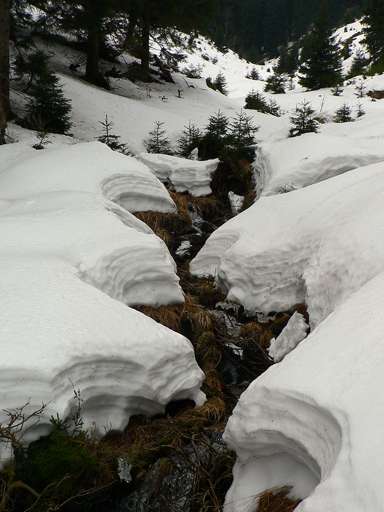 Až von z lesa pri potoku čistejšie pod pásmi, ale zase prehnitá mokrá firnová kaša a na potoku kadejaké divokrásne erózne tvary v topiacom sa snehu. V strmine len zachovaná stará stopa ostala pevnejšia, aj medvedie stopy išli pekne cik – cak po nej hore na hrebeň. No čo sa bude Jogi zabárať? Zlyžovať nazad by sa to dalo, pomedzi stromy a konáre miesta ešte dosť. Len úplne hore už sa to poriadne prepadalo do čučoriedok.