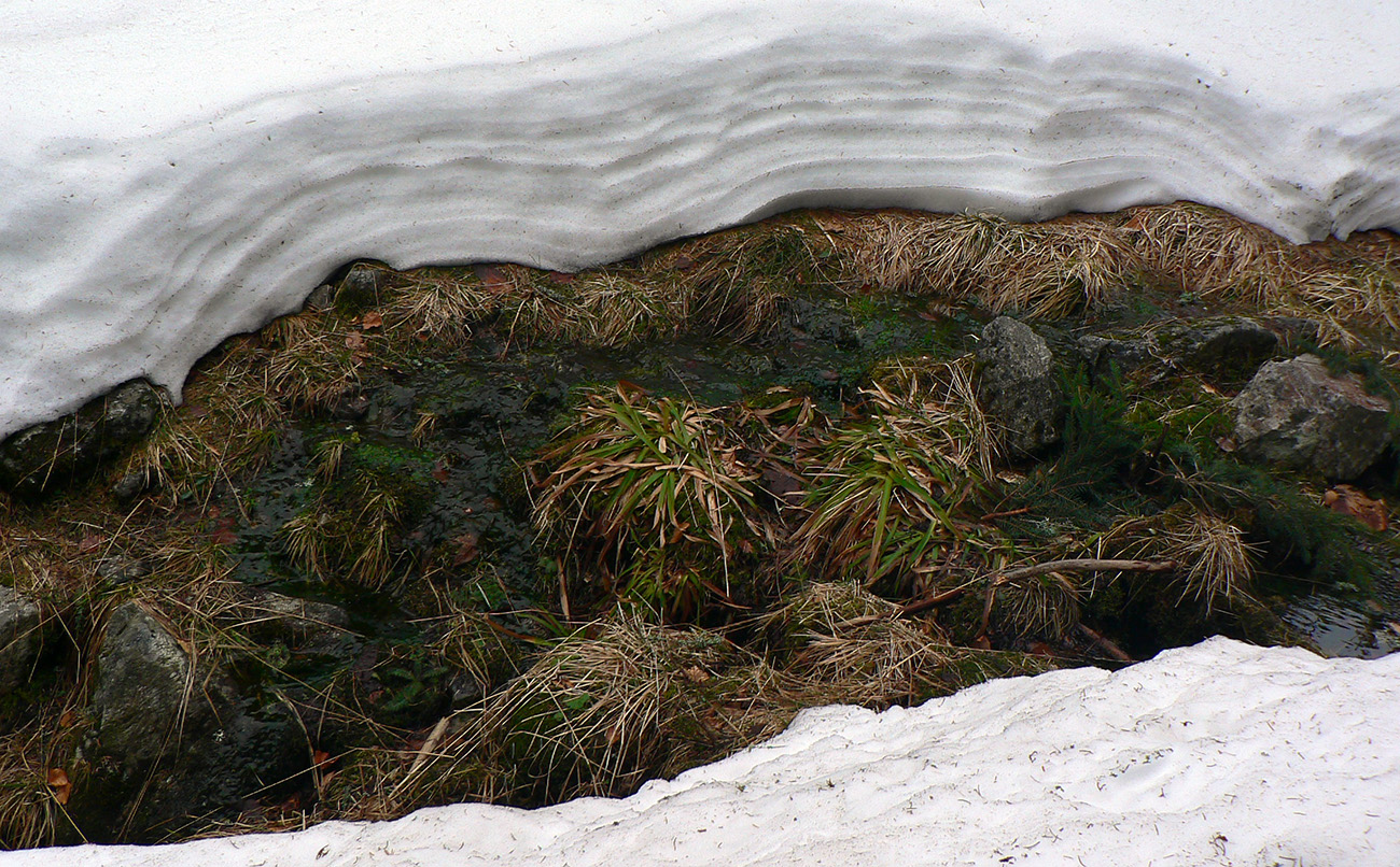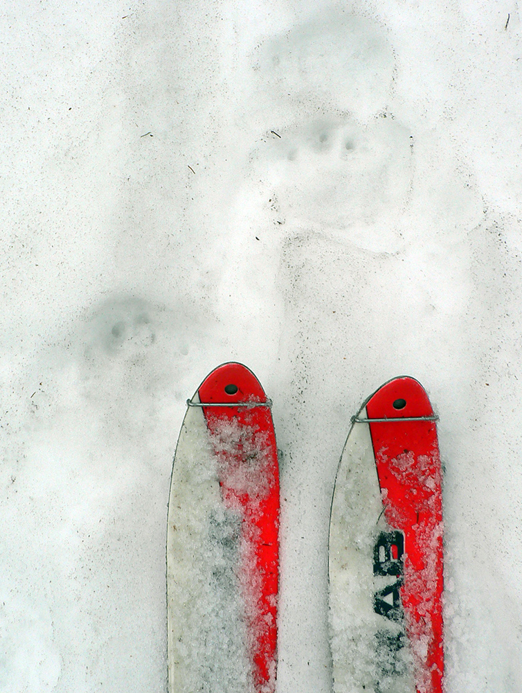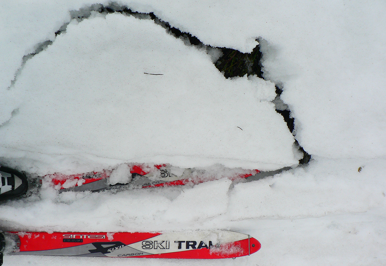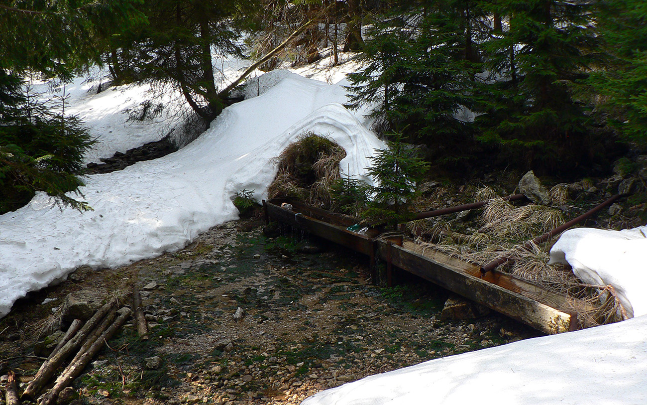 Až von z lesa pri potoku čistejšie pod pásmi, ale zase prehnitá mokrá firnová kaša a na potoku kadejaké divokrásne erózne tvary v topiacom sa snehu. V strmine len zachovaná stará stopa ostala pevnejšia, aj medvedie stopy išli pekne cik – cak po nej hore na hrebeň. No čo sa bude Jogi zabárať? Zlyžovať nazad by sa to dalo, pomedzi stromy a konáre miesta ešte dosť. Len úplne hore už sa to poriadne prepadalo do čučoriedok.