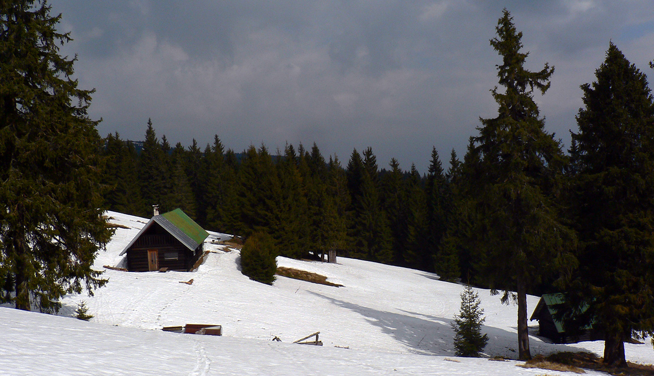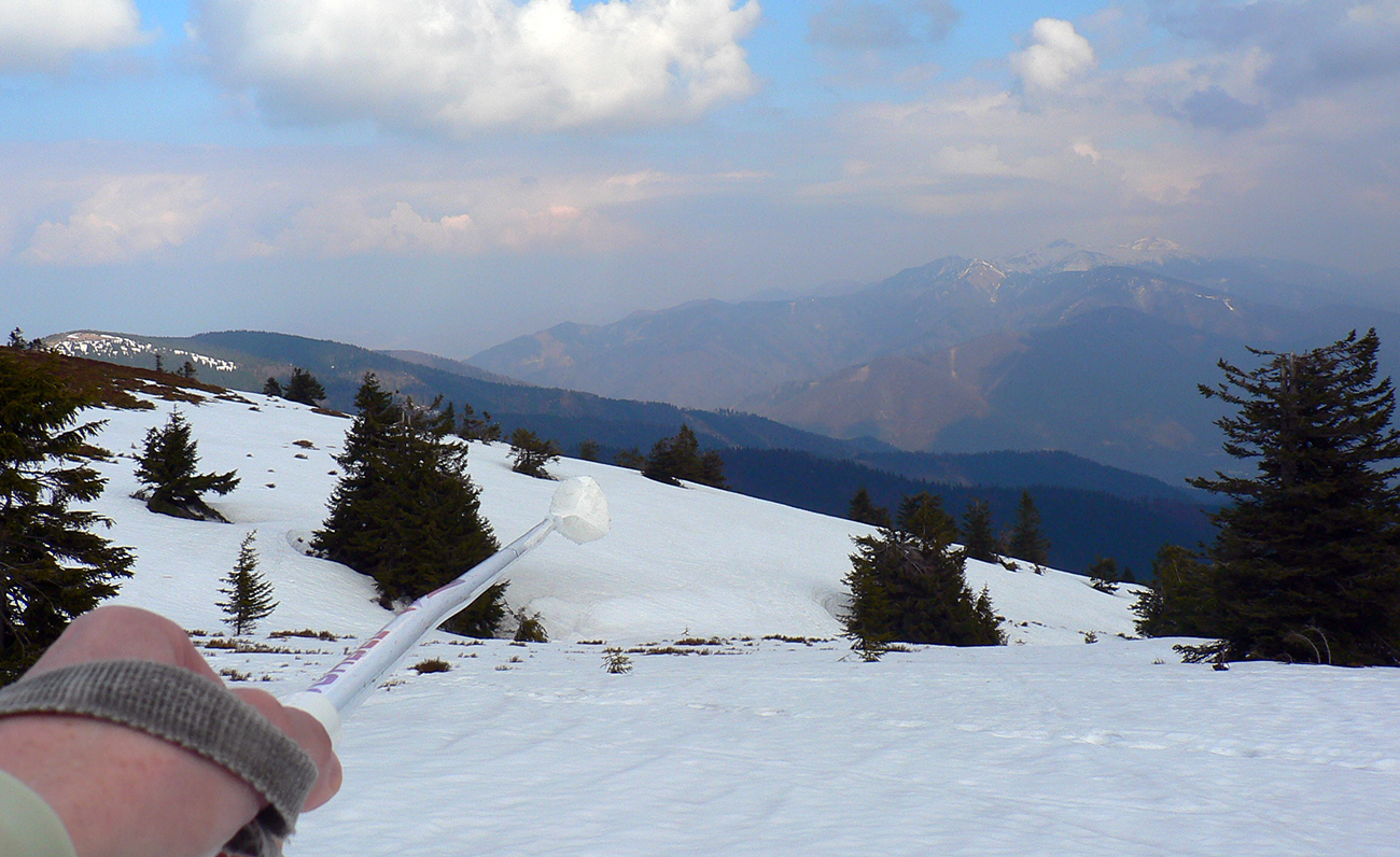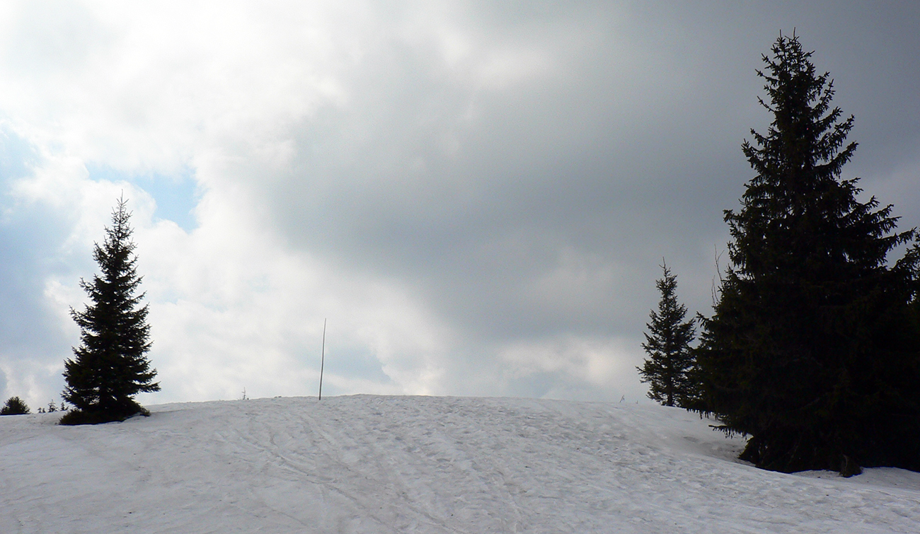 A potom už len presun poza vysielač k vleku „Céčku“ a pokus o dáke oblúky v tom kašane. Lyžovačkou sa to nedalo nazvať, zato preskakované oblúky pomedzi vývraty, pne a haluze dole v lese, tie boli ako v úzkom tatranskom žľabe. Dočasne ma zastavilo bralo na strete dolín a definitívne sútok potokov o pár metrov nižšie. Ale to už spoza stromov presvitala zasnežovacia čerpačka.