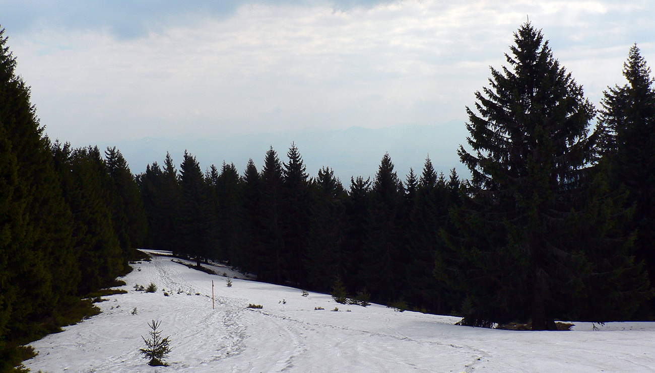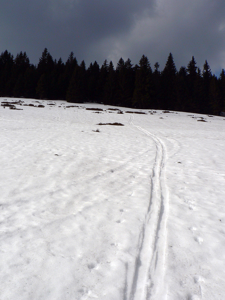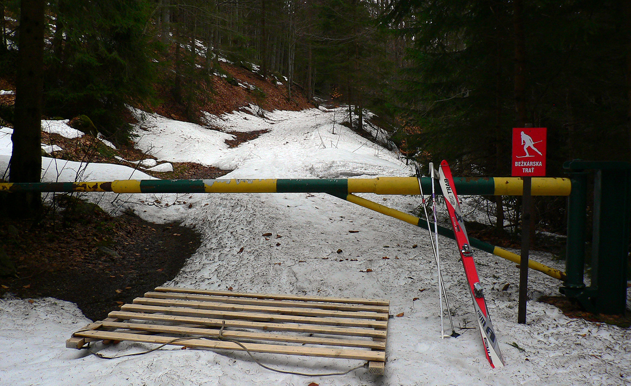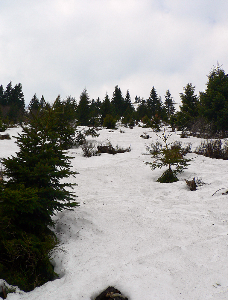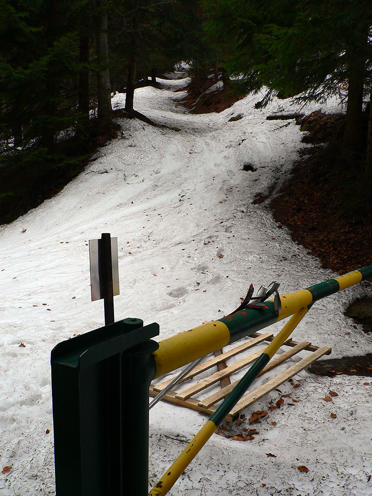 Po zaparkovaní na mokrom ľade, pred obutím lyžiarok, som pre istotu zašiel za zákrutu skontrolovať sňahy. Hnusné, špinavé, vodnaté, samozrejme. Ale dosť, zdalo sa. Jedna dvojka sa vybrala po zvážnici smerom k Dlhej lúke. Potom neskôr pri stretnutí hovorili, že niesli asi 400 m hneď za prvou zákrutou (predsa len, je to južný svah). Aby som a im tam nemotal, vyrazil som opačne, lesom proti prúdu, priamo pod Zázrivú. Preniesť som musel asi 50 m, potom už sa dalo a s výškou sa to lepšilo, len špiny neubudlo. Ani na zvážnici.