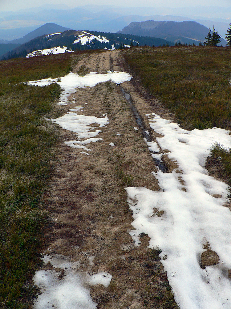 Hrebeň na Šíravách (Zázrivej) zlízaný, treba podchádzať. Ale hrebeňovka smerom k Minčolu ešte bez problémov, až na tú špinu zase. Hádam by to šlo aj bez pásov, sklz nula. Až na Minčol som ale nedošiel, vršok už je samozrejme holý, tak som to na konci lesa otočil a na pásoch nazad, nech si užijú. Ani z kopca to moc nešmýkalo.