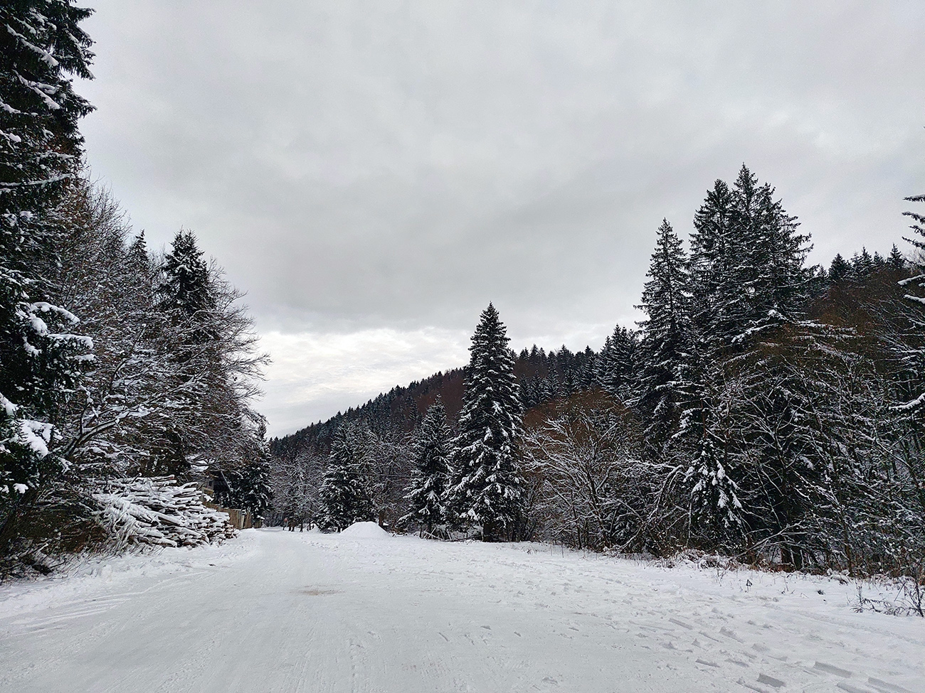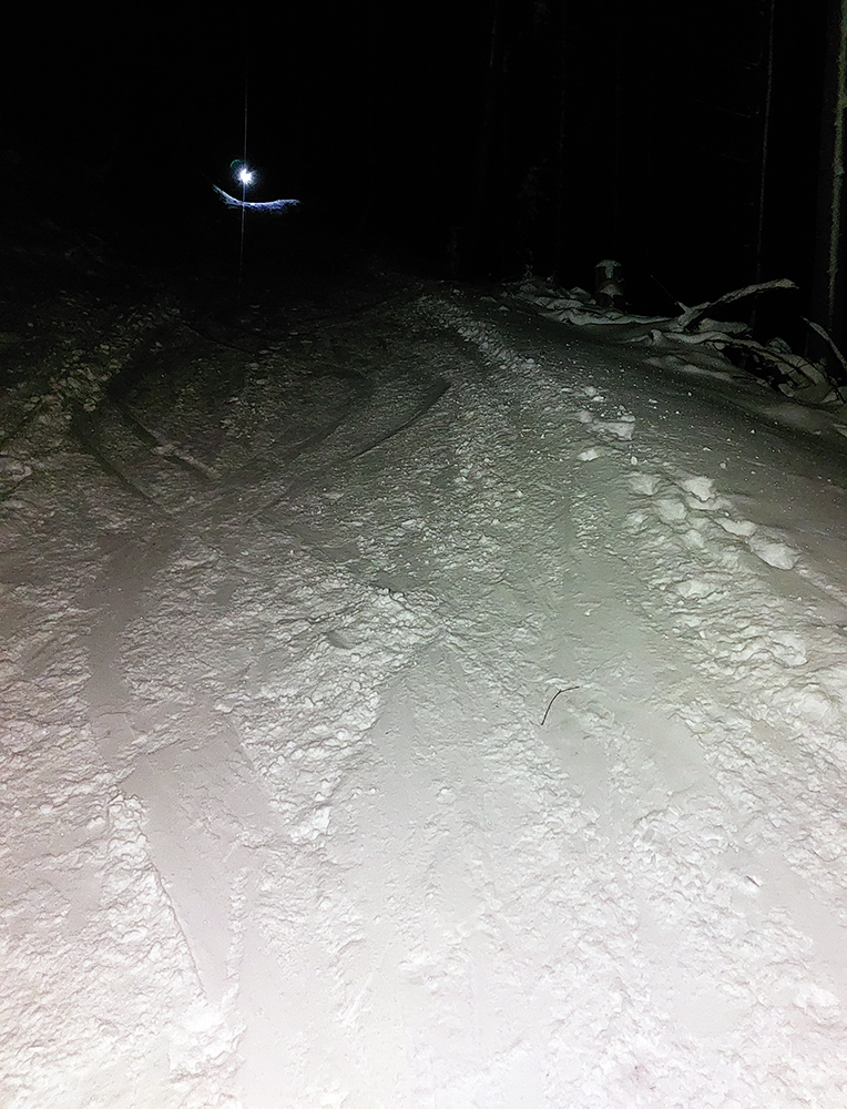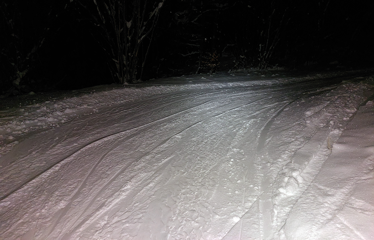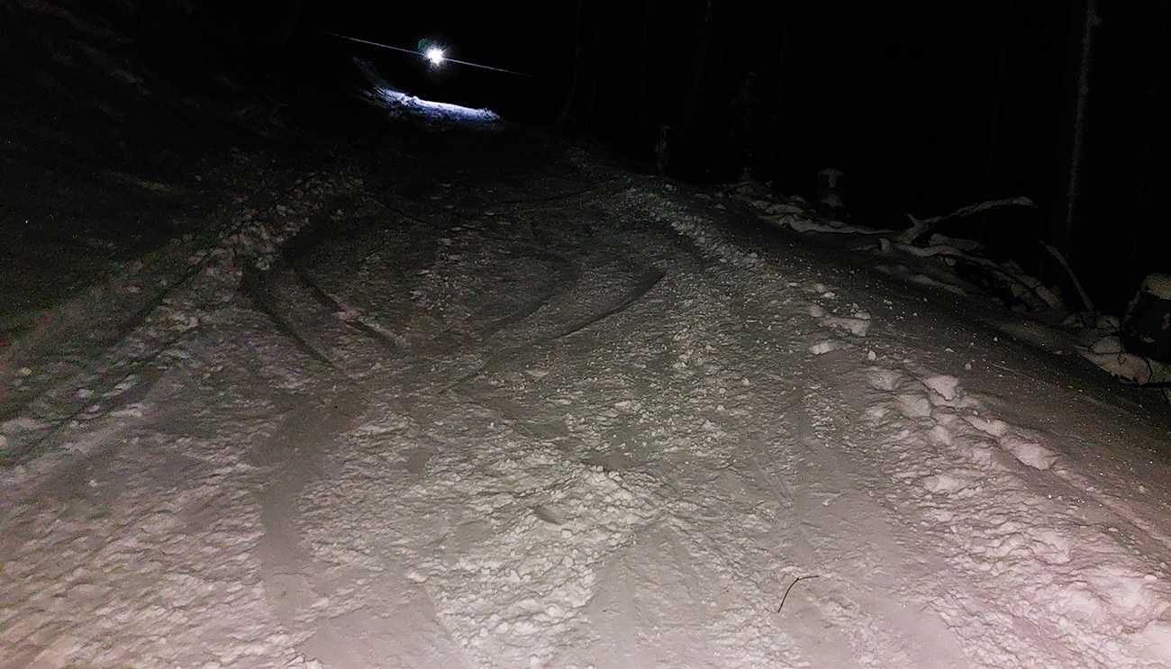 Zvážnica použiteľná na opatrné oblúčiky, lebo podklad udupaný. Brzdiť sa dá aj jemne na okrajoch v hlbšom snehu, tam však pozor na ukryté žraloky. V strede cesty striehnu menšie pirane, ale tie zas lepšie vidno. Zákruta v pohode, pod ňou treba opatrnejšie – ako je to tam strmšie, pirane viac vystrkujú hlavičky.