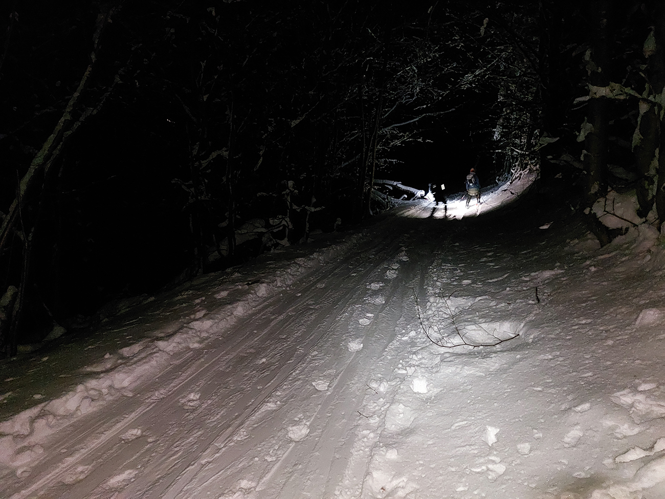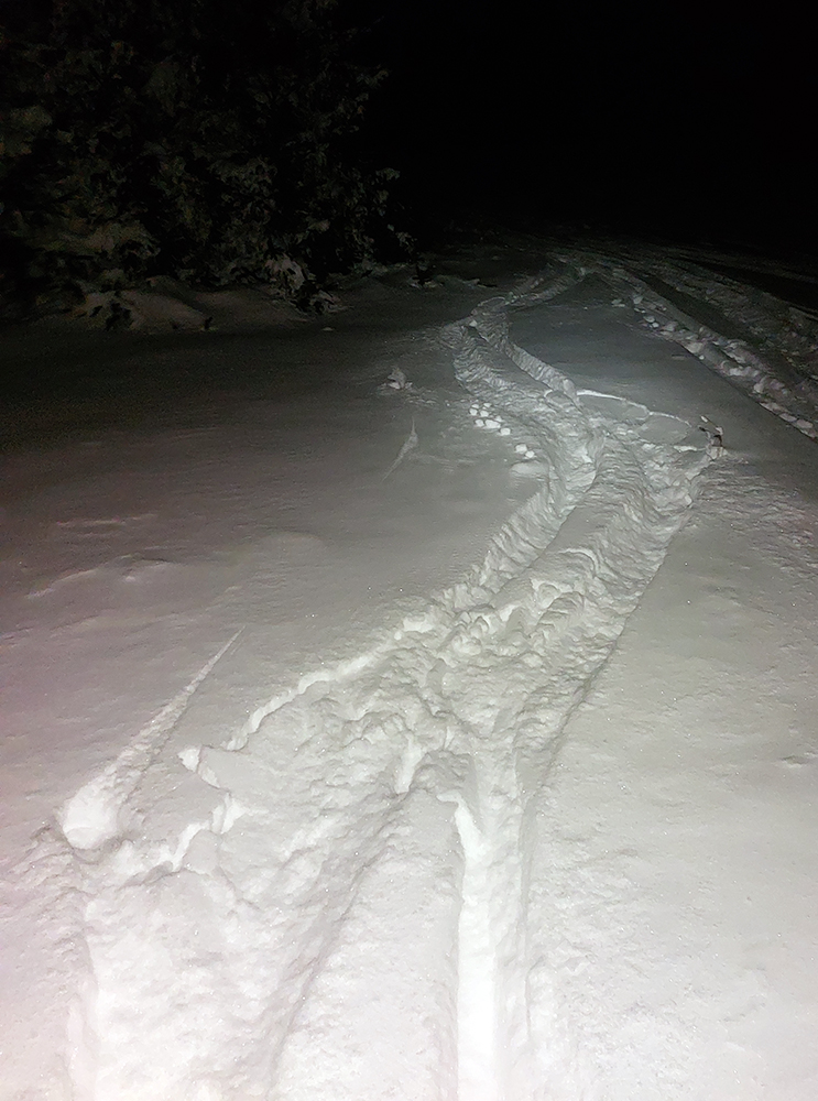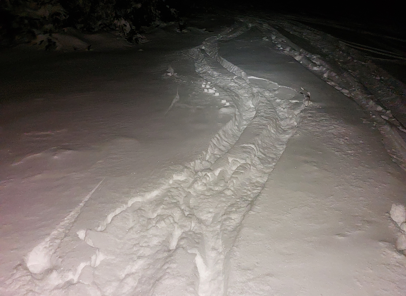 Zvážnica použiteľná na opatrné oblúčiky, lebo podklad udupaný. Brzdiť sa dá aj jemne na okrajoch v hlbšom snehu, tam však pozor na ukryté žraloky. V strede cesty striehnu menšie pirane, ale tie zas lepšie vidno. Zákruta v pohode, pod ňou treba opatrnejšie – ako je to tam strmšie, pirane viac vystrkujú hlavičky.