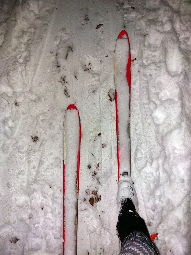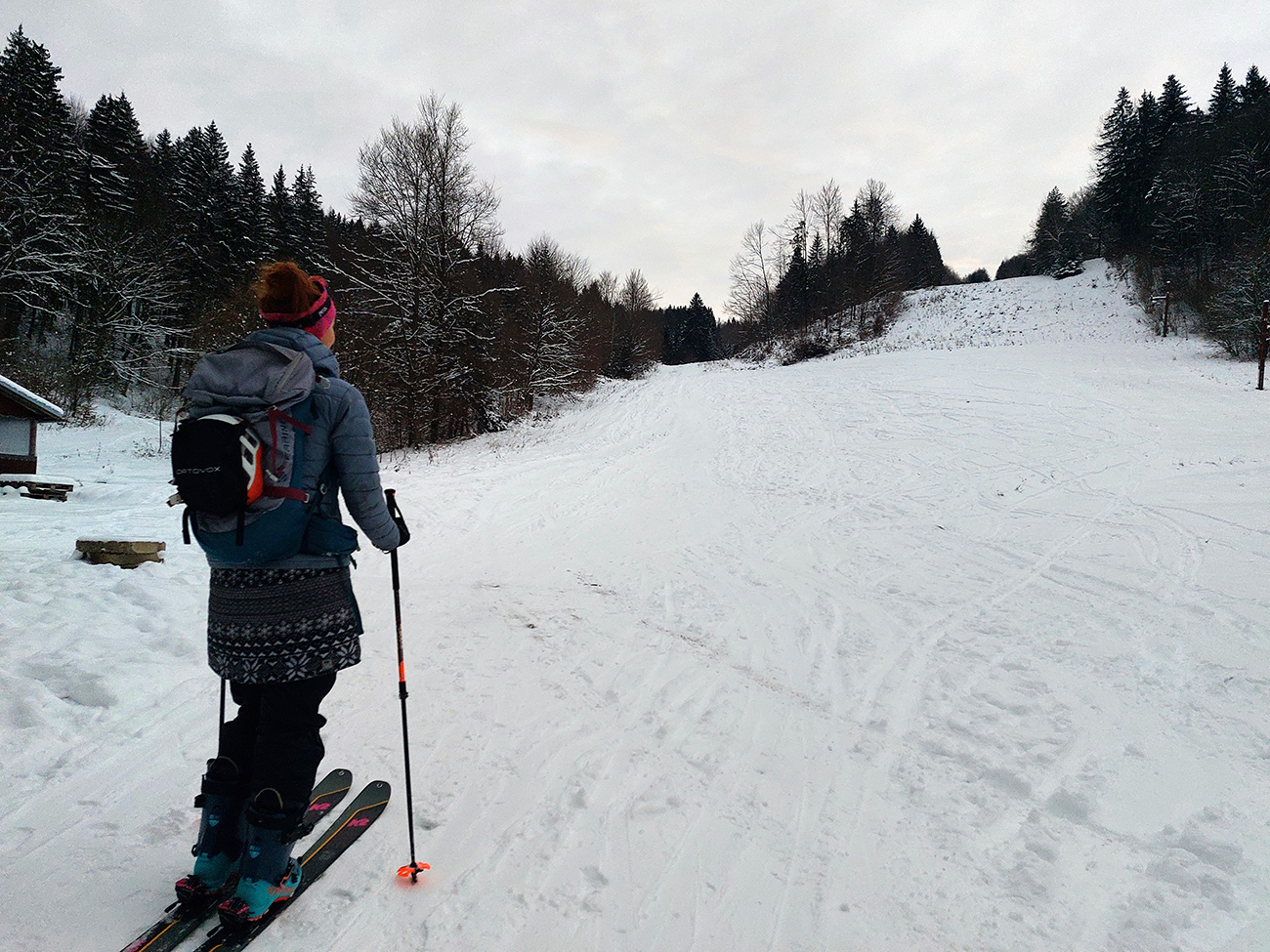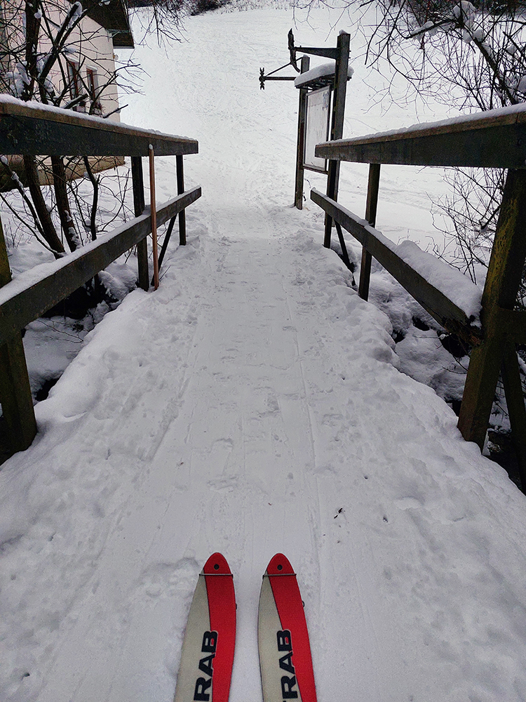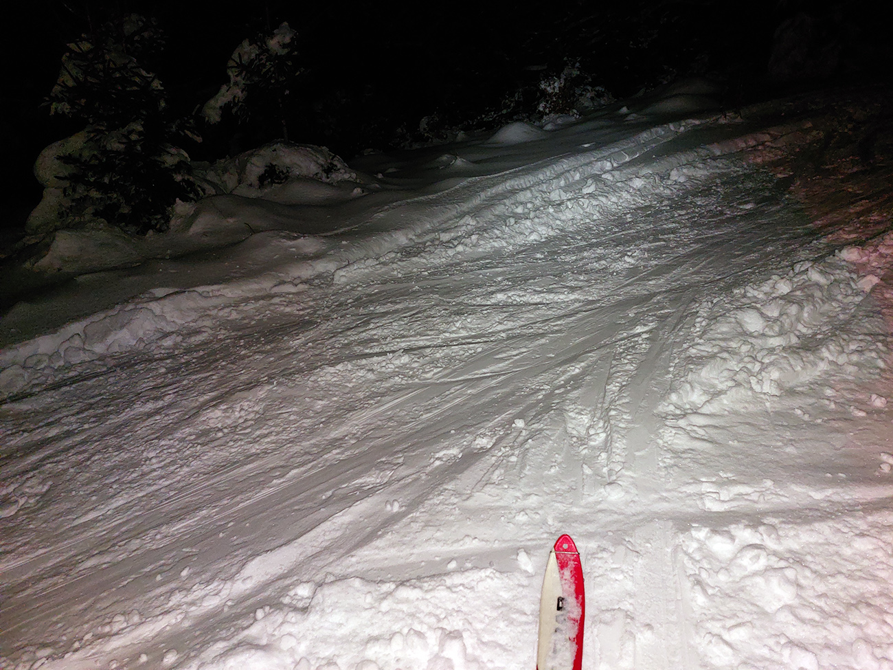 Po zjazdovke dole najlepšie tade, kade sa hore chodí – síce je to rozryté, ale trčí väčšinou tráva a vidno ju, brzdiť sa dá v nahrnutých kopách snehu relatívne bezpečne. Nie je to o oblúkoch, skôr o opatrnom cik – cak schádzaní, ale dá sa. Opatrný musí byť aj skok cez jarok, ale dá sa to obísť: