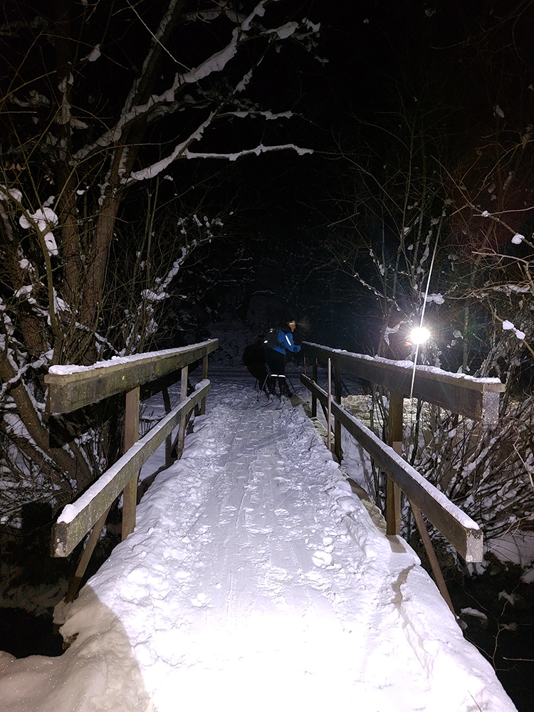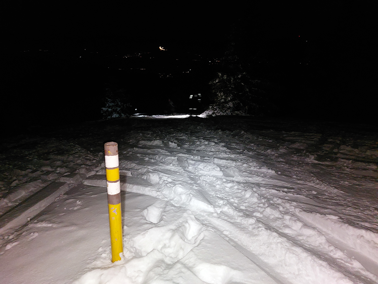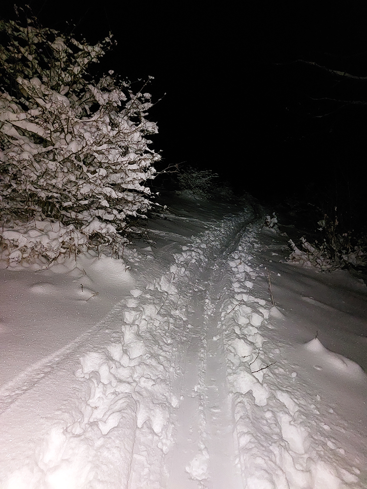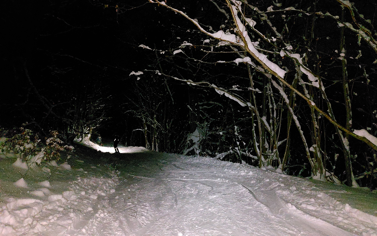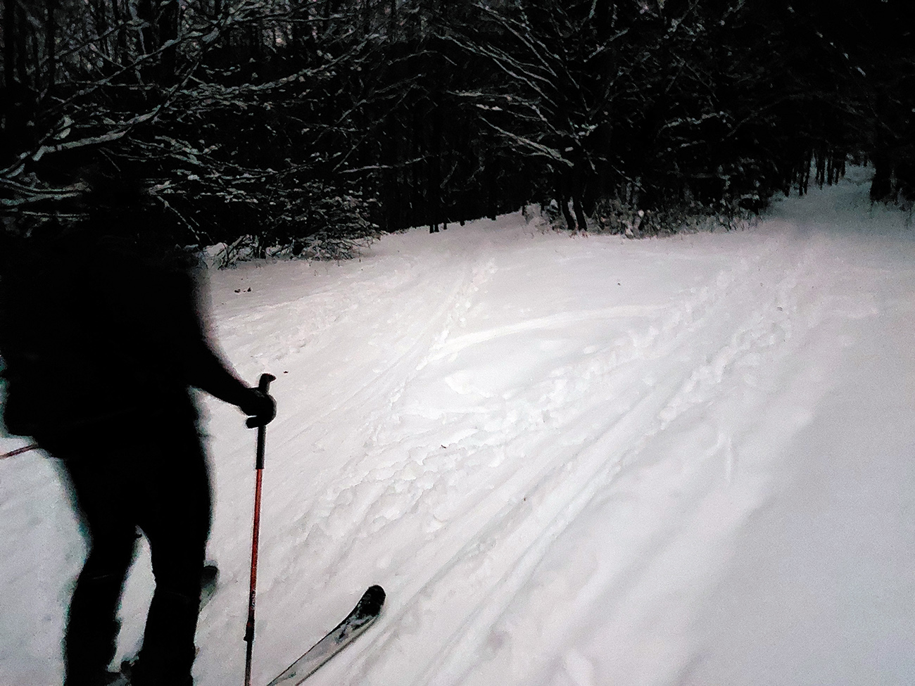 Po zjazdovke dole najlepšie tade, kade sa hore chodí – síce je to rozryté, ale trčí väčšinou tráva a vidno ju, brzdiť sa dá v nahrnutých kopách snehu relatívne bezpečne. Nie je to o oblúkoch, skôr o opatrnom cik – cak schádzaní, ale dá sa. Opatrný musí byť aj skok cez jarok, ale dá sa to obísť:
