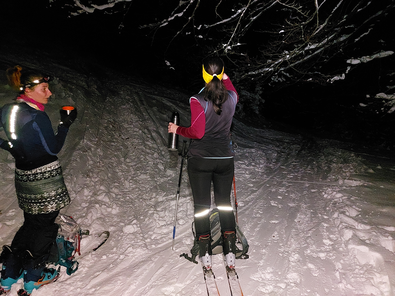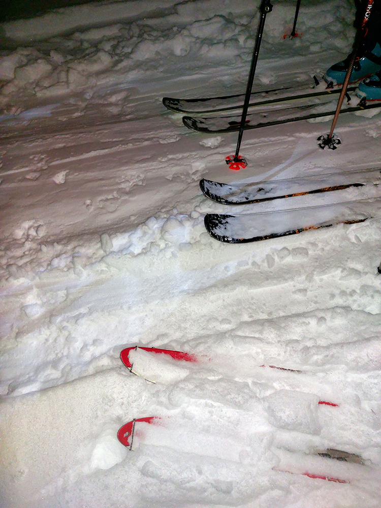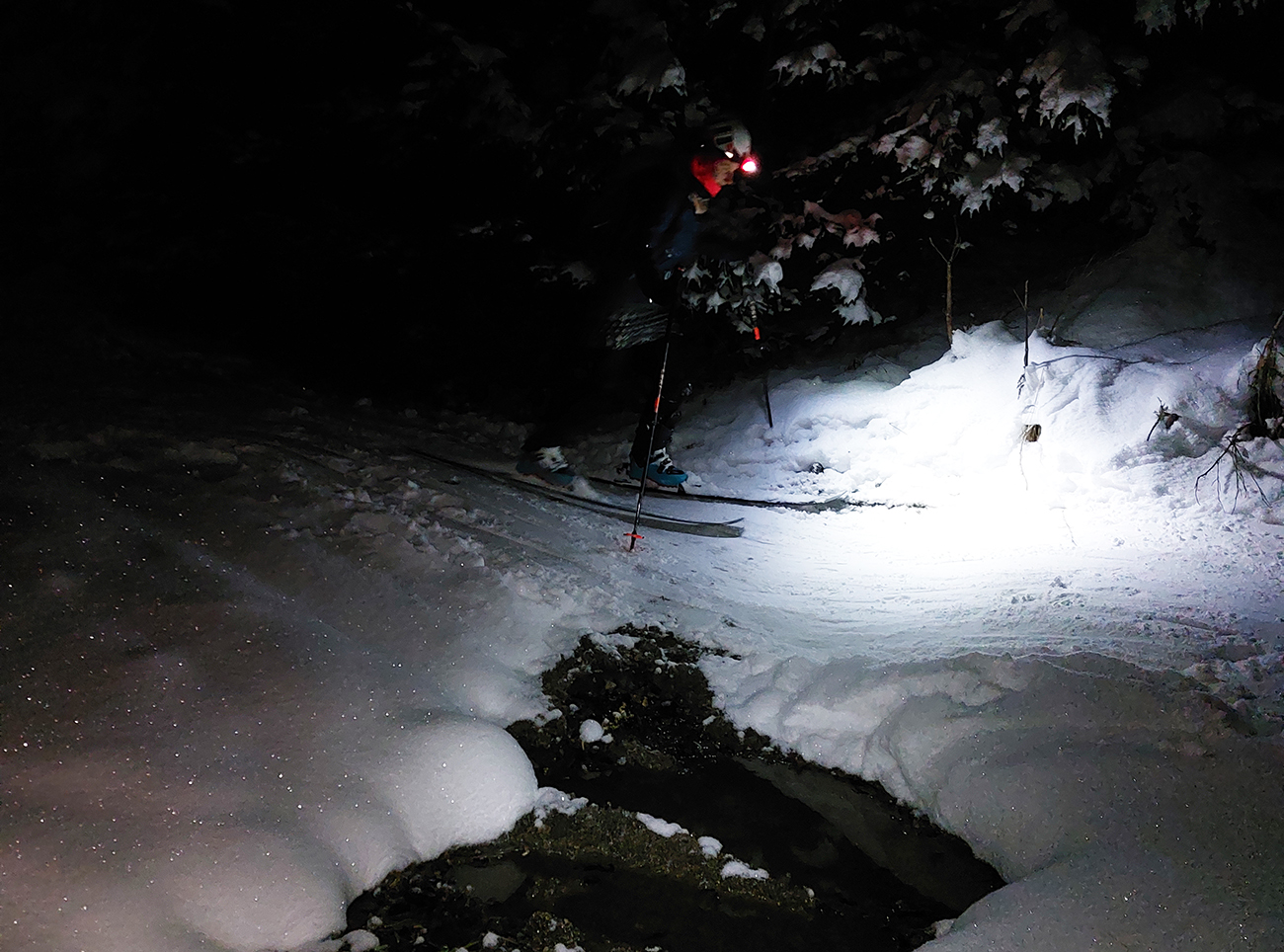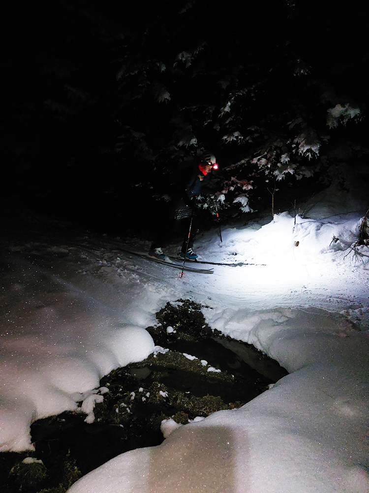 Po zjazdovke dole najlepšie tade, kade sa hore chodí – síce je to rozryté, ale trčí väčšinou tráva a vidno ju, brzdiť sa dá v nahrnutých kopách snehu relatívne bezpečne. Nie je to o oblúkoch, skôr o opatrnom cik – cak schádzaní, ale dá sa. Opatrný musí byť aj skok cez jarok, ale dá sa to obísť: