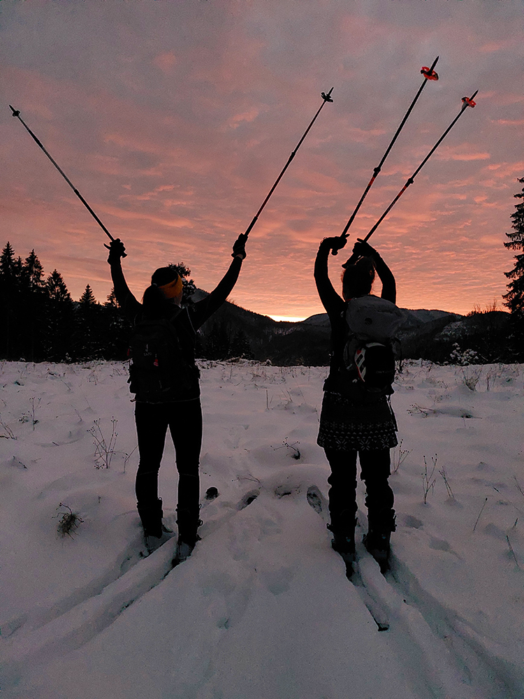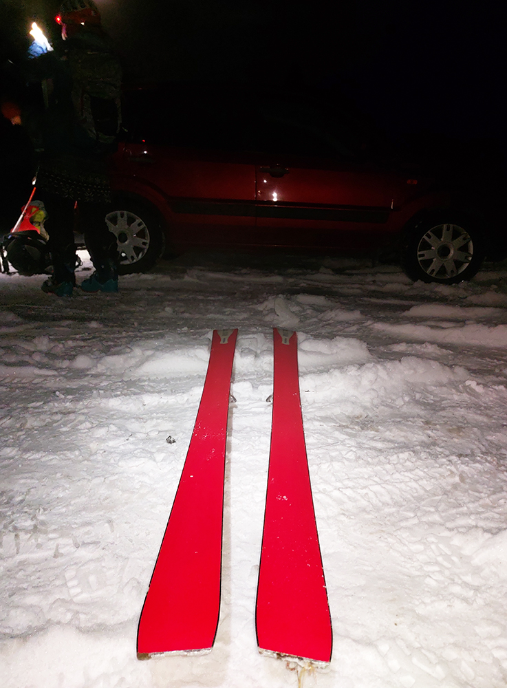 Nooo nasnežilo cez víkend a do ďalšieho ďalekooo, a aj predpoveď nie ktovieaká... Tak kedy má robotný ľud šliapať a aspoň nejaký prach si užívať, ak nie po práci? Takže jeden povoz, štyri telá, tri páry lyží, jeden lopár, ich postupné zbieranie od jedného kraja mesta na druhý, škrípanie zubami (aj v prevodovke) v pravidelnej zápche za Martinom, odbočka v Košťanoch v ústrety predvečerným, ružovým vrcholkom Veľkej Fatry, za chrbtom oranžové svetelné efekty západu slnka a nasúvajúceho sa frontu nad Malou Fatrou, hrkotanie po výtlkoch cez Belú, snehom zarovnané výtlky v Jasenskej doline a zimná rozprávka na parkovisku pri chate Lysec. V pláne klasika: na Lysec a dole, kade všetci chodia: po nefunkčnej zjazdovke, po lúkach, po zvážnici, po zarastených lúkach na Poľku a po hrebeni na vrchol. Dole asi 10 čerstvého, základ žiadny, porýľovanô fest, trávy a hliny poodkrývané v stopách po zjazdových oblúkoch – no čo, zvykáme si na takúto realitu, lepšie už byť nemusí: