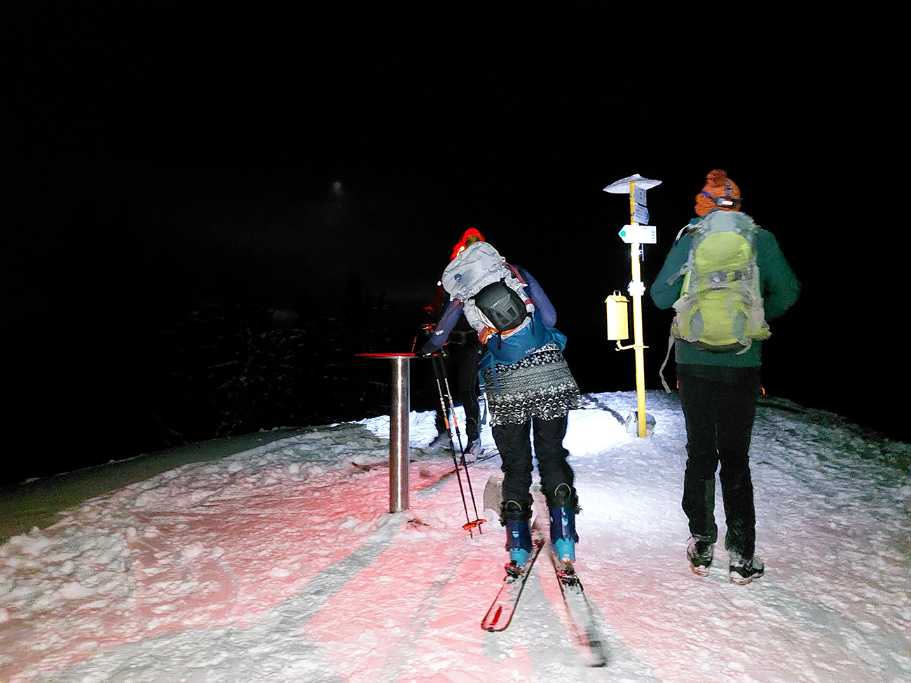 Ale výšľap komfort, nemá zmysel opisovať, skôr to, aké je to smerom dolu. A dolu od vrcholového smerovníka prašanová radosť, lebo krtince síce ledva zakryté, ale viditeľné a obíditeľné, sklon síce mierny, ale prášok jemný, aj si niekto zaujúkal, aj sa dali nájsť nepopísané plochy: