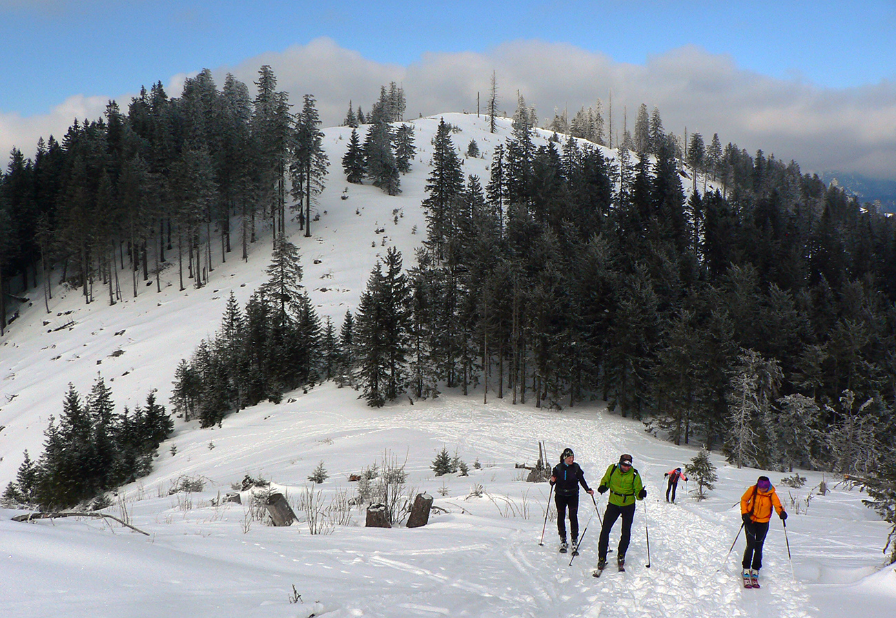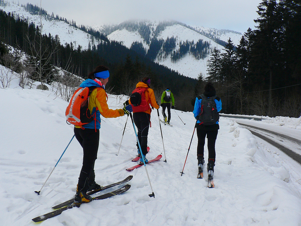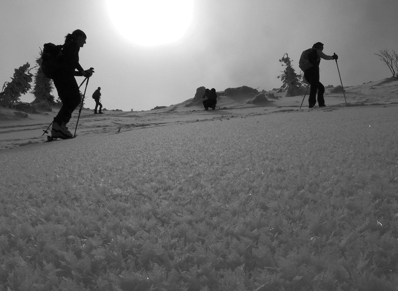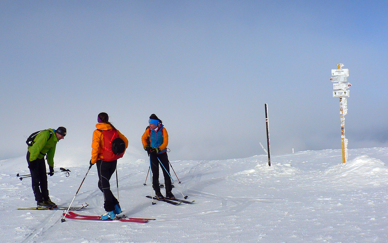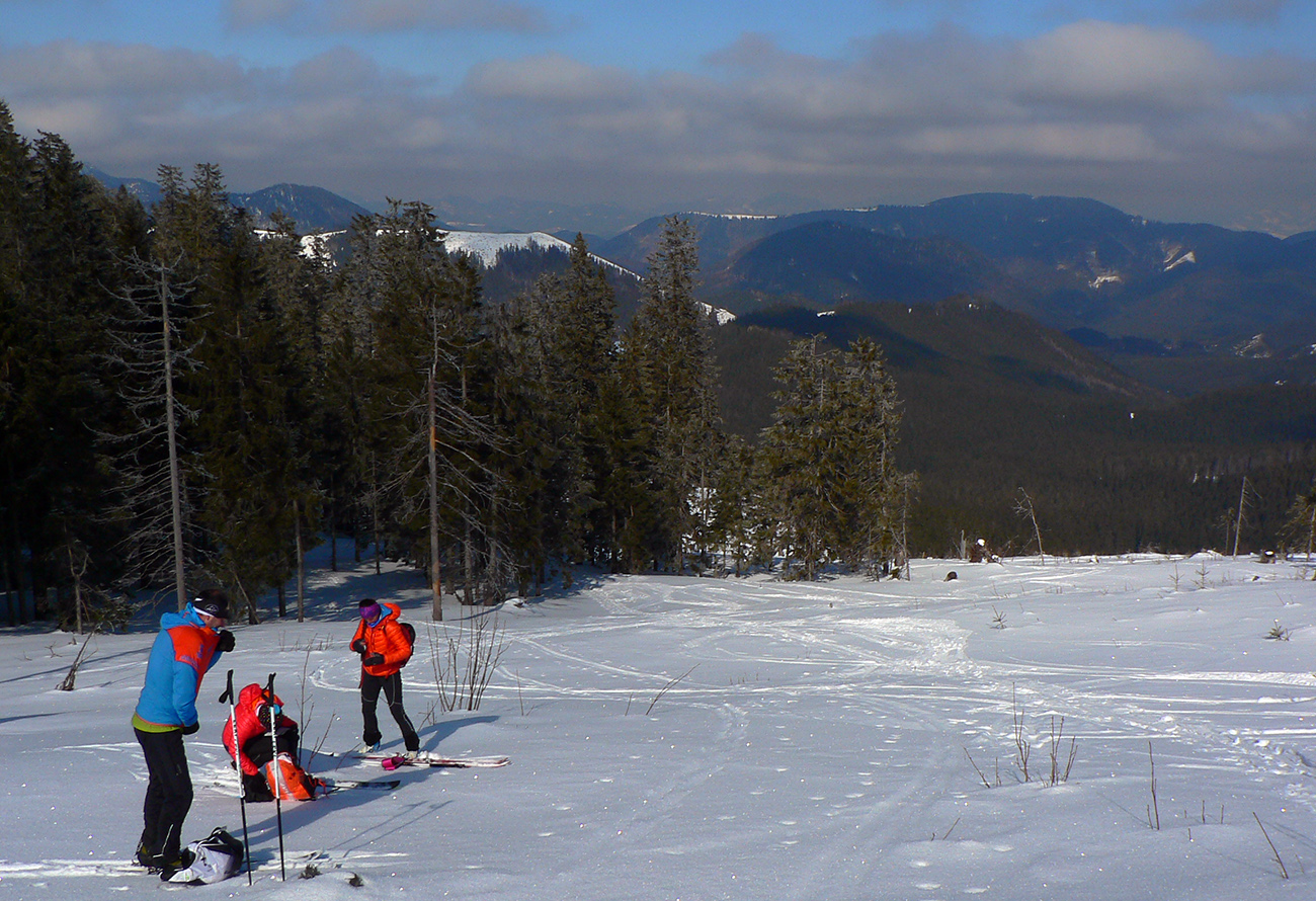 No mali sme byť traja, nakotilo sa nás päť. Na môj samotársky vkus poriadna banda, ale všetko známe firmy, niekedy neuškodí aj takáto „masofka“. Mal som tam byť za sprievodcu, ale známa firma „Majster Z“ sa vyzná lepšie, najmä po kadejakých miestnych zbojníckych chodníčkoch, grúňoch a dolinách. Tak som s radosťou prijal úlohu vzadu sa vlečúceho a miestami z predposledných síl nadbiehajúceho fotoreportéra. Lebo počasie vyšlo na jedna mínus. Jedna preto, lebo aj na hrebeni vládlo bezvetrie, slnko čoraz viac prepaľovalo rednúce mraky a dobré snehy sa dali nájsť ľahko. Mínus preto, lebo nepieklo ani na južných svahoch, slnkom opekaných, v podstate stále bolo mínus a keď už okolo obeda začal prašanček na tých juhoch trošíčka naznačovať, že by snáď mohol aj lepiť, zdrhli sme definitívne do severov.